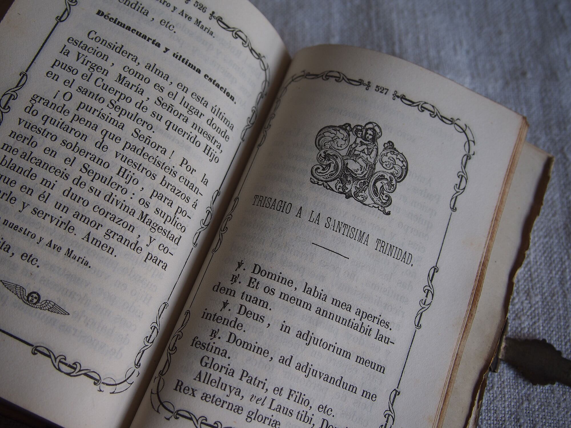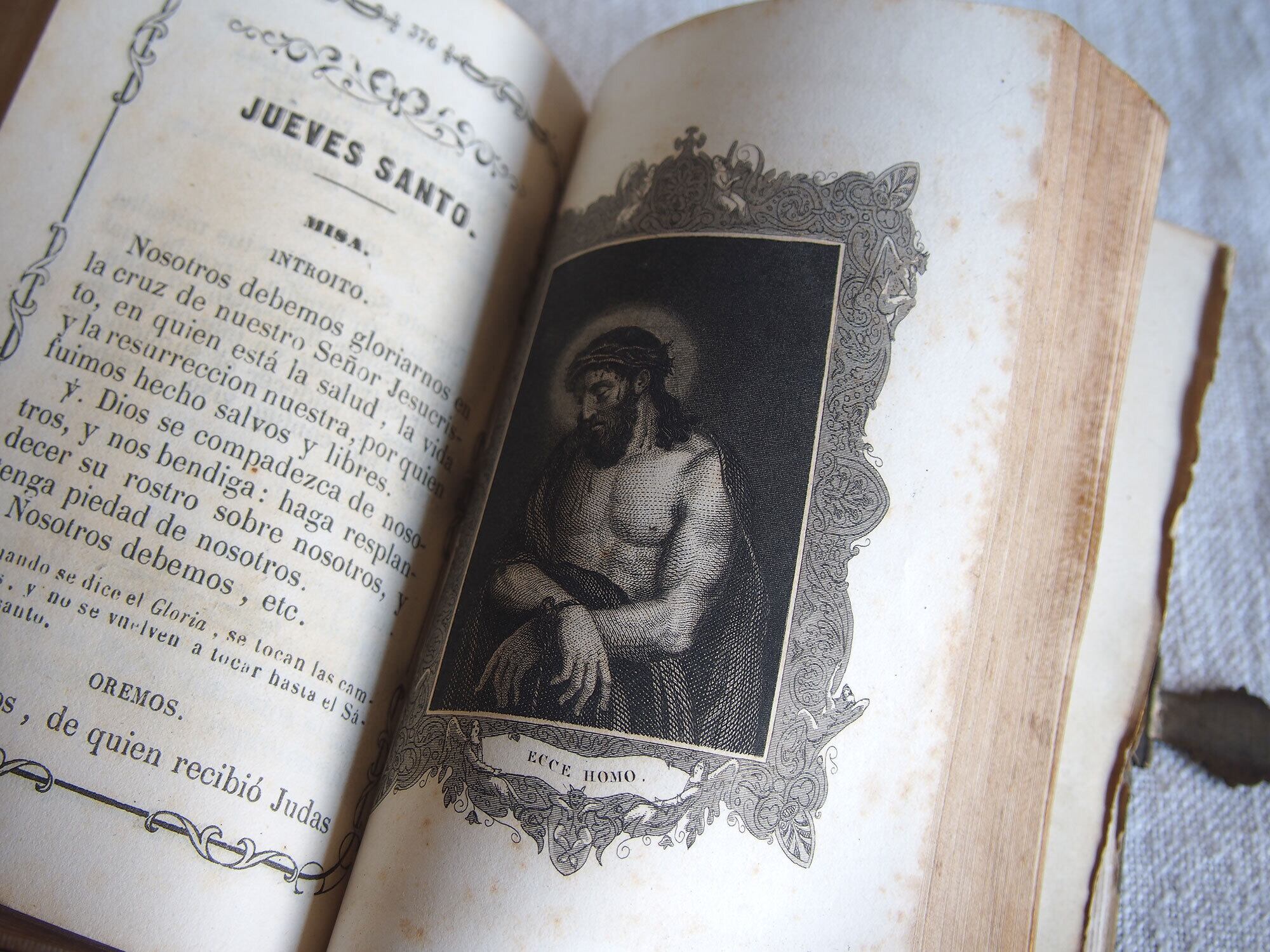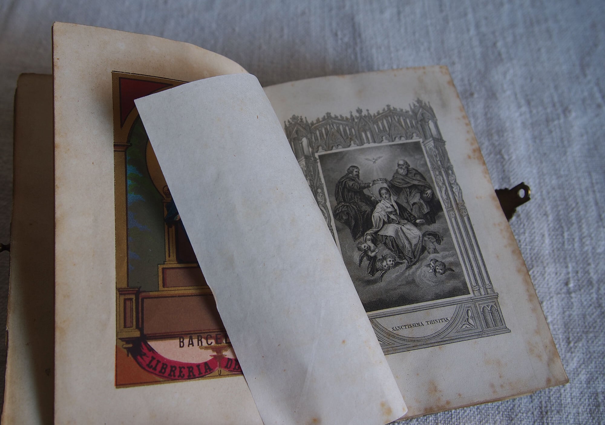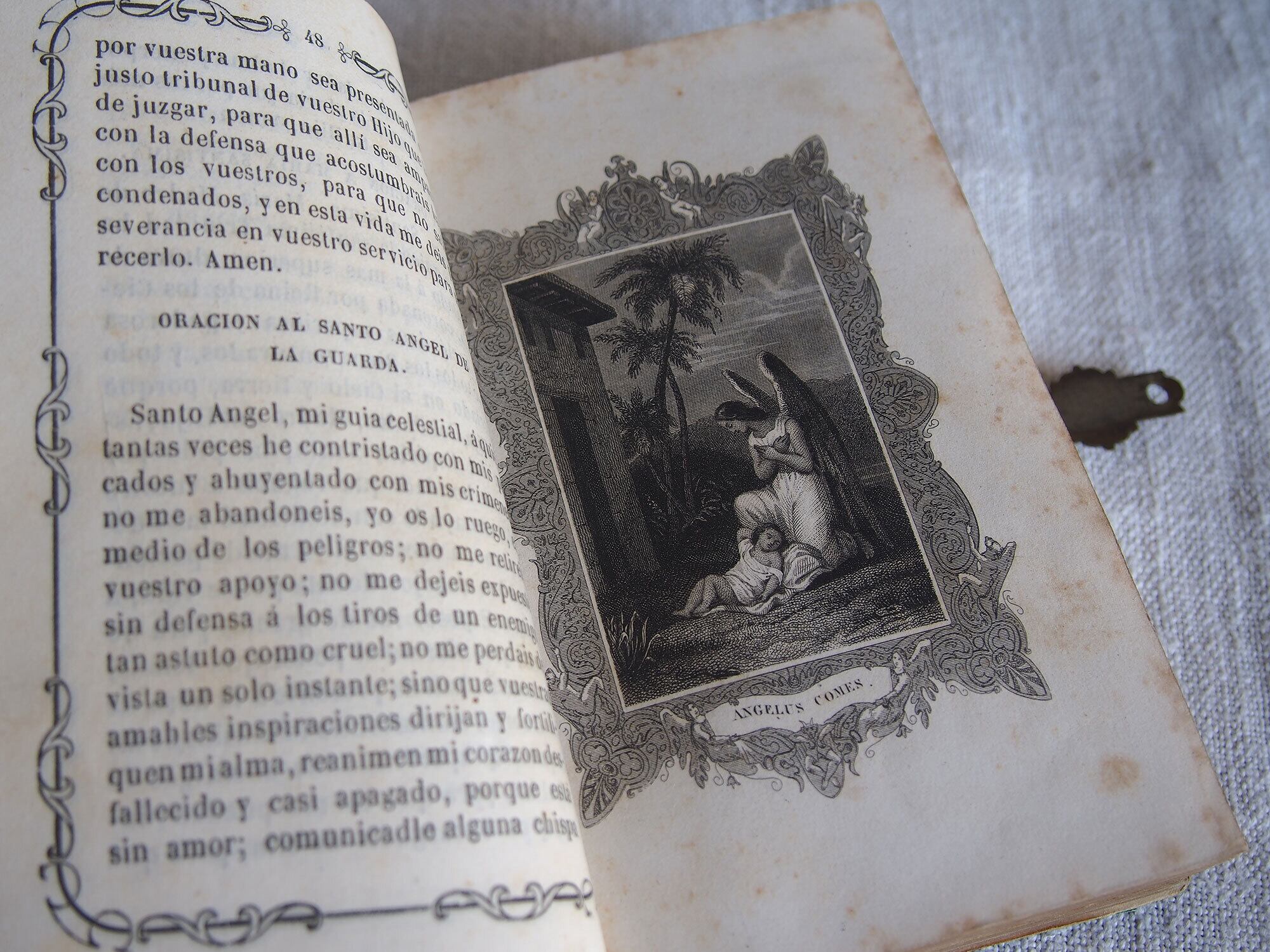 カトリック関連の古い本。表紙は樹脂に貝や金属のモチーフを埋め込んであります。El Diamante de la Religin/宗教のダイヤモンド、1862年刊。100年以上も前の古い本です、中央の銀色のモチーフは、カトリックの象徴を組み合わせた図像です。十字架:キリストの受難、錨:希望、燃える心臓:キリストの聖心・愛、円形中央のモノグラム(IHS) :イエス・キリストの名。経年による置きシミなどあります。全ページを確認していません、書き込みなどあるかもしれません。挟まっていたカードも付属します。置いておくだけで存在感のある古い本です。