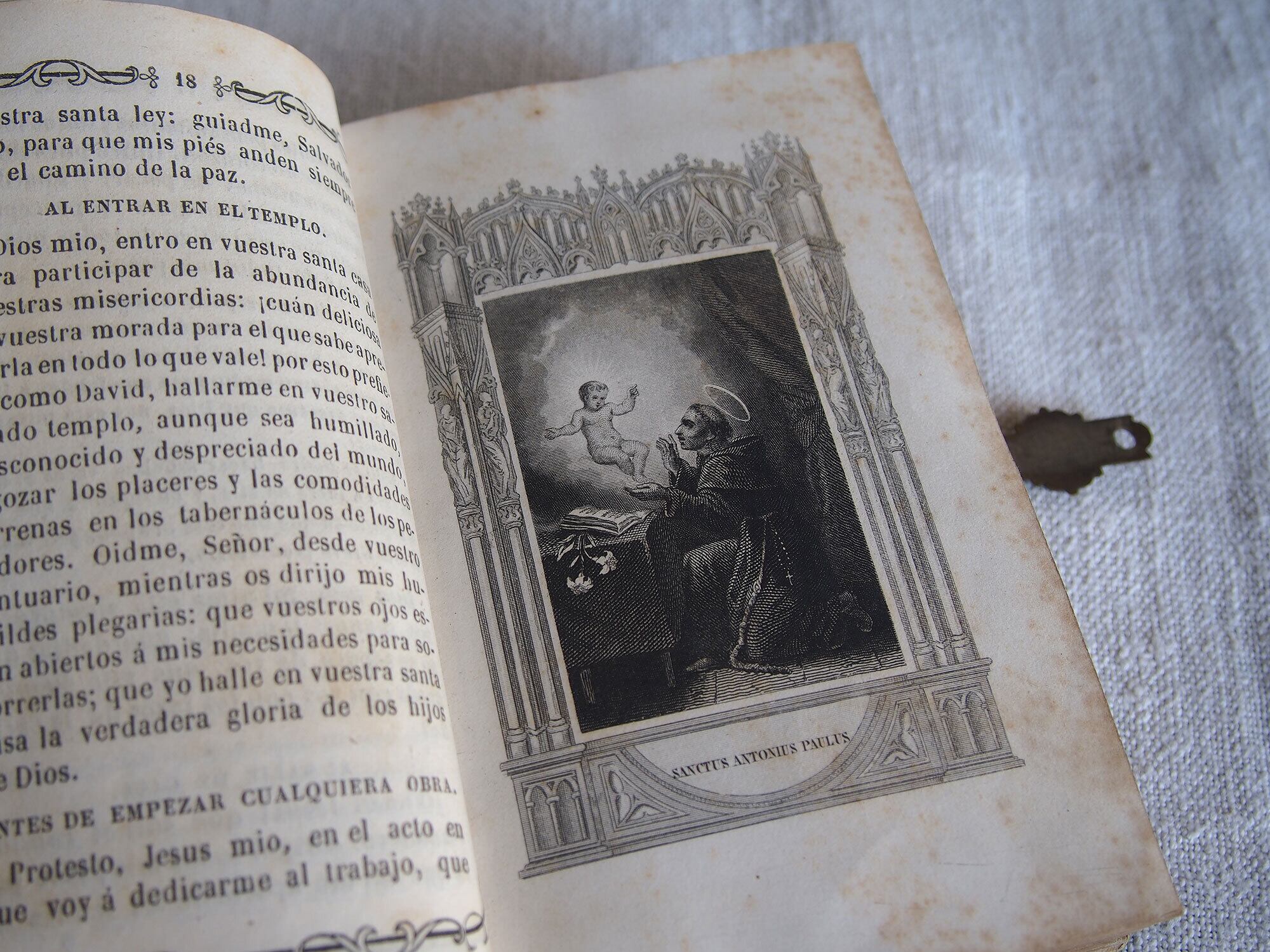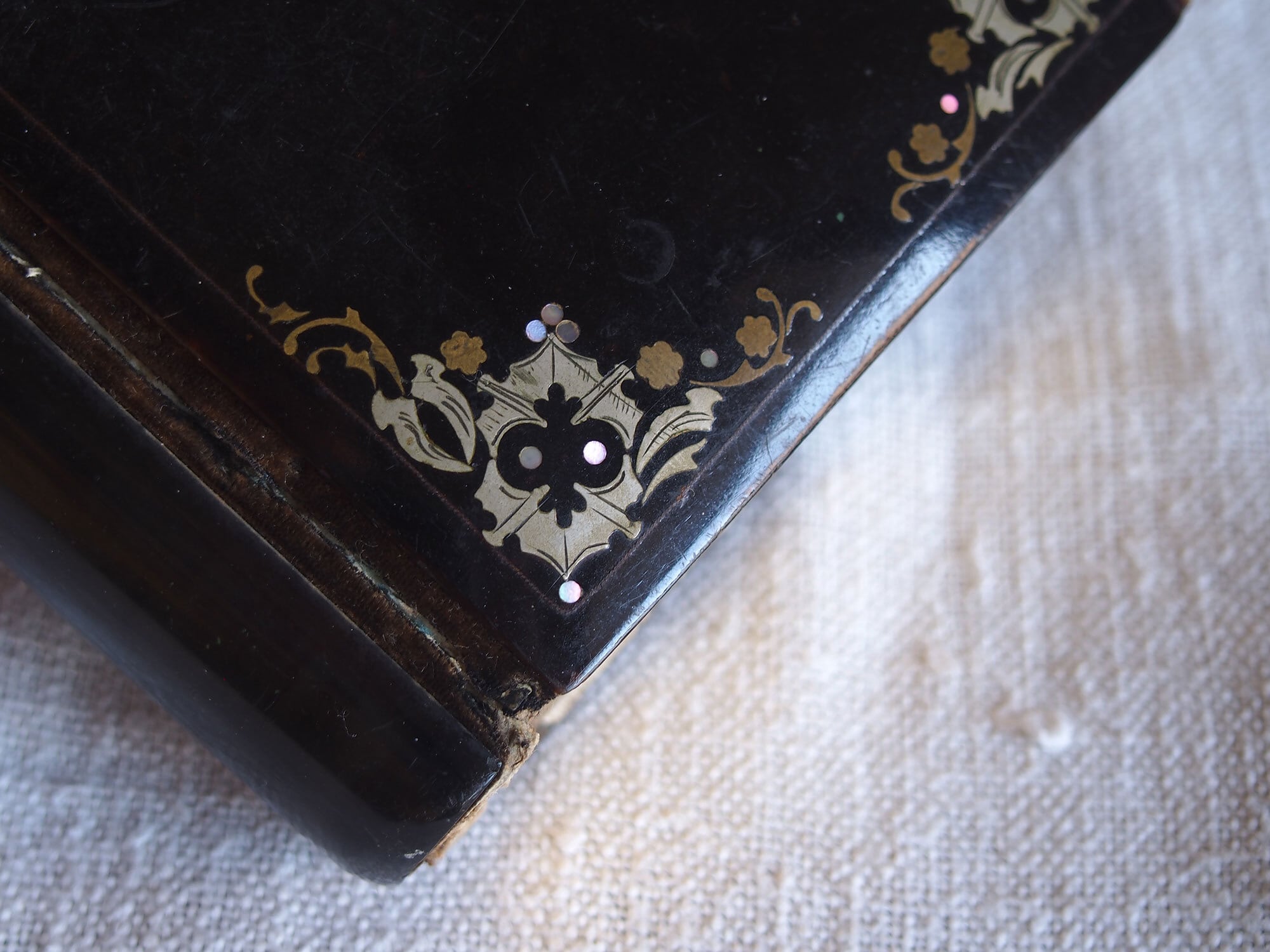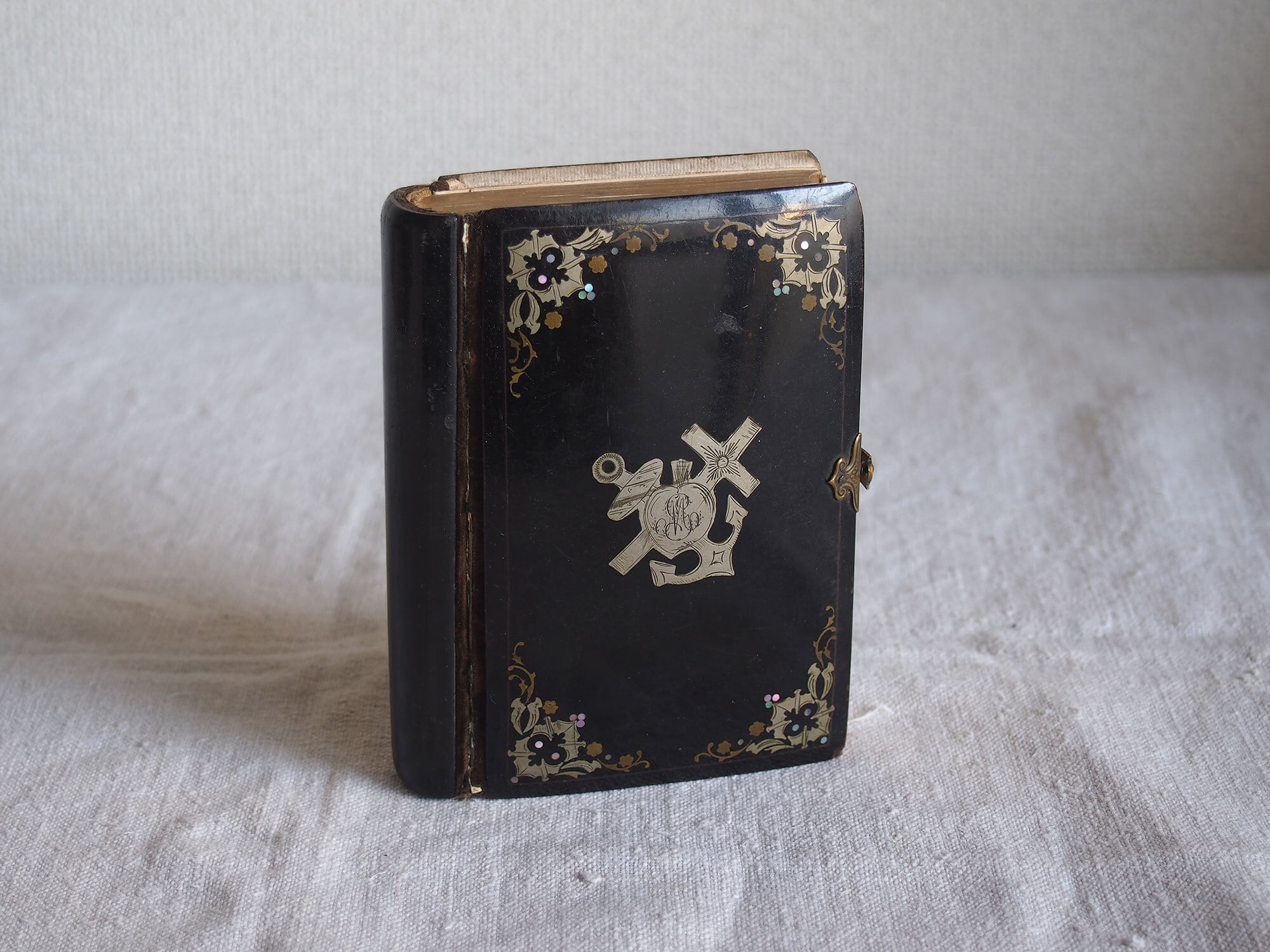 ミサ典礼書 白蝶貝象嵌と金彩装飾の古い本 留め金付きのカトリック祈祷書 キリスト ヨーロッパ アンティーク/K370