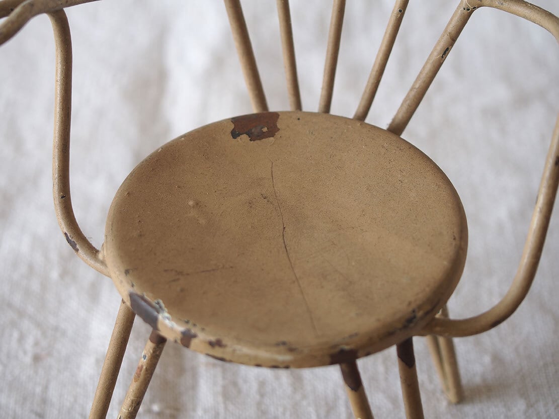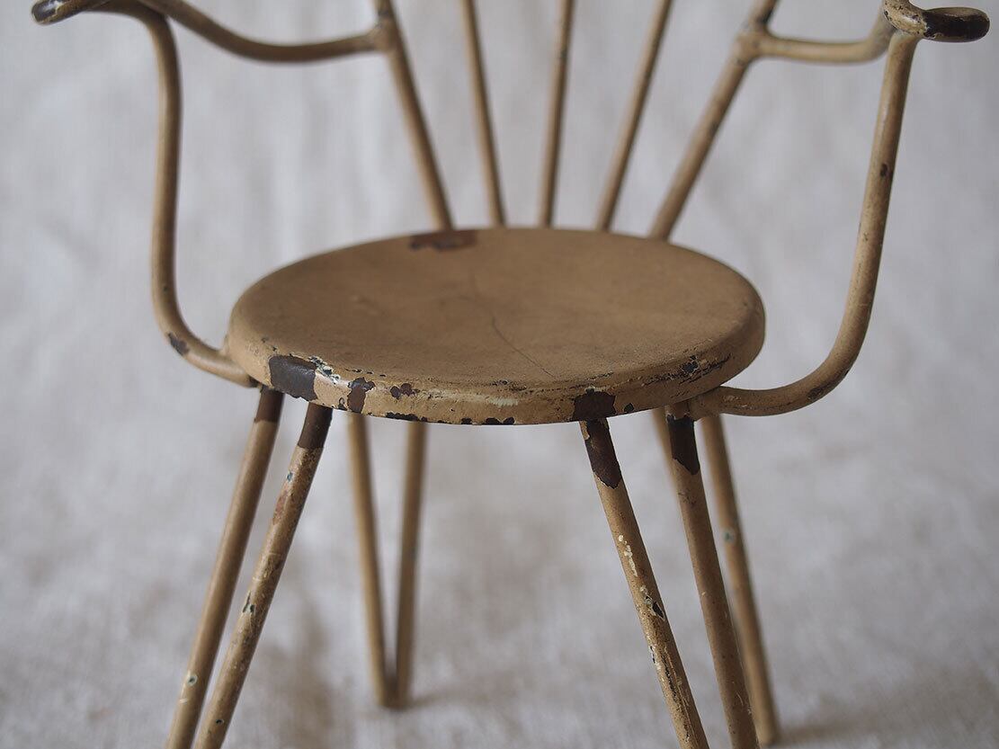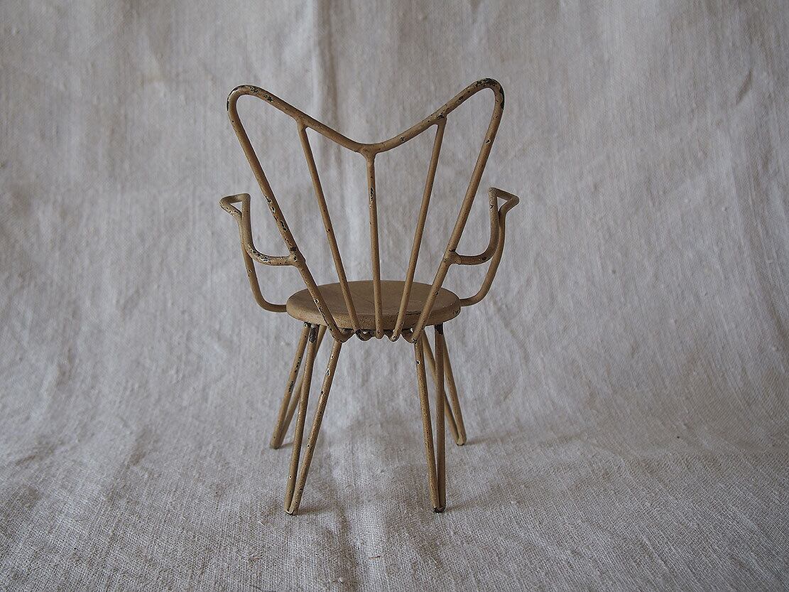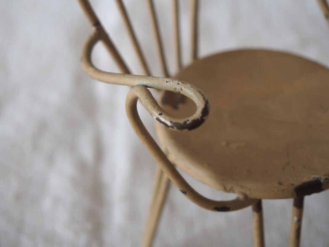 ヨーロッパのアンティーク市にて入手。ワイヤー製のミニチュアチェア、1950年代ぐらい?。表面には経年によるペイントの剥がれや小さな錆びが見られます。ドールハウスや撮影用小物、アンティークやブロカントテイストのインテリアのアクセントとしてどうぞ。