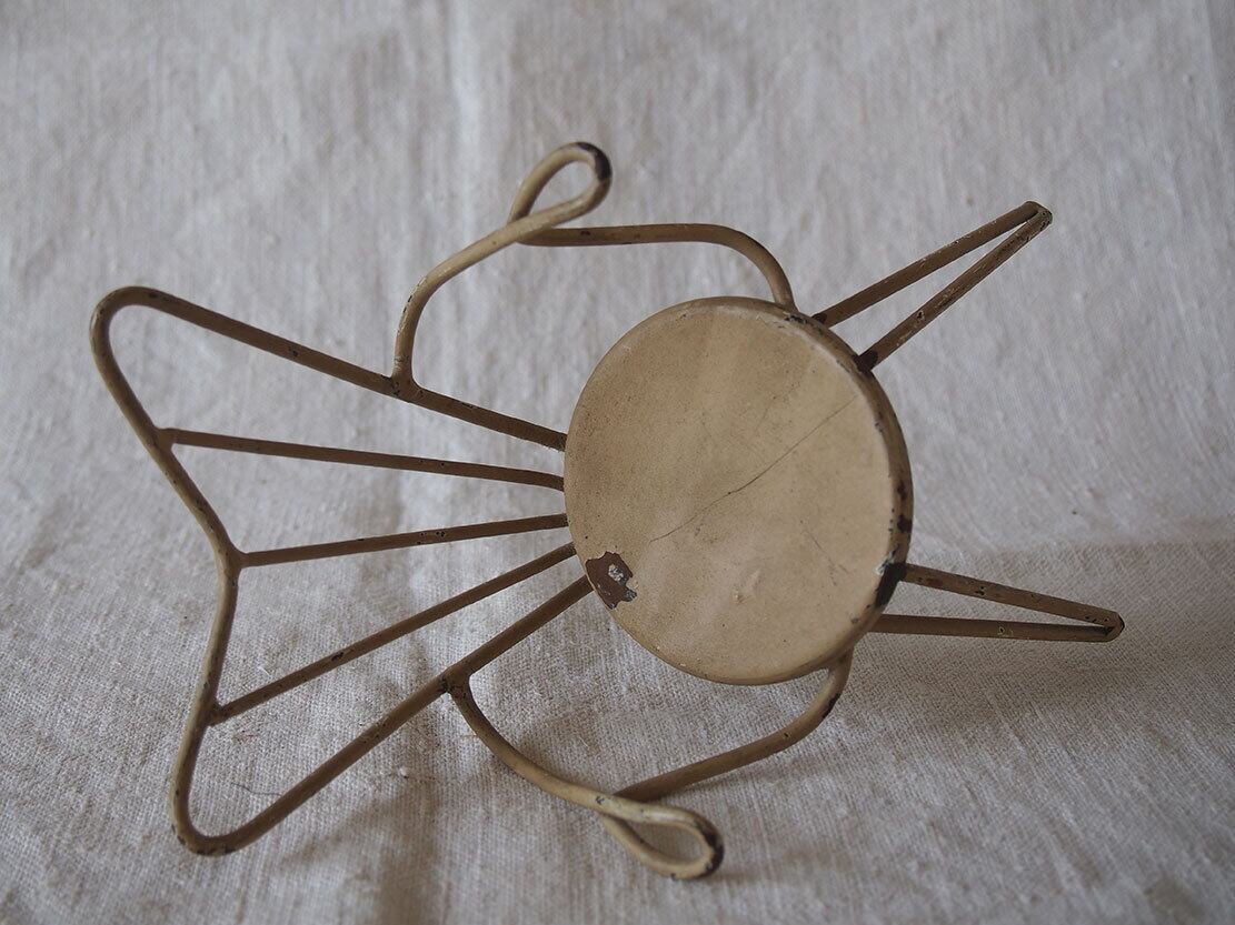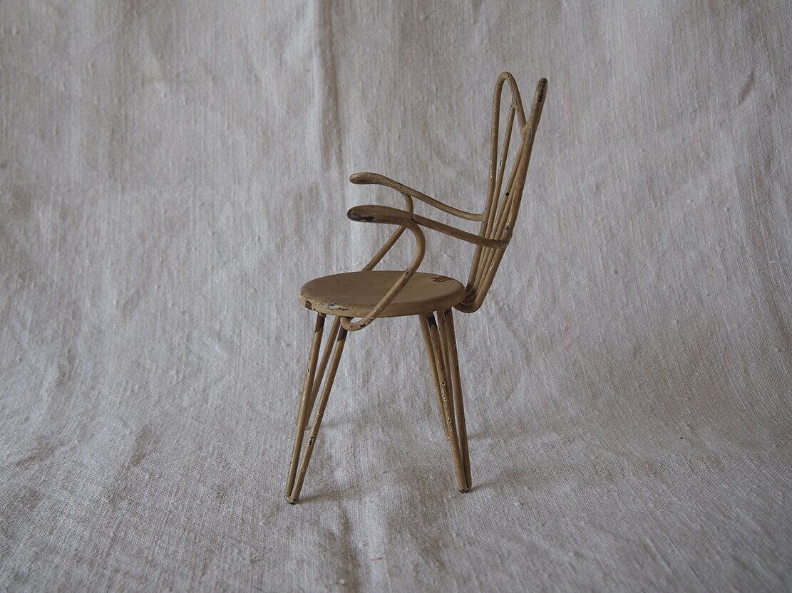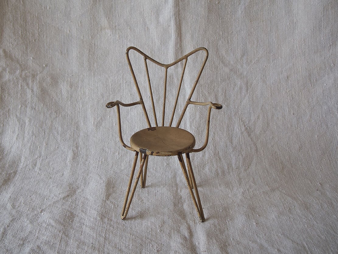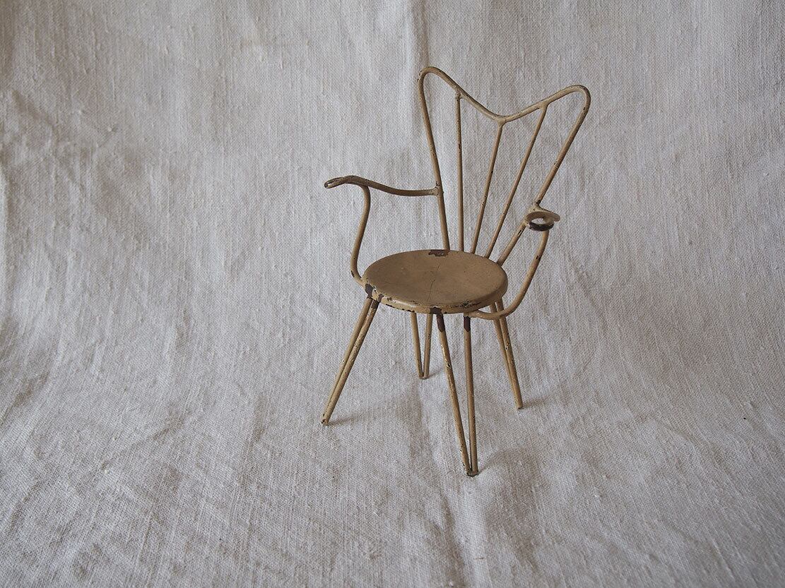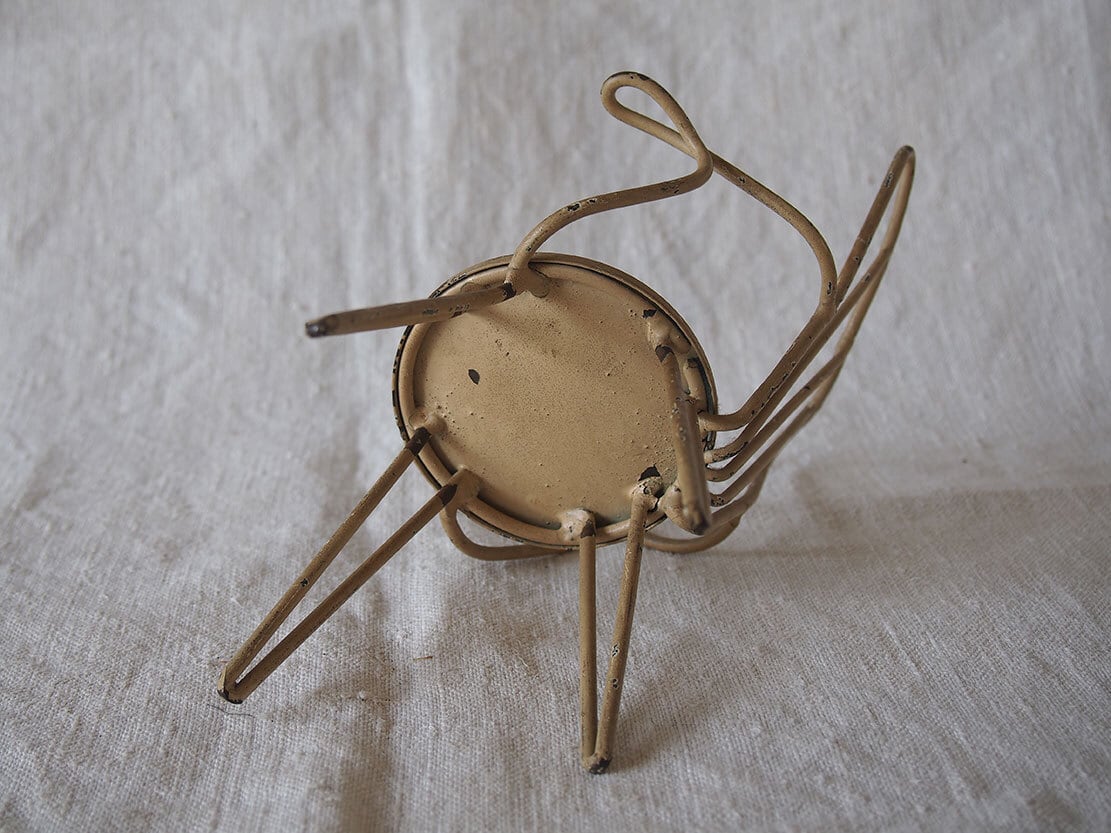 ヨーロッパのアンティーク市にて入手。ワイヤー製のミニチュアチェア、1950年代ぐらい?。表面には経年によるペイントの剥がれや小さな錆びが見られます。ドールハウスや撮影用小物、アンティークやブロカントテイストのインテリアのアクセントとしてどうぞ。