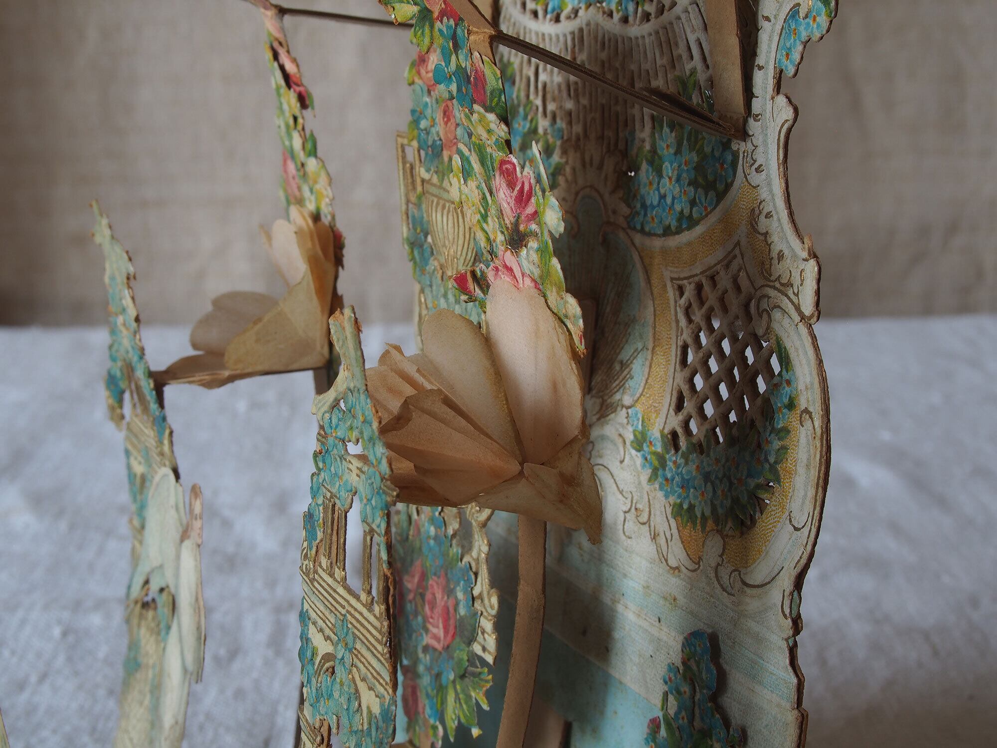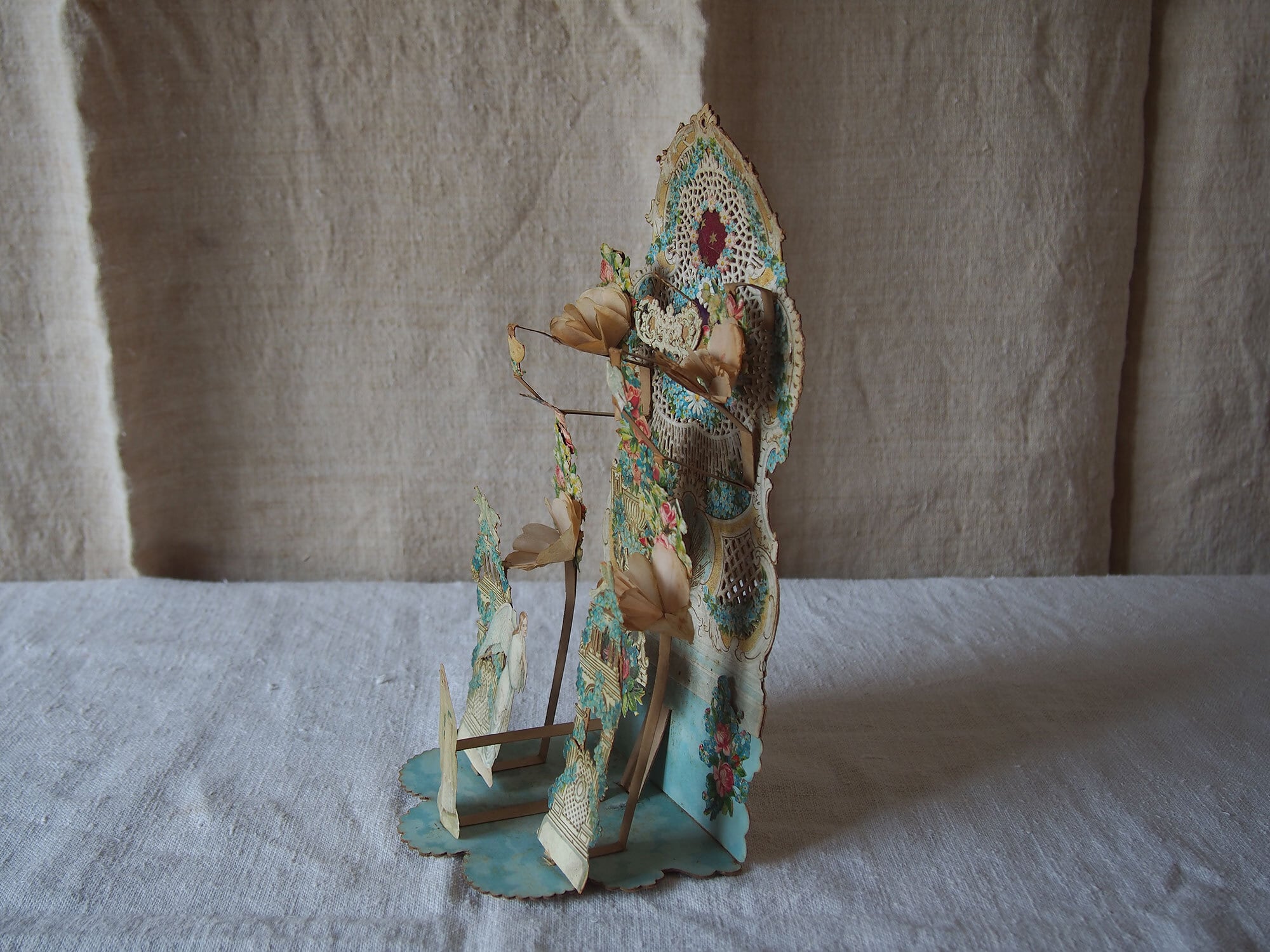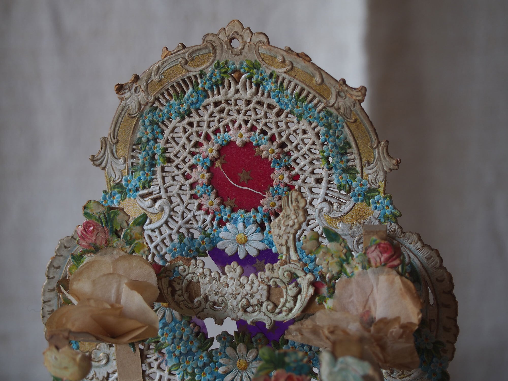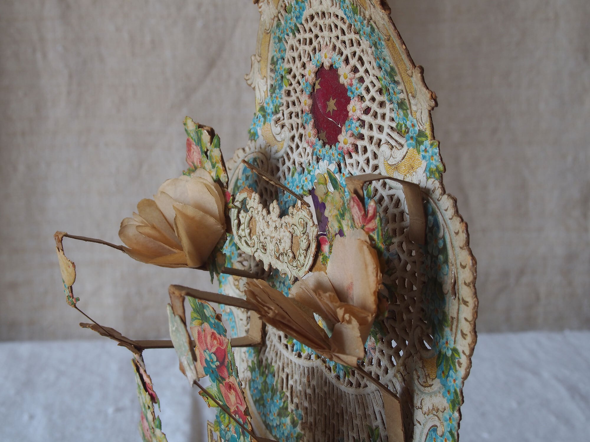 ヨーロッパの蚤の市で入手。おおよそ1890年〜1910年頃。クロモリトグラフ印刷による美しい色彩の紙パーツを、複数層に重ねて立体的に構成した、非常に繊細で装飾性の高い古い物です。紙製のため、経年による色褪せ、縁の擦れ、花部分の折れや変形などが見られます。上部に赤と紫のセルロイドのようなパーツがありますが、どちらもダメージあります。