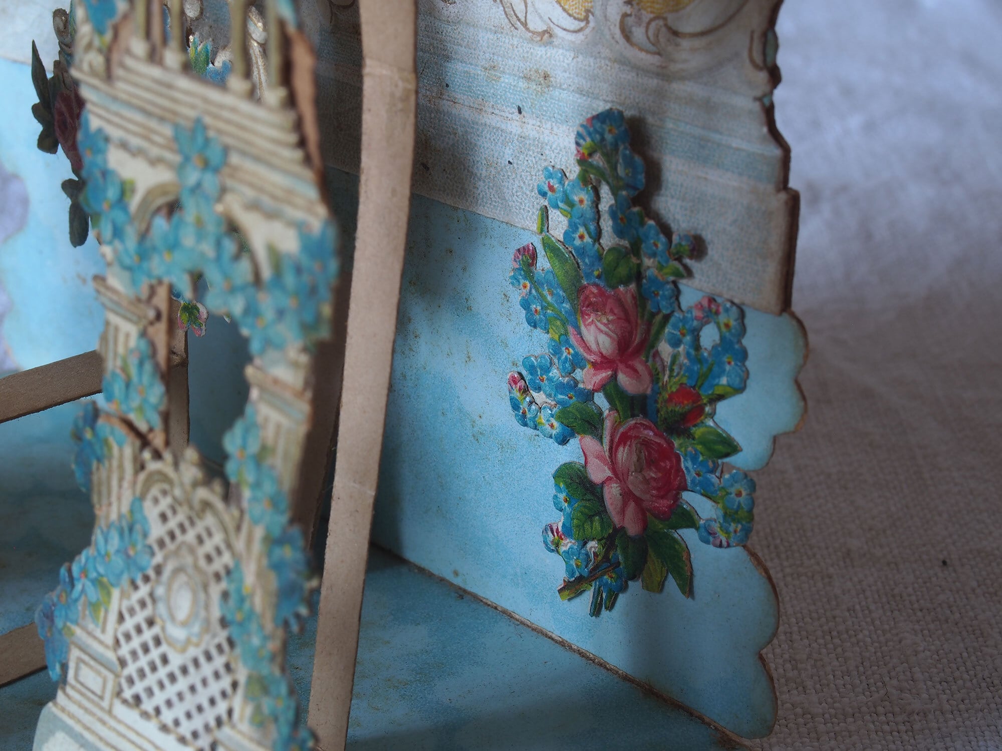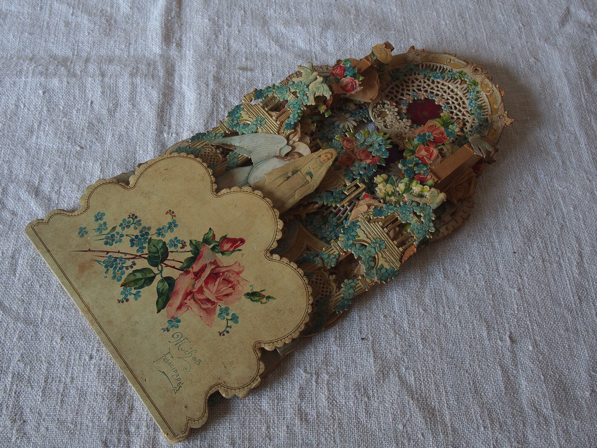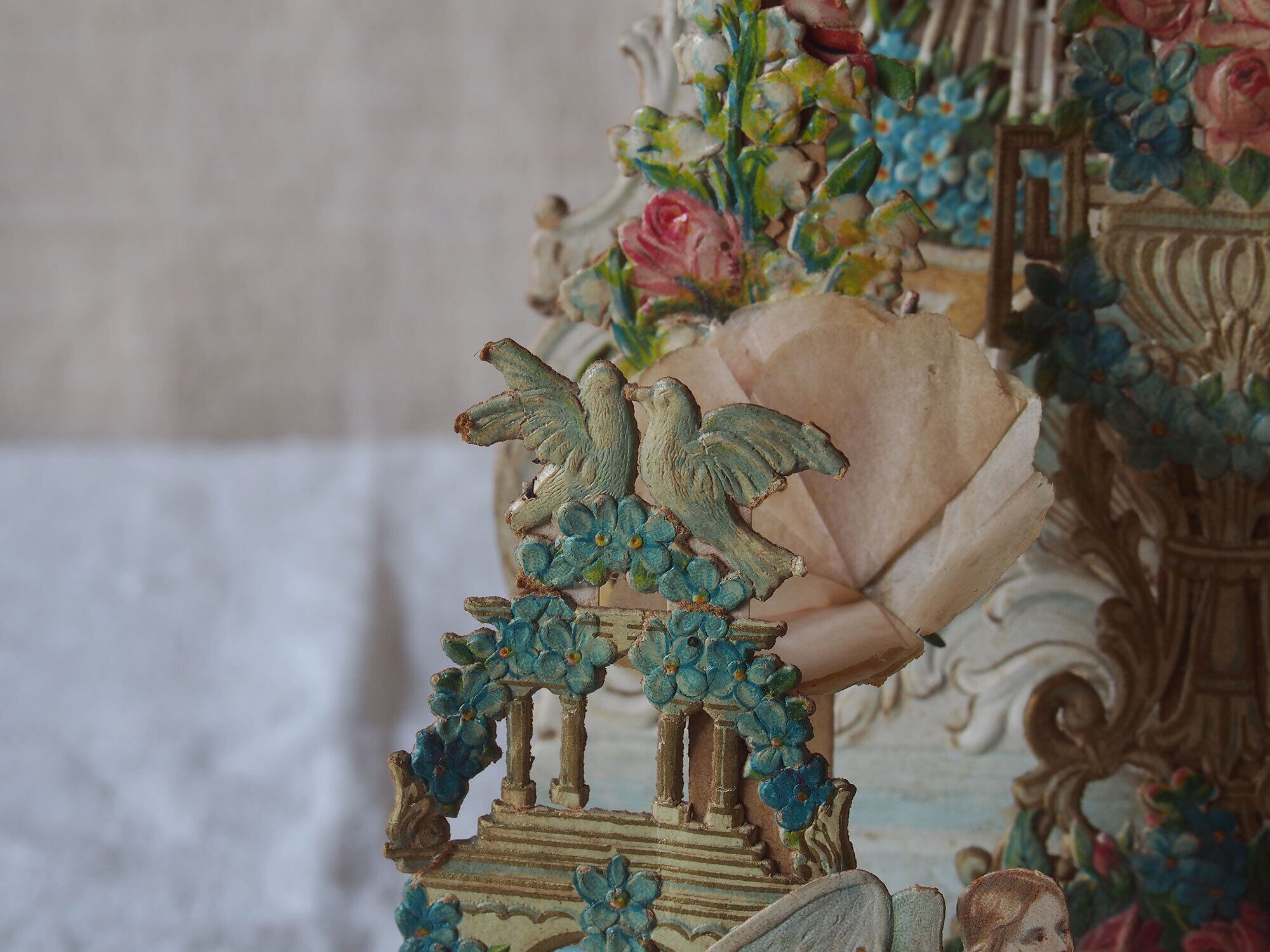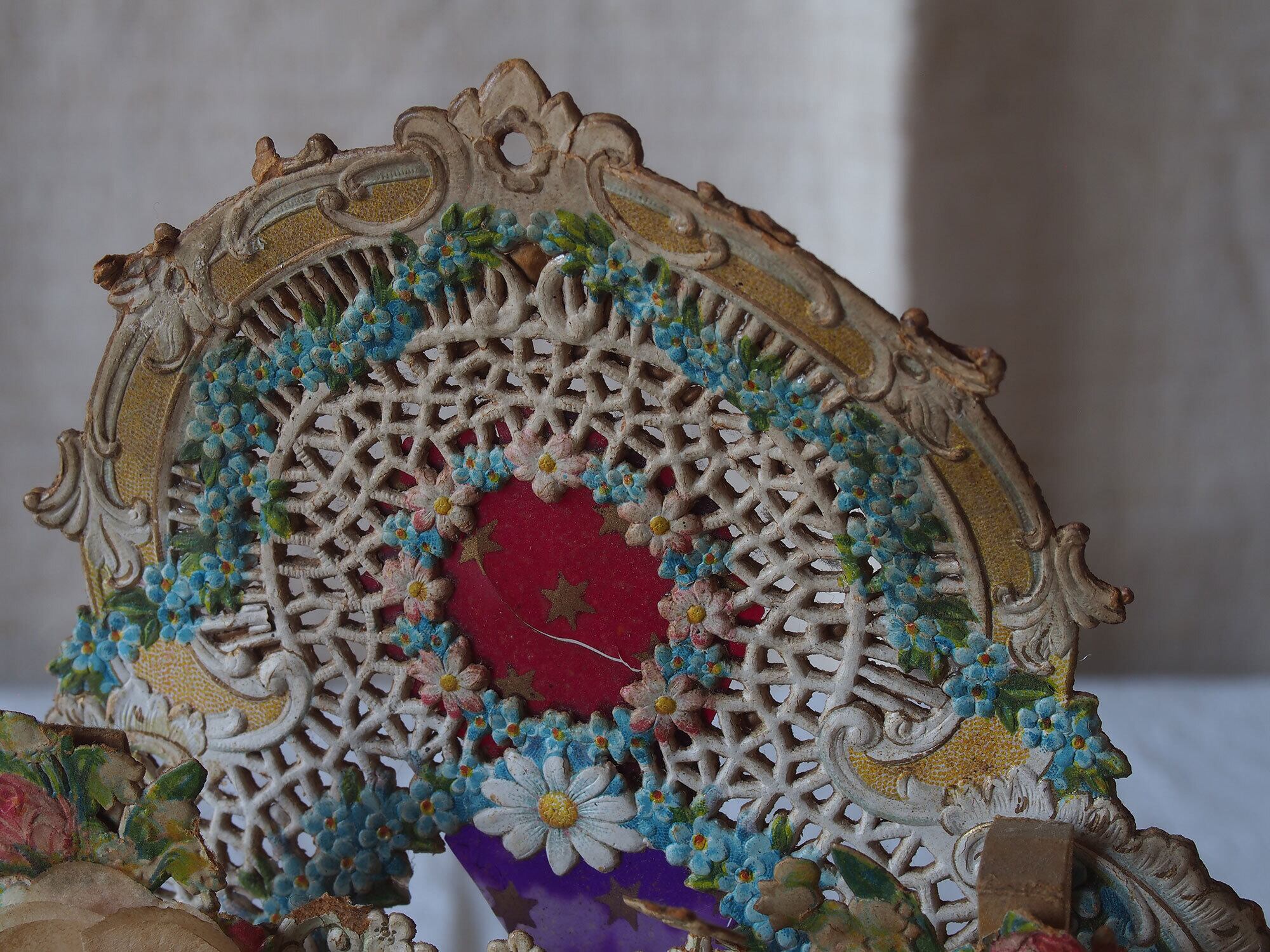 ヨーロッパの蚤の市で入手。おおよそ1890年〜1910年頃。クロモリトグラフ印刷による美しい色彩の紙パーツを、複数層に重ねて立体的に構成した、非常に繊細で装飾性の高い古い物です。紙製のため、経年による色褪せ、縁の擦れ、花部分の折れや変形などが見られます。上部に赤と紫のセルロイドのようなパーツがありますが、どちらもダメージあります。