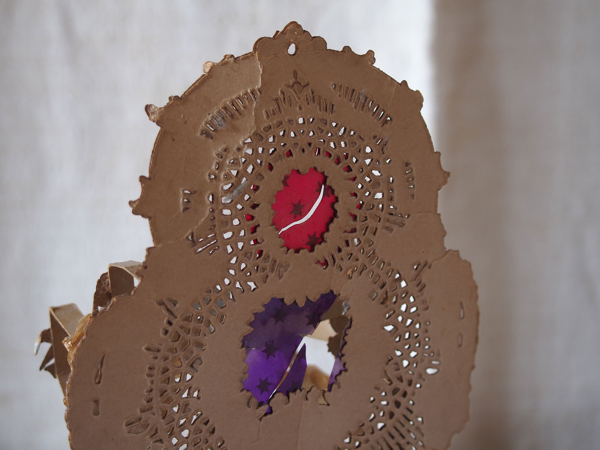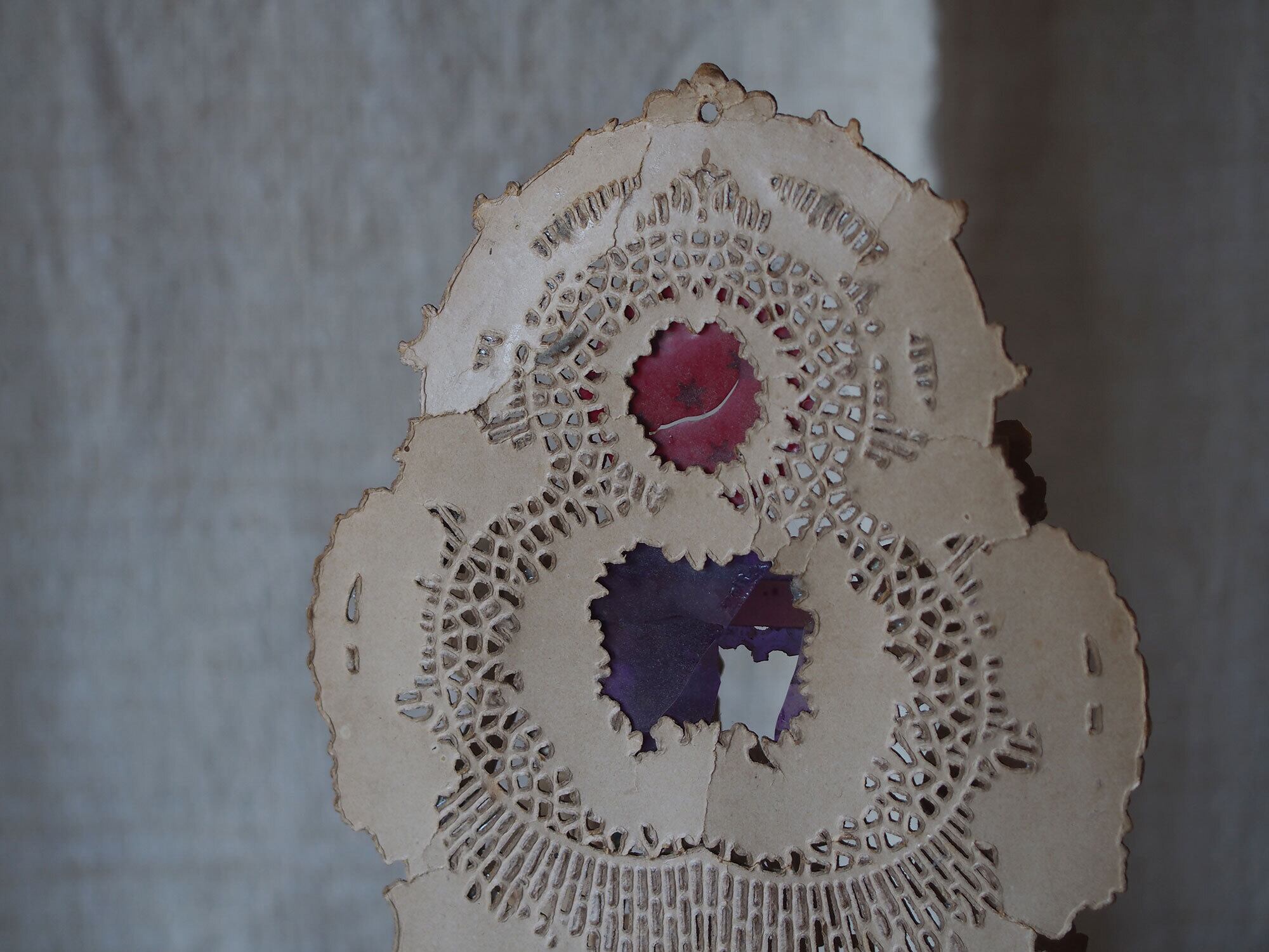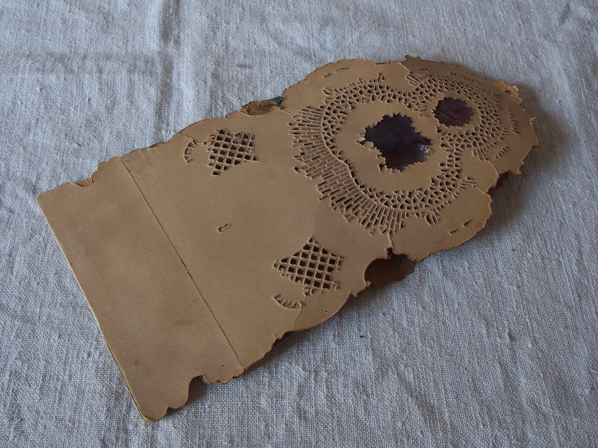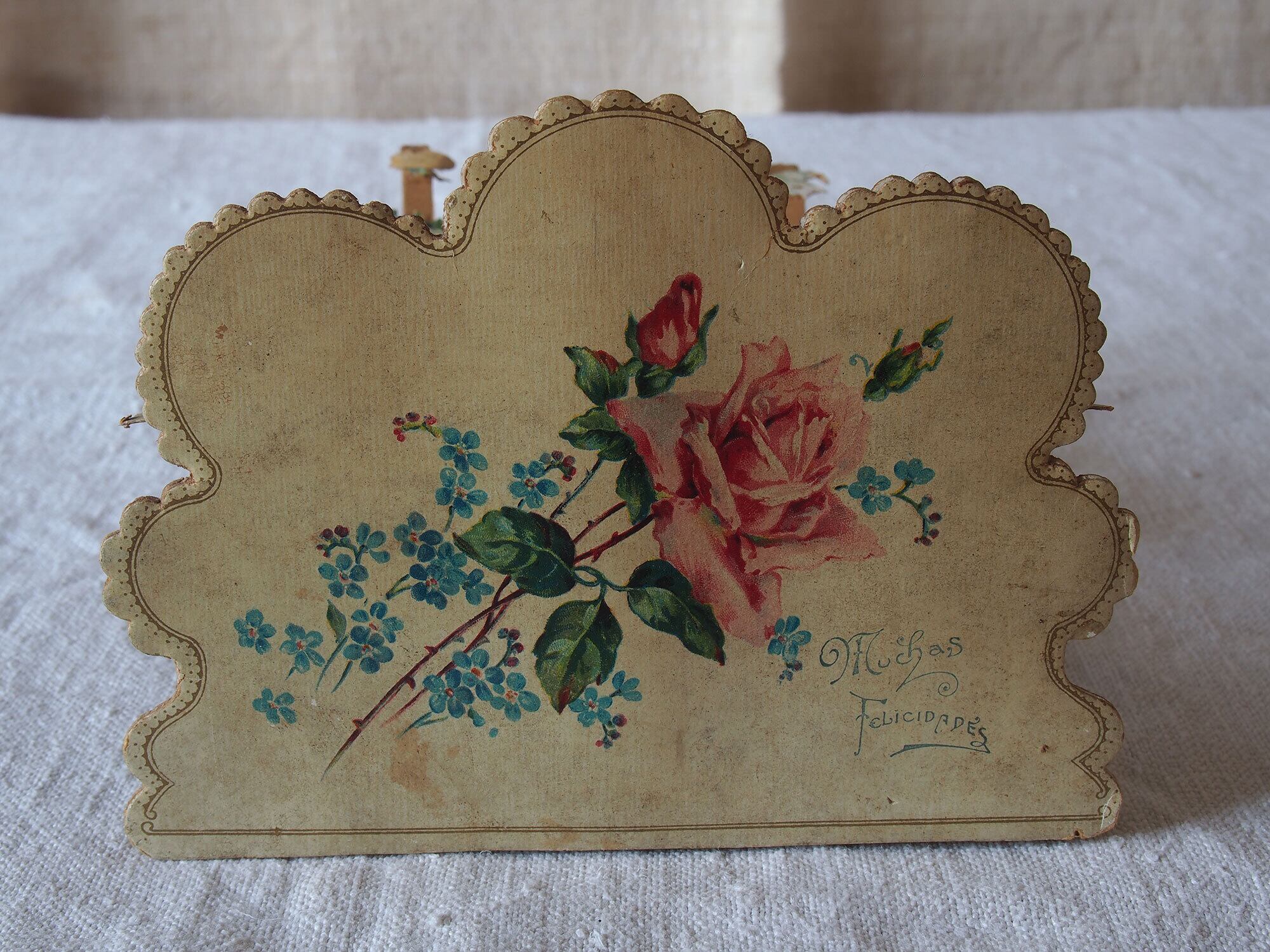 ヨーロッパの蚤の市で入手。おおよそ1890年〜1910年頃。クロモリトグラフ印刷による美しい色彩の紙パーツを、複数層に重ねて立体的に構成した、非常に繊細で装飾性の高い古い物です。紙製のため、経年による色褪せ、縁の擦れ、花部分の折れや変形などが見られます。上部に赤と紫のセルロイドのようなパーツがありますが、どちらもダメージあります。