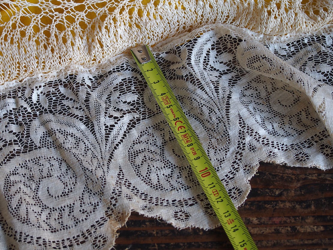 南欧のアンティーク市にて入手。ニッティングレースとマシンレースのベッドカバー。上部の始末を見ると、もしかしたら制作途中だったのかもしれません。ご覧のように数箇所に糸の切れ、解け、裏地の痛みがあります、目立つ箇所は写真でご確認いただけます。洗濯済です。詳細は写真でご覧いただけます。ご家庭の洗濯機で洗うことができます。間仕切りやカーテンとして利用するのもよいでしょう。伸縮性がある素材の為、多少の寸法の誤差があると思いますが予めご了承ください。参考資料、リメイクなどにもどうぞ。ファブリック、衣装、手芸関連を得意としております。他の商品も是非ご覧下さい。
