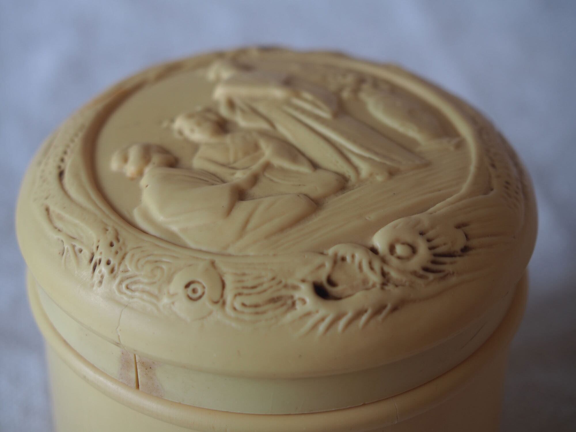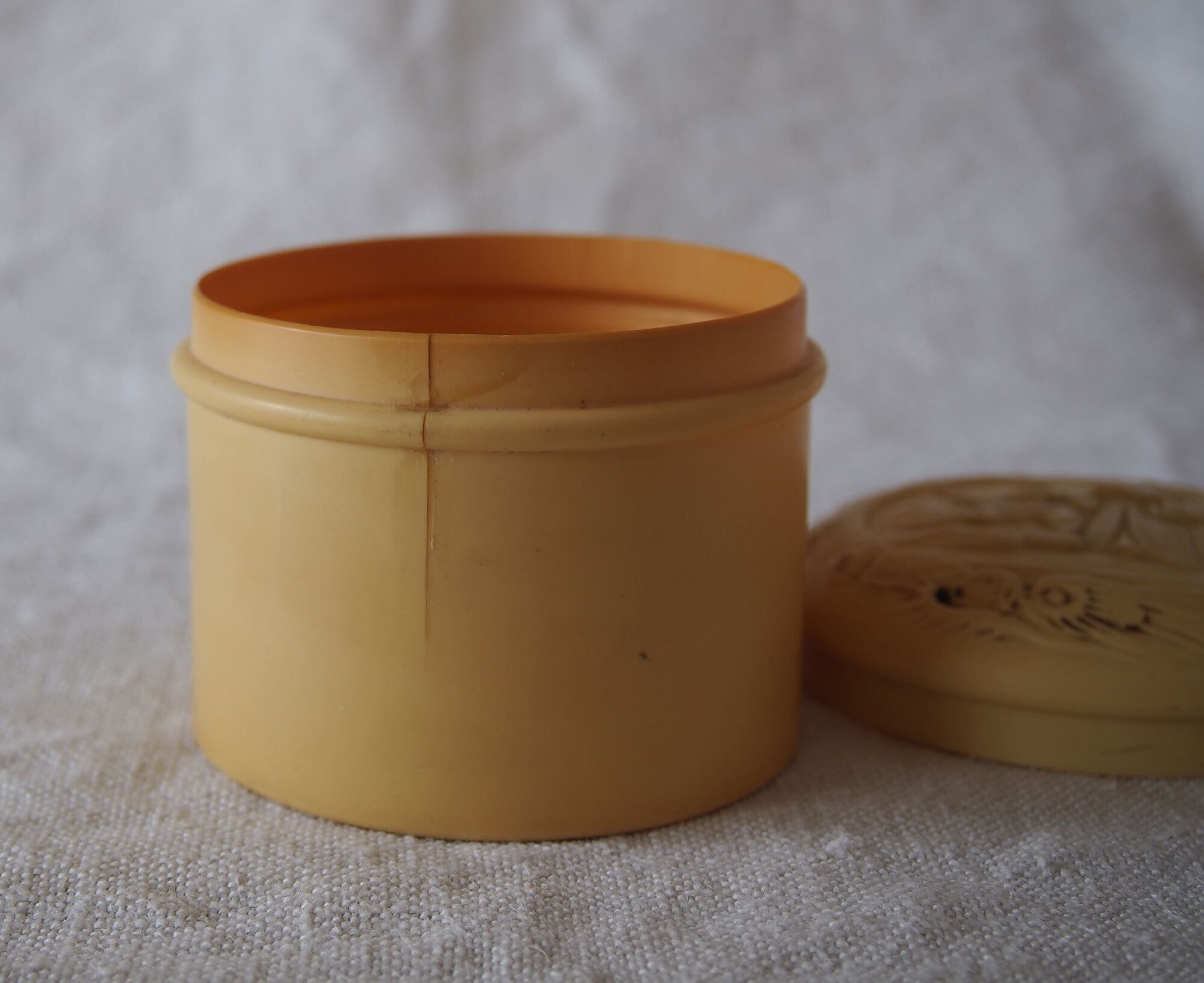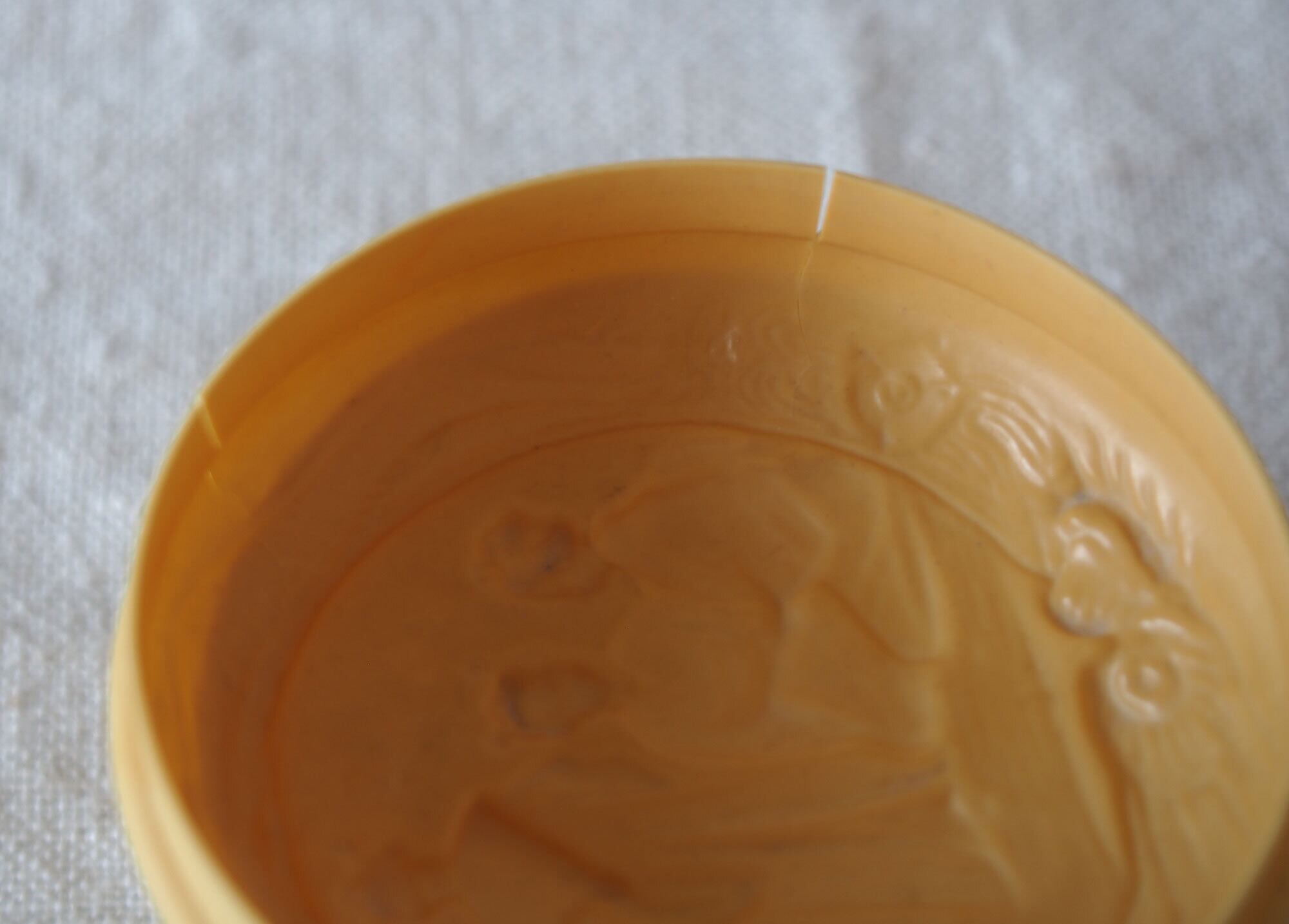 ヨーロッパの蚤の市で入手。およそ19001925年ぐらい。20世紀初頭頃のセルロイド製小箱。象牙代替素材として流行した時代のもので、蓋にはシノワズリ文様の型押し装飾。化粧用クリームなどを入れたものでしょうか?シノワズリ×ジャポニズムのデザイン。ご覧のように蓋にも本体には割れがあります、写真参照。コレクションにいかがでしょう。