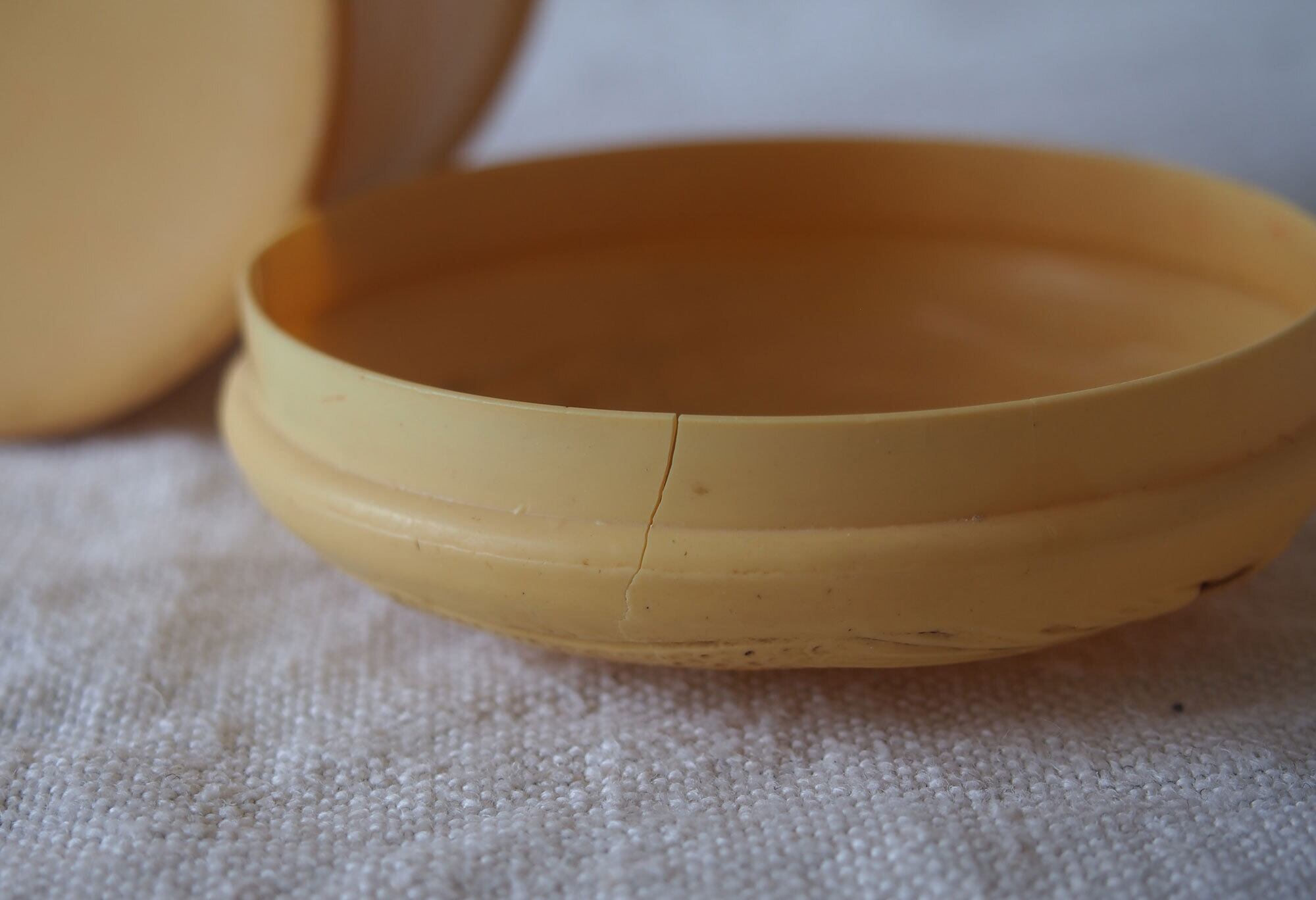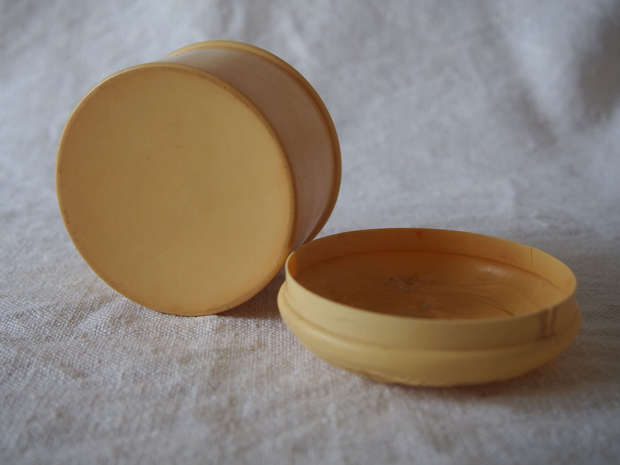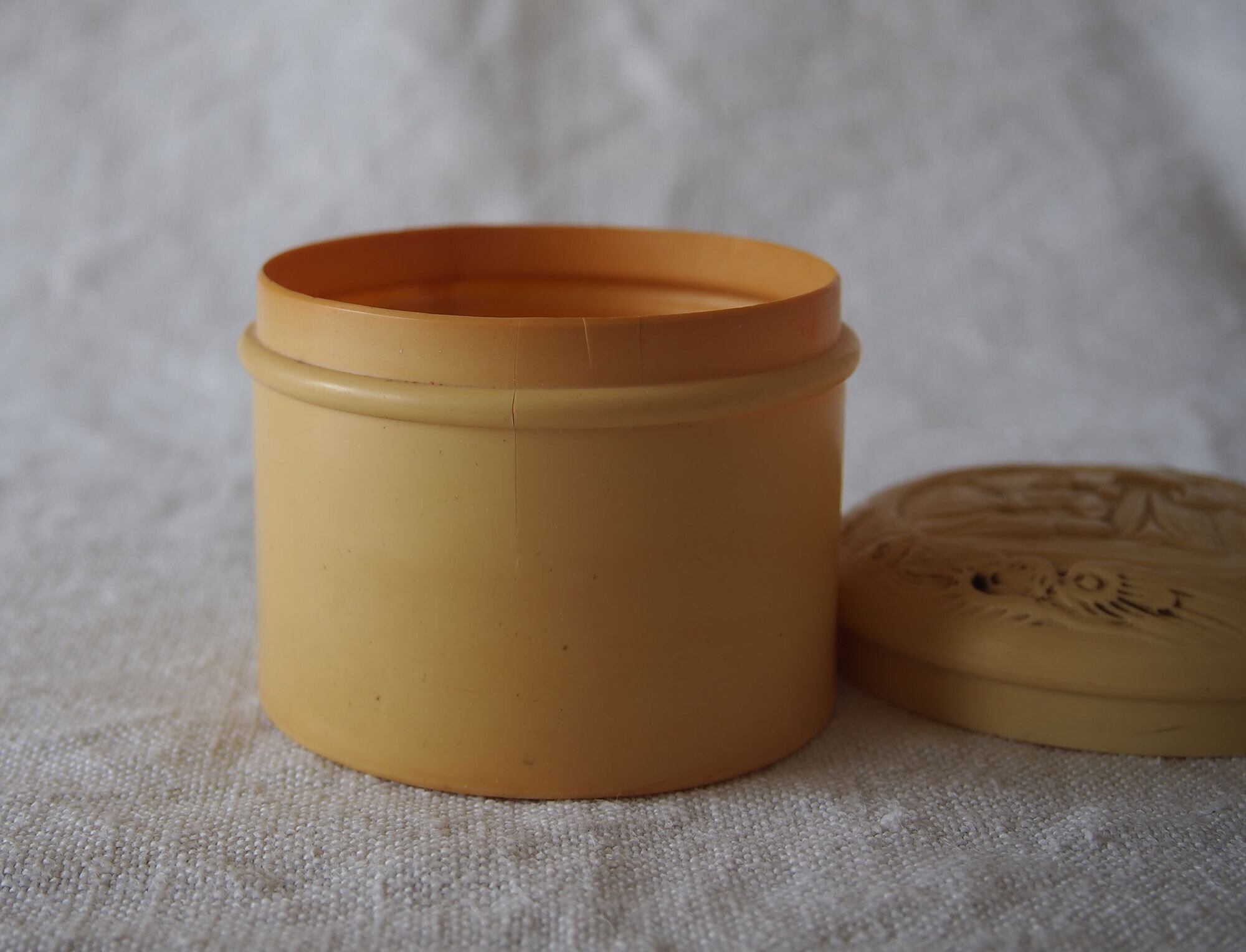 ヨーロッパの蚤の市で入手。およそ19001925年ぐらい。20世紀初頭頃のセルロイド製小箱。象牙代替素材として流行した時代のもので、蓋にはシノワズリ文様の型押し装飾。化粧用クリームなどを入れたものでしょうか?シノワズリ×ジャポニズムのデザイン。ご覧のように蓋にも本体には割れがあります、写真参照。コレクションにいかがでしょう。