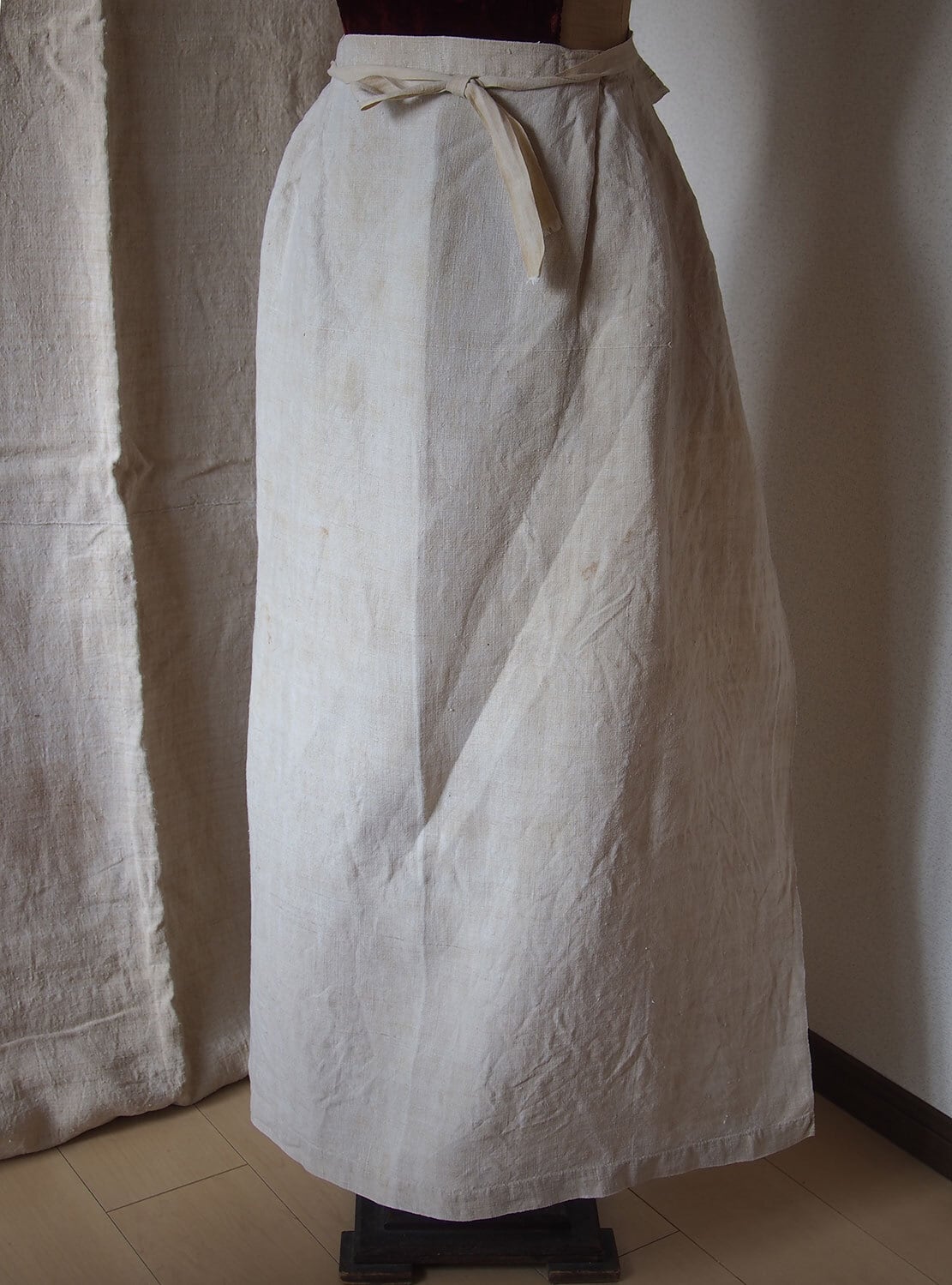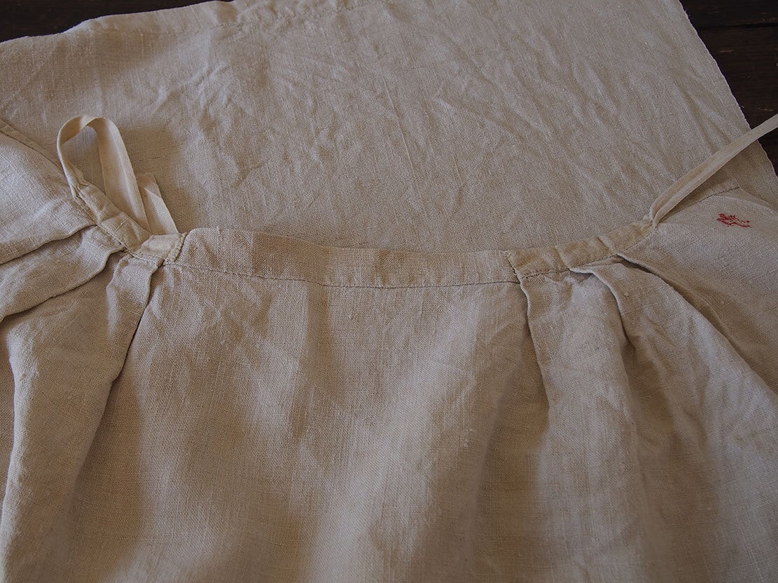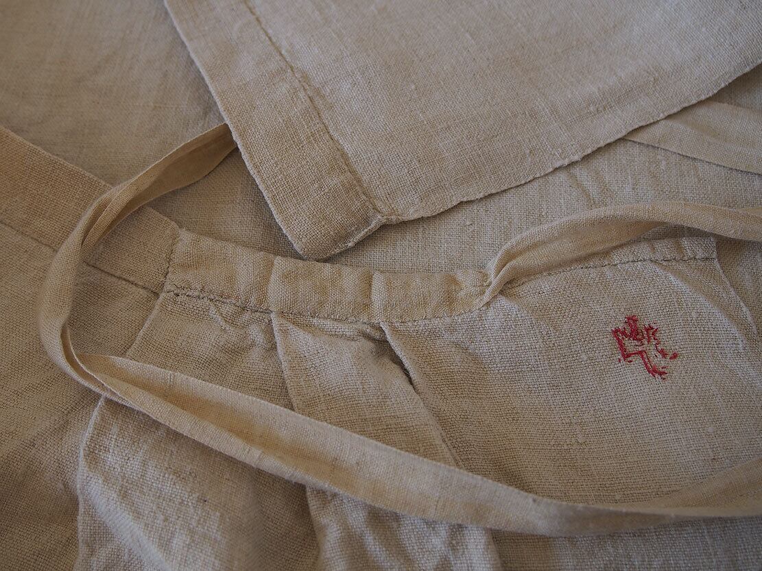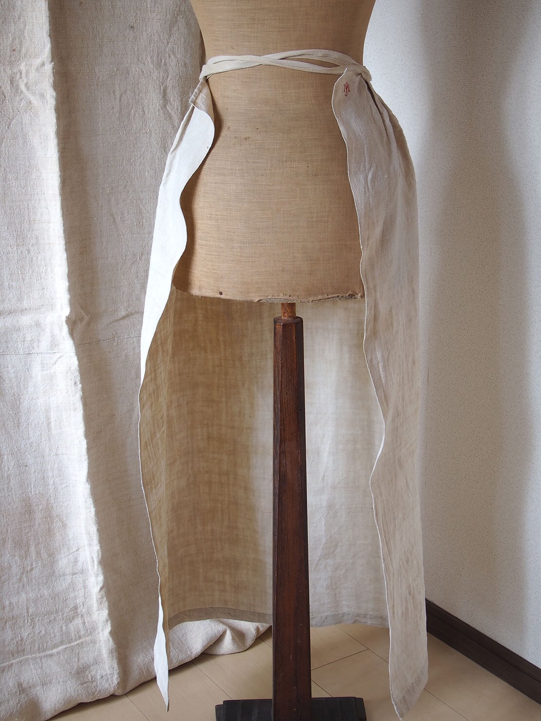 イニシャル刺繍入り シンプルなリネンのロングエプロン マルシェエプロン 丈96cm 1940年 時代衣装 アンティーク ヨーロッパ /K414