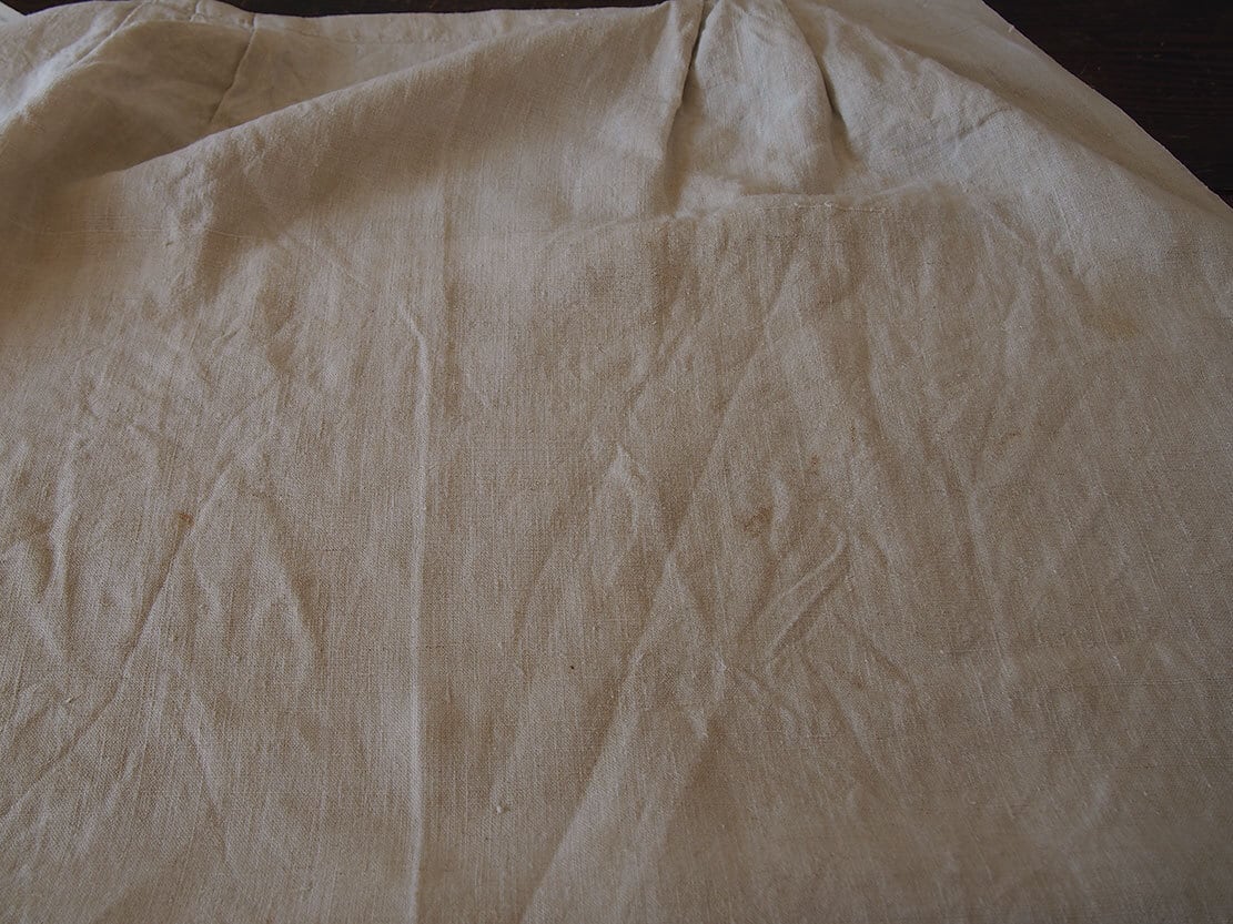 ヨーロッパのアンティーク市にて入手、1940年ぐらい?。ハンドメイドのエプロン。家庭やマルシェなどで働く女性が使ったものです。縫製は全て手縫いです。色は真っ白ではなく未晒しの生成り、綿テープのヒモ幅2.5cm×長さ73cm、角に小さな手刺しのクロス刺繍のイニシャルJMがあります。洗濯済、薄いシミが残っていますが、他には特に目立つダメージはありません、写真でご確認ください。デザイン、縫製の資料などにも。アンティーク衣装、ファブリックを得意としています、他の商品も是非ご覧ください。