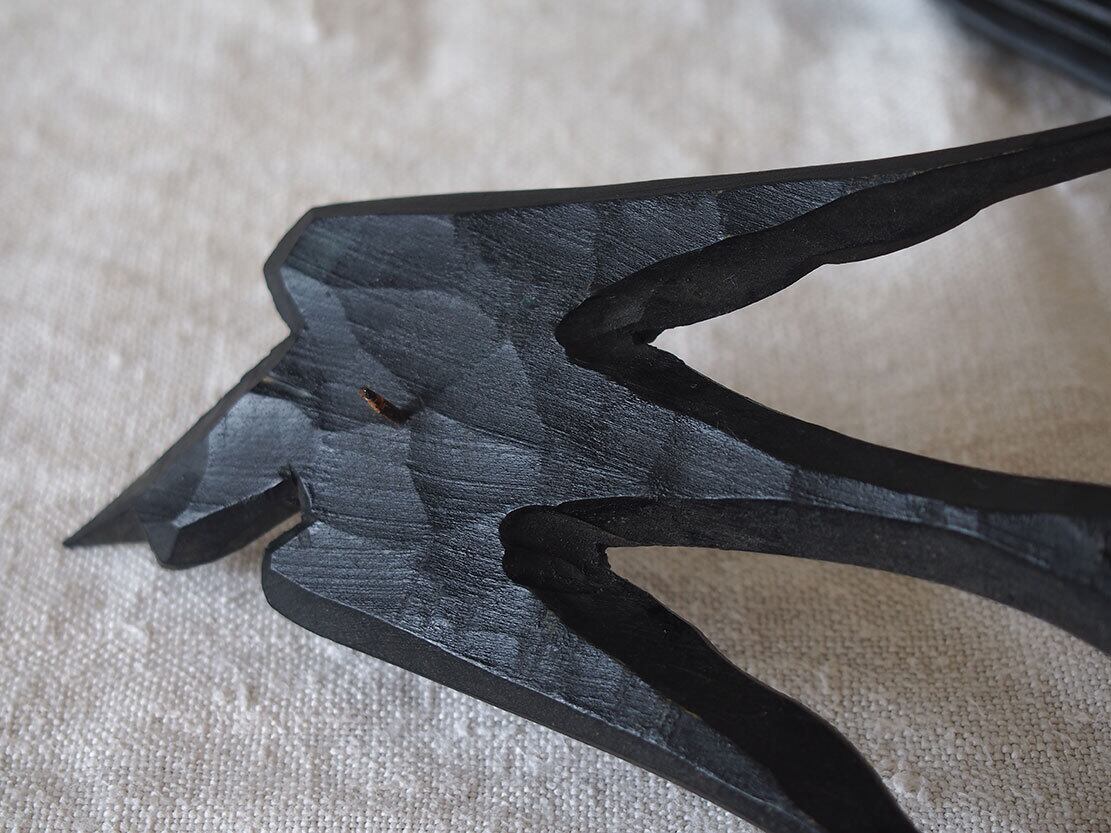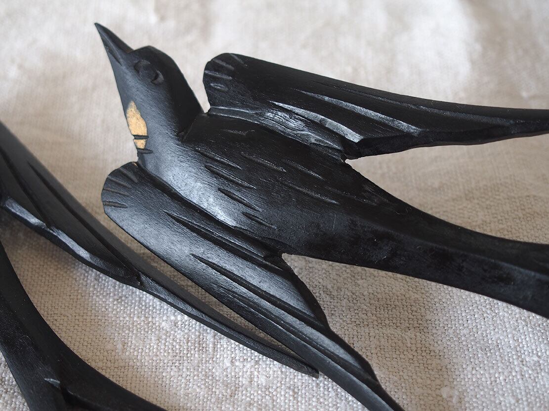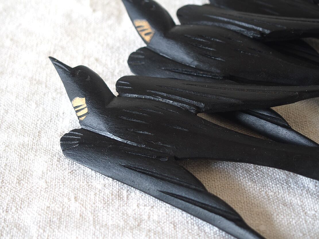 ヴィンテージ ツバメのオブジェ3羽。春ともにやってくるツバメはとても良い印象が持たれており教会の彫刻やオーナメントにもたびたび登場します。裏には取り付け用のピンがあります。特に目立つダメージはありません、写真参照。陶器のツバメはよく見かけますが、木彫りはあまり入手できない貴重な物です。この機会をお見逃し無く。詳細は写真でご確認頂けます。バラ売りはいたしません。