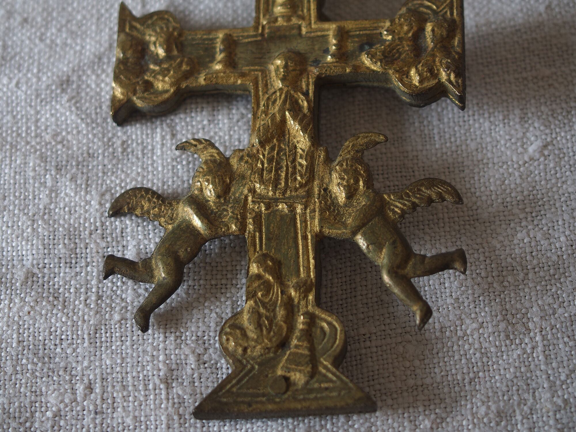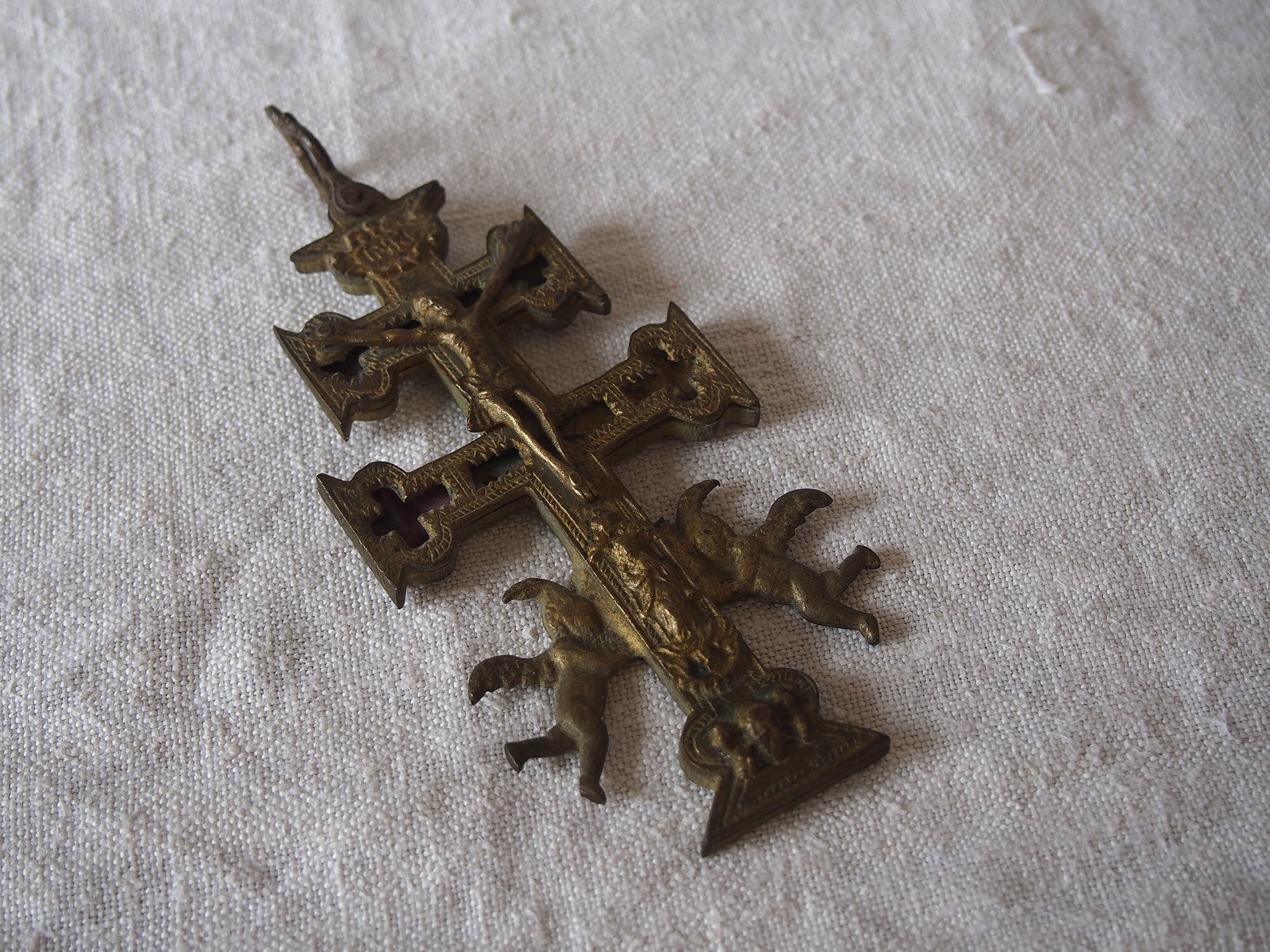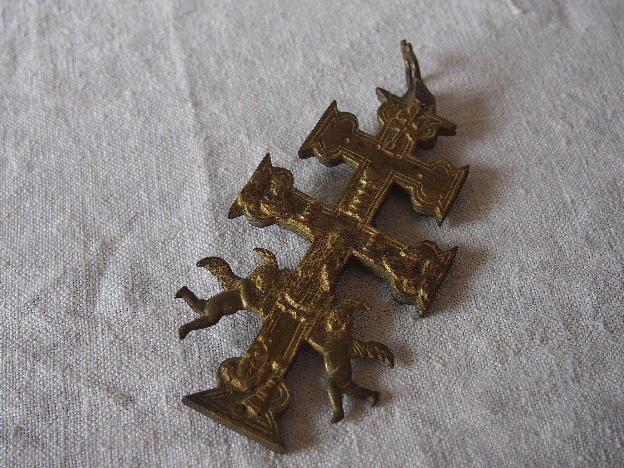 これは「カラバカ・クロス」と言って13世紀のスペイン南部のカラバカ村に伝わる伝説の十字架。十字架の無かったと村の礼拝堂に天使が運んで来たと伝えられています。十字架の下方両側には2匹の天使。判別が難しいですが、一番下には聖母のレリーフ。カラバカクロスは疫病除け、出産・家畜守護、家庭用の護符として用いられていました。上部のバチカン除いた長さ12.7cm、バチカン部分は左右に稼働します。2枚の金属板を合わせてあります。およそ1880〜1910年頃? 古い物と言う事をご理解の上のご入札をお願い致します。