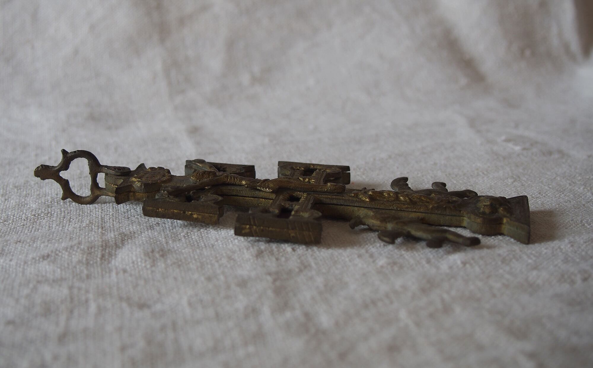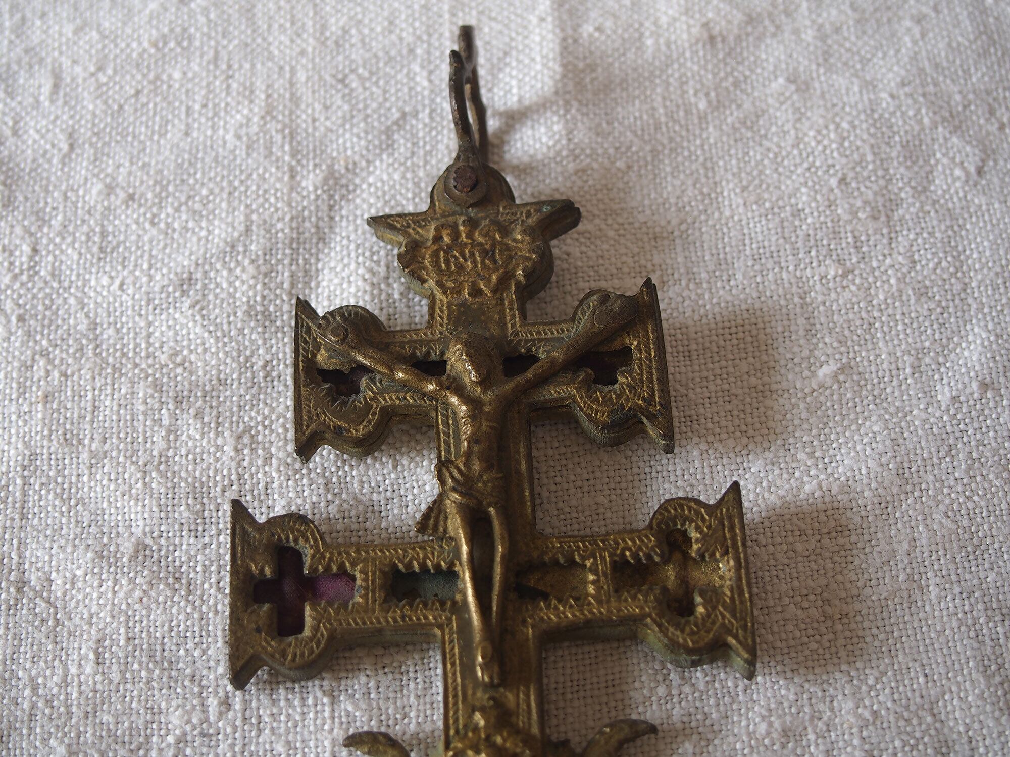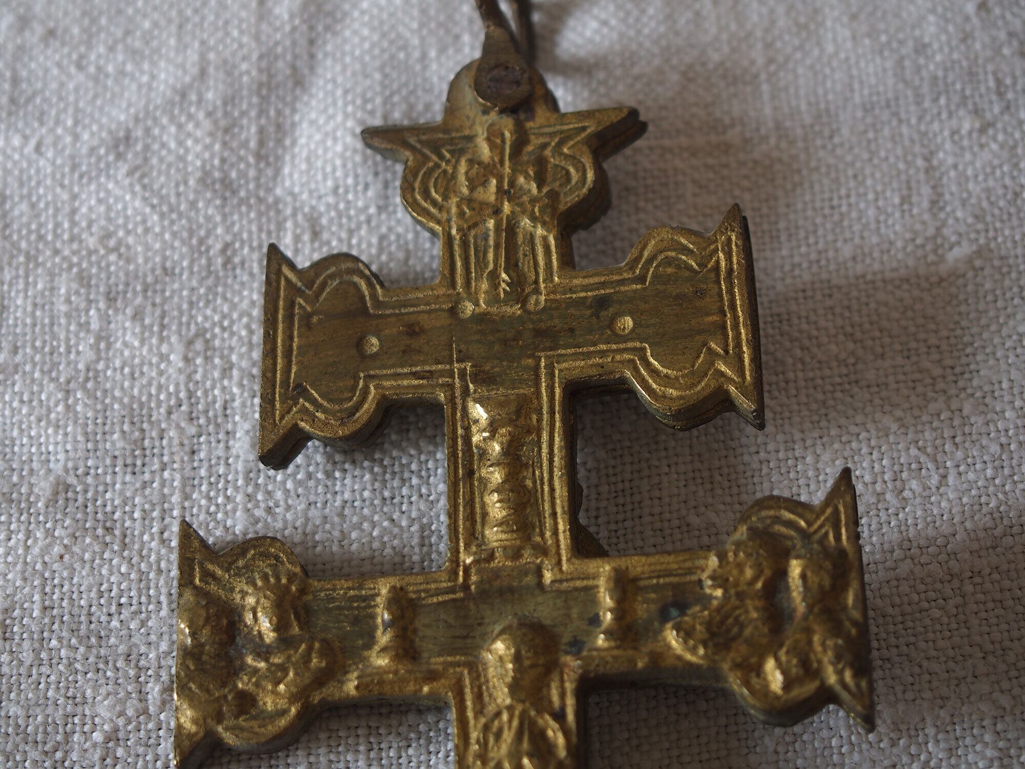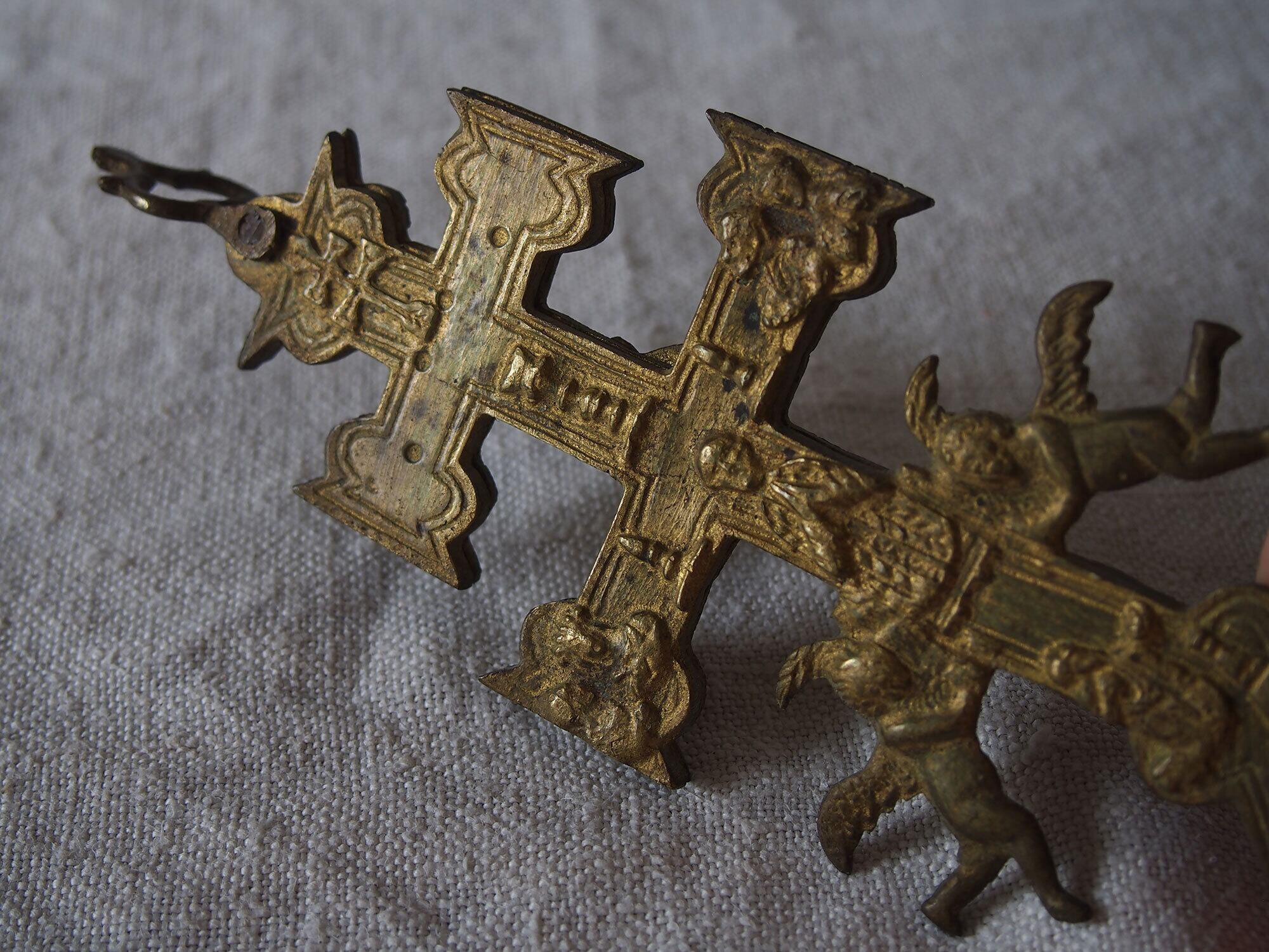 これは「カラバカ・クロス」と言って13世紀のスペイン南部のカラバカ村に伝わる伝説の十字架。十字架の無かったと村の礼拝堂に天使が運んで来たと伝えられています。十字架の下方両側には2匹の天使。判別が難しいですが、一番下には聖母のレリーフ。カラバカクロスは疫病除け、出産・家畜守護、家庭用の護符として用いられていました。上部のバチカン除いた長さ12.7cm、バチカン部分は左右に稼働します。2枚の金属板を合わせてあります。およそ1880〜1910年頃? 古い物と言う事をご理解の上のご入札をお願い致します。