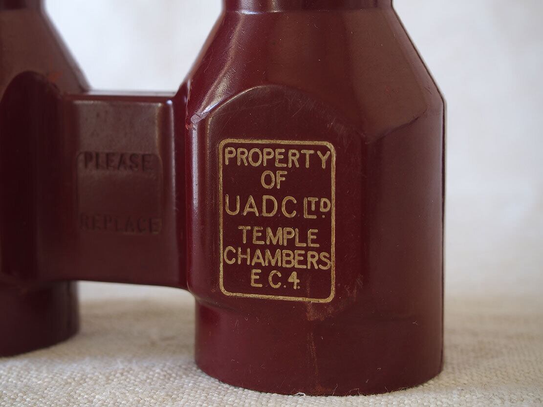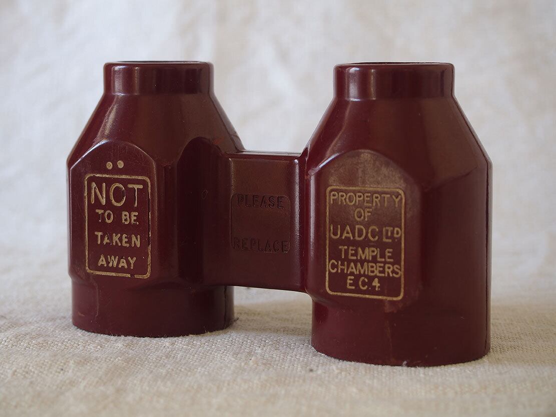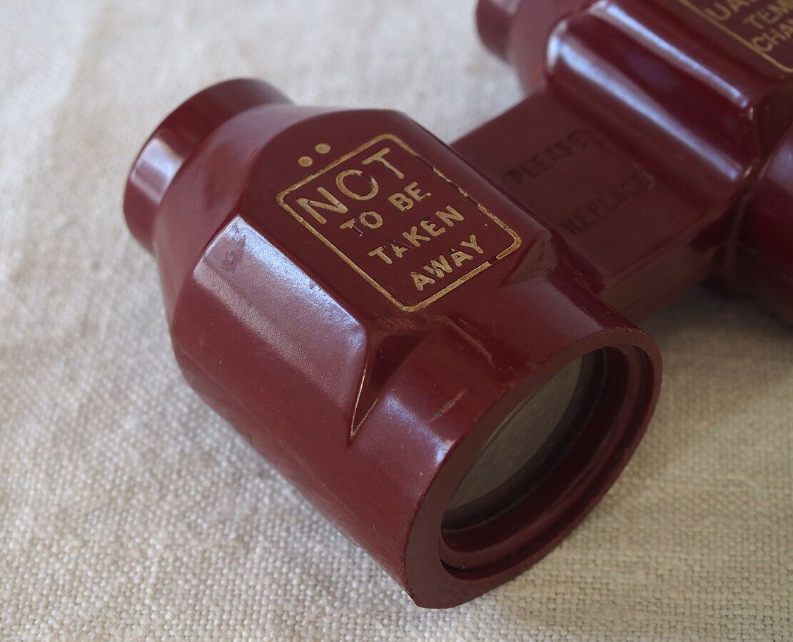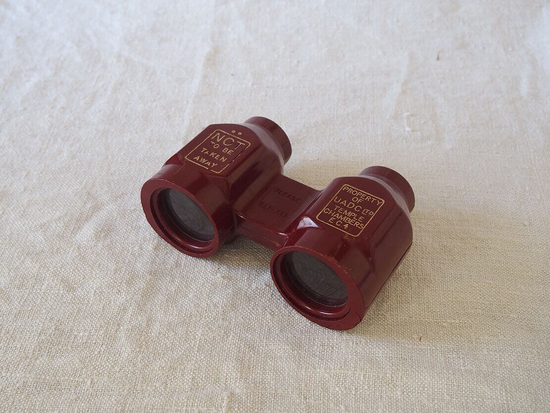 ヨーロッパの蚤の市で入手。イギリス、ロンドンのテンプル地区(Temple Chambers)にあった公共施設で使用されていたと考えられる、樹脂製のオペラグラスです。本体には「NOT TO BE TAKEN AWAY」などの注意表示があり、貸出・設置用の備品であったことが分かります。PROPERTY OF UADC LTD TEMPLE CHAMBERS E.C.4。写真参照。コレクションにいかがでしょう。