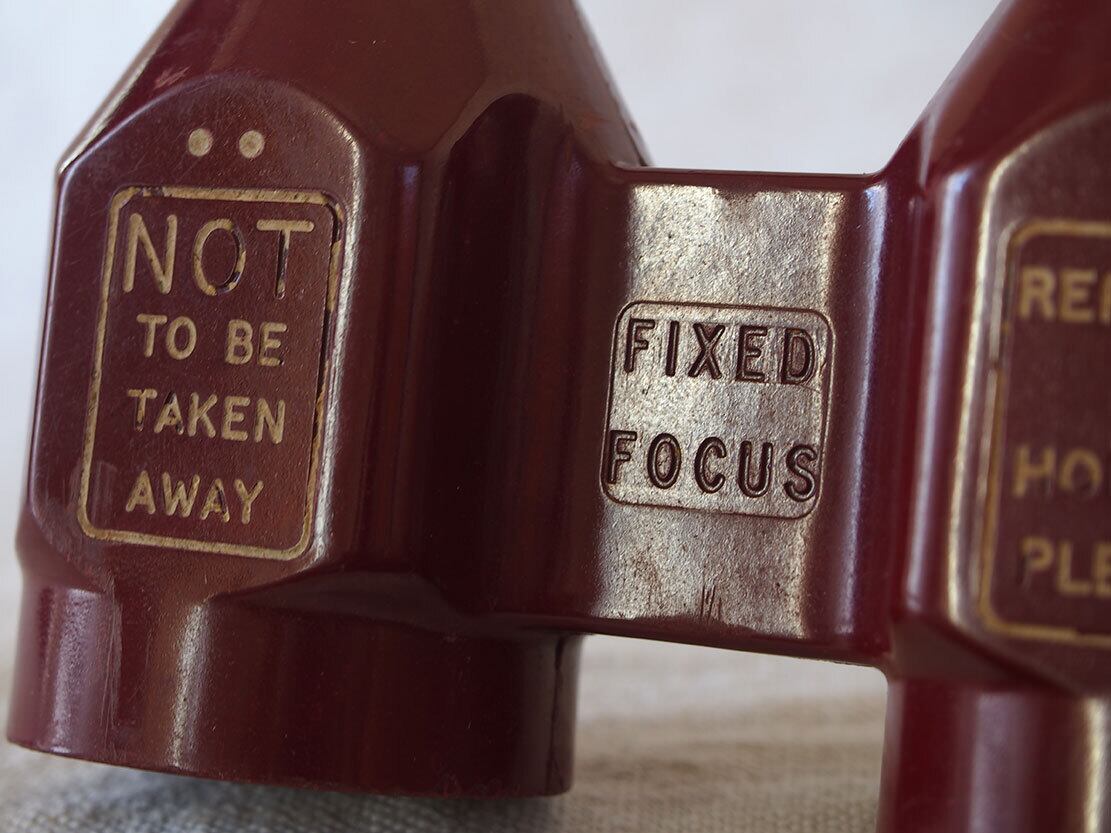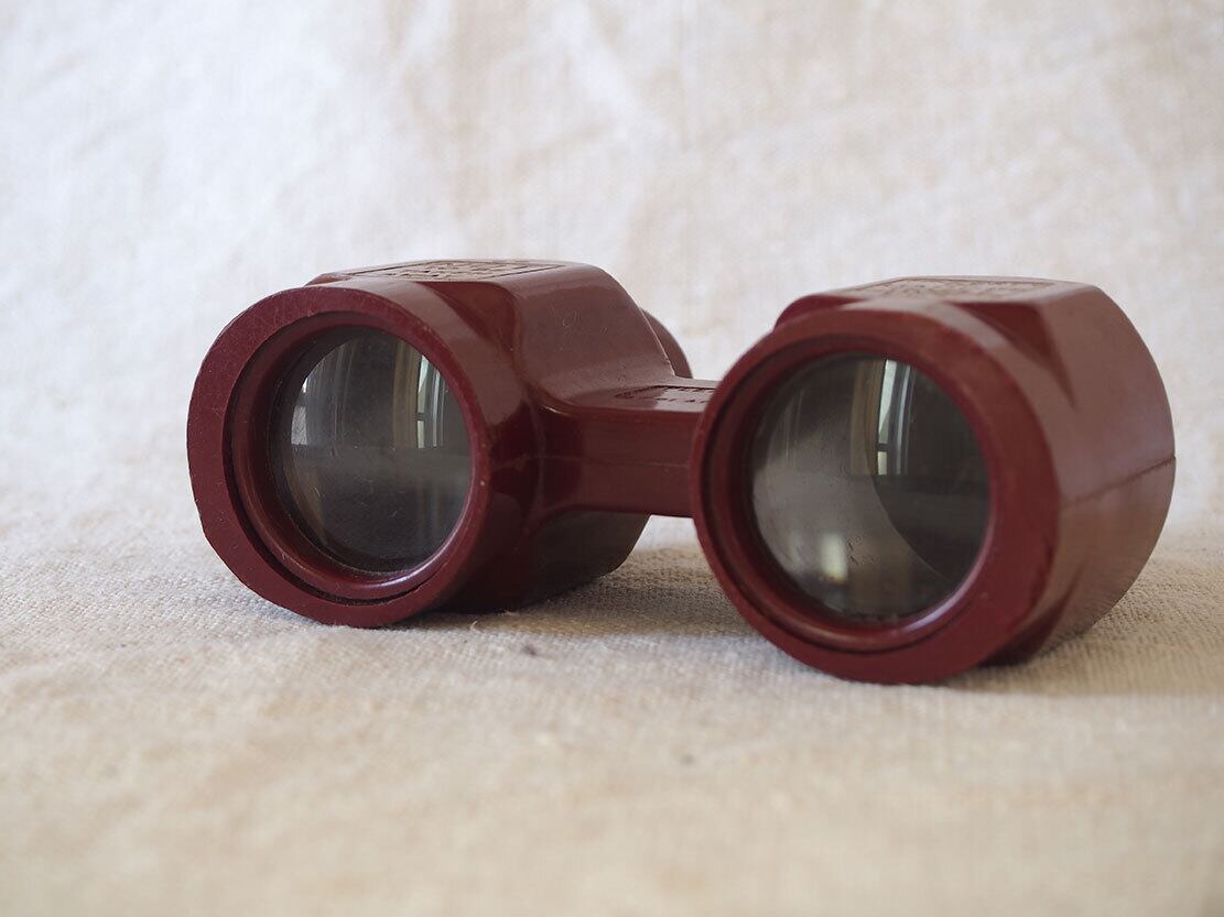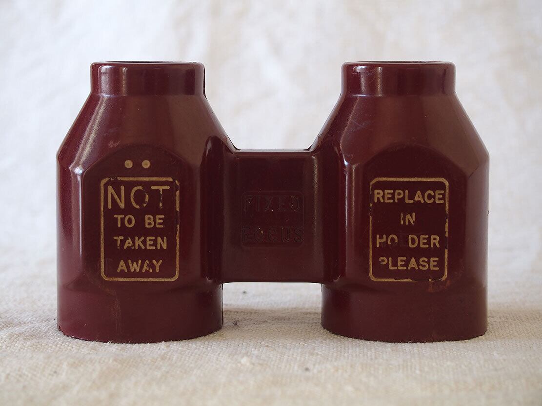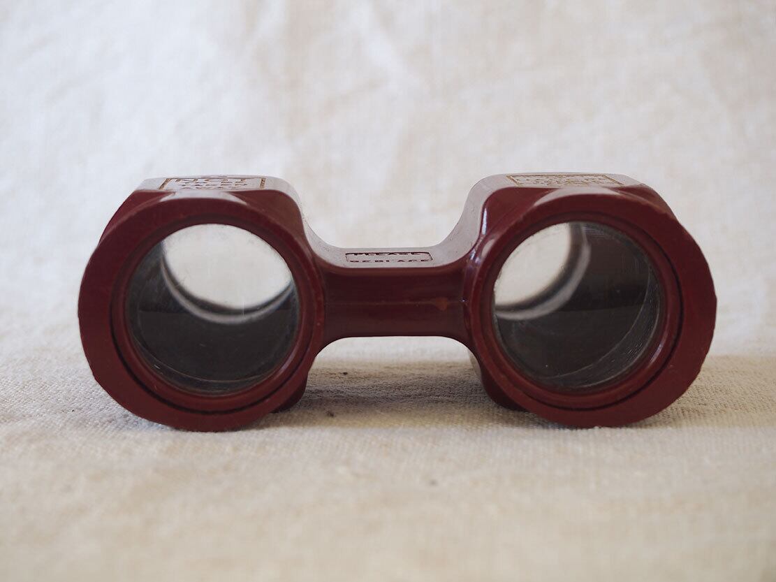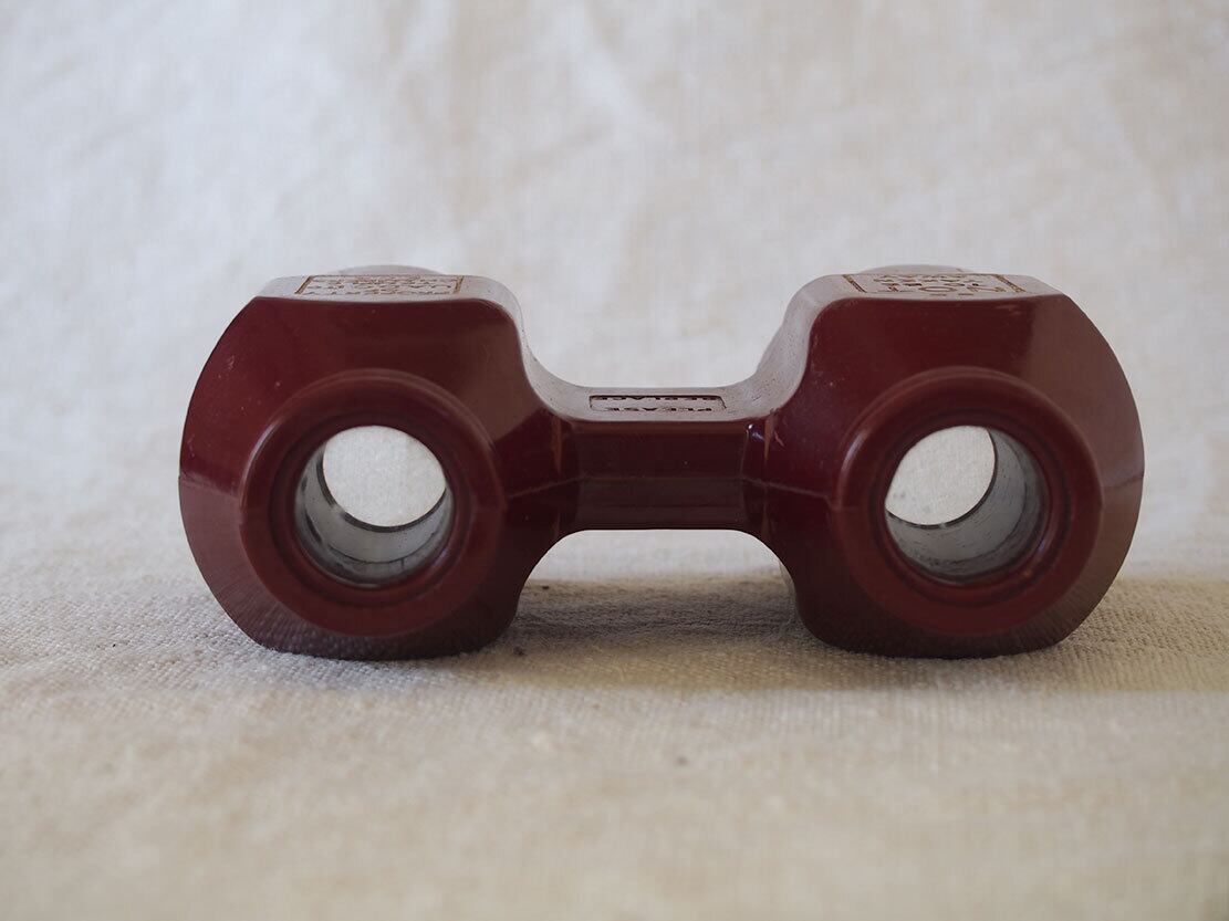 ヨーロッパの蚤の市で入手。イギリス、ロンドンのテンプル地区(Temple Chambers)にあった公共施設で使用されていたと考えられる、樹脂製のオペラグラスです。本体には「NOT TO BE TAKEN AWAY」などの注意表示があり、貸出・設置用の備品であったことが分かります。PROPERTY OF UADC LTD TEMPLE CHAMBERS E.C.4。写真参照。コレクションにいかがでしょう。