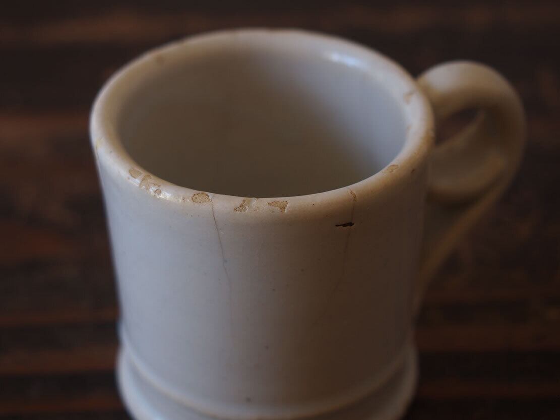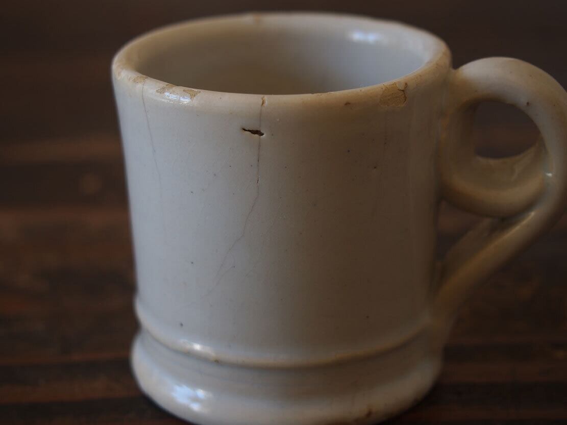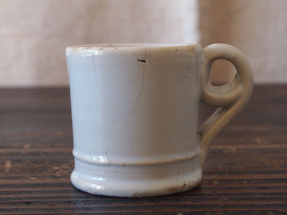 ヨーロッパで入手。修道院・宿屋・家庭用の日常のコーヒー/チョコラテなどを飲むためのカップ。おおよそ1880〜1910年頃。中世からスペインの重要な貿易都市として栄えたバレンシア州のマニセス(マニゼス)陶器。うっすらと青味を帯びた釉薬。ヒビが2箇所、ひっつきやホツなどあります。完璧じゃないけど、生活の痕跡があるのが良いでしょう。コレクション、金継ぎ直しを施して実用にもいかがでしょう。