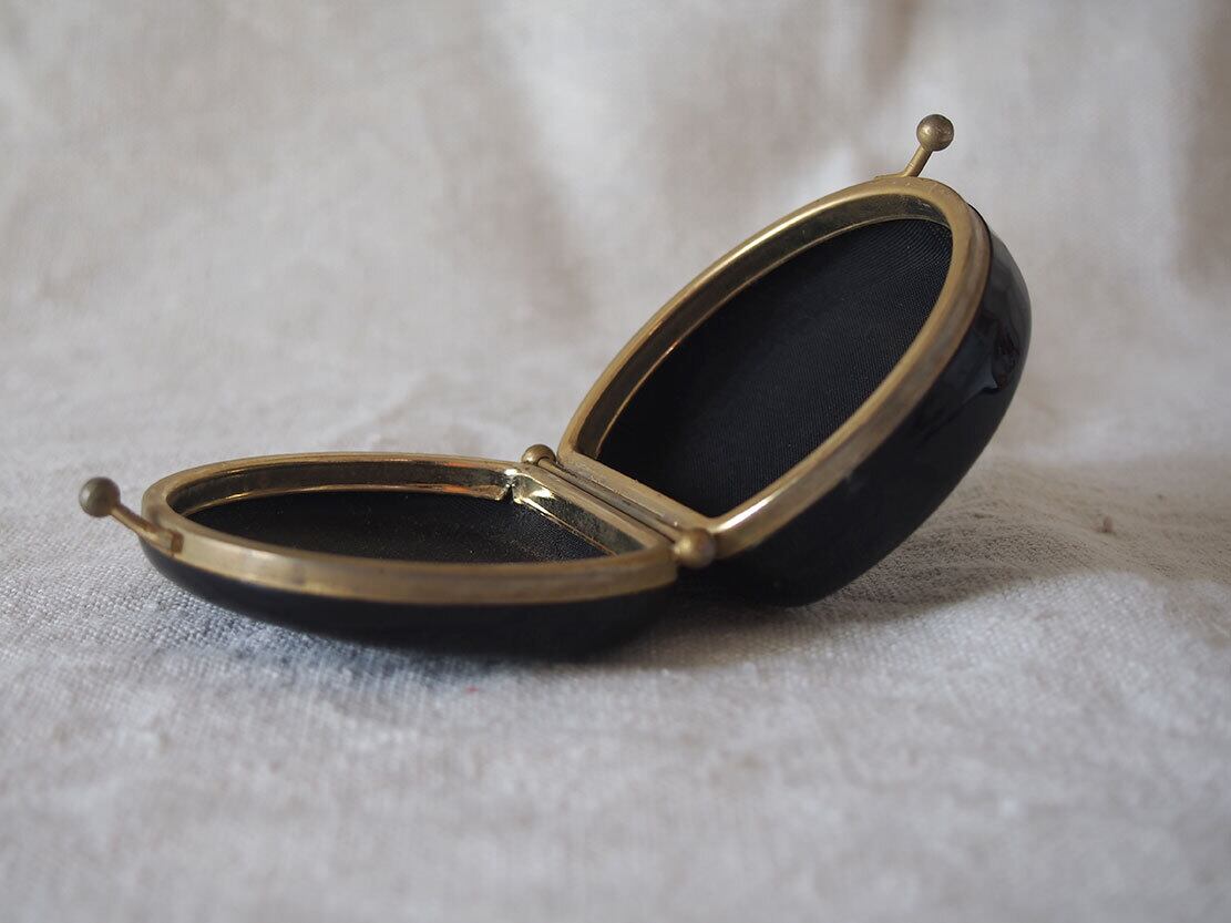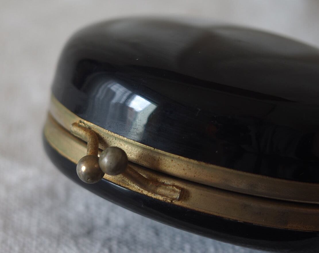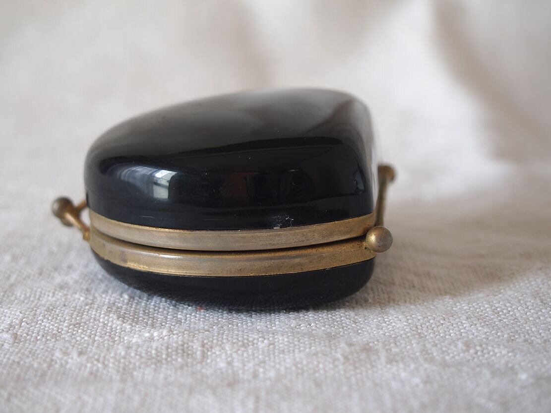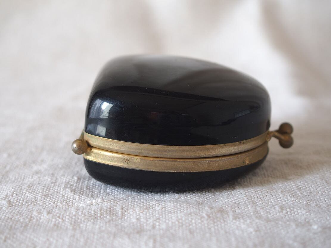 ヨーロッパのアンティーク市にて入手。小ぶりなサイズのがま口式で、指輪や小さなアクセサリーの収納に適しています。素材は初期プラスチックまたは樹脂系素材と考えられ、1920〜40年代頃のものと思われます。ご覧のように多少の擦れなどがあります、蓋の開閉は良好です。写真参照。実用可能。