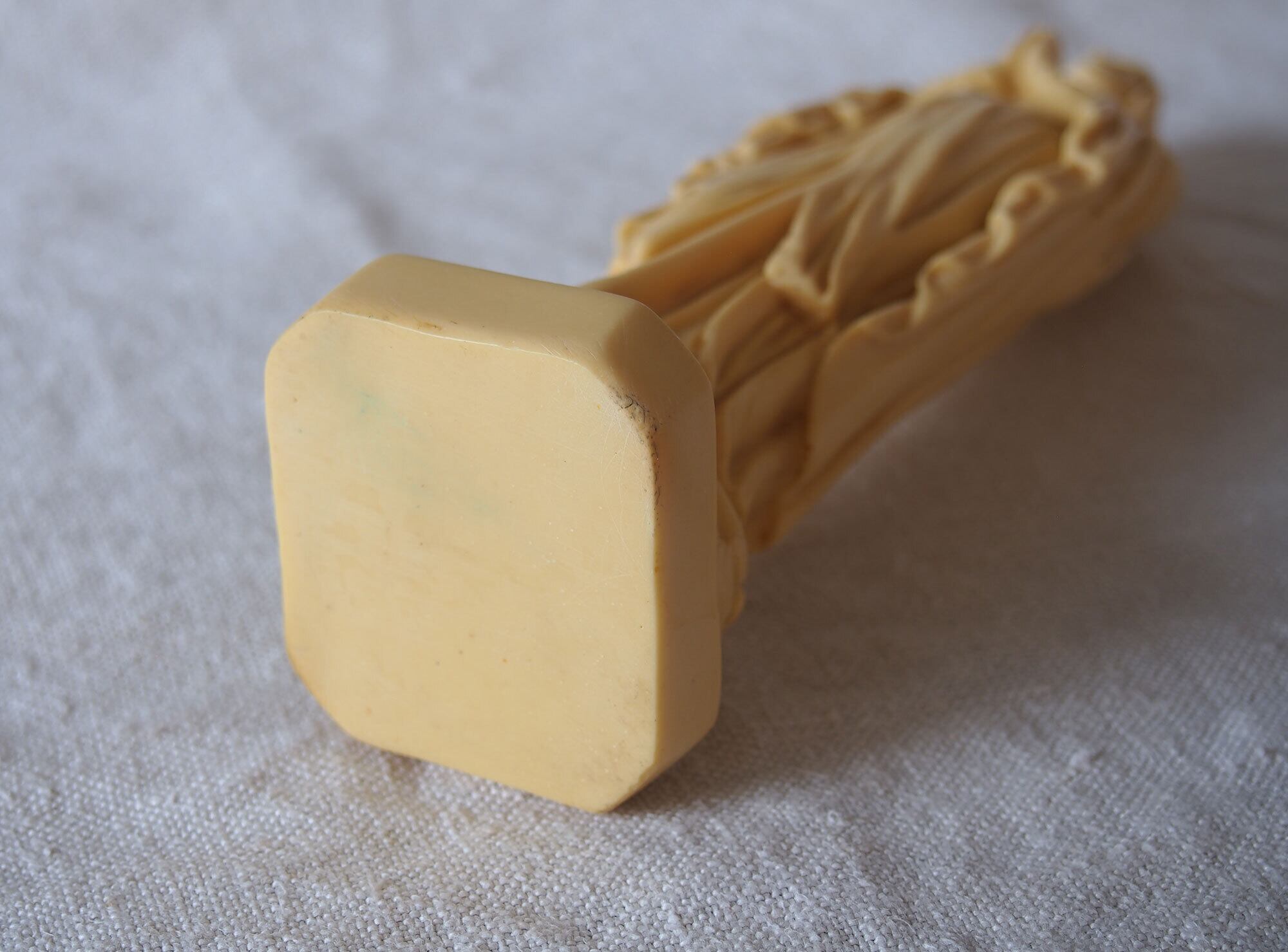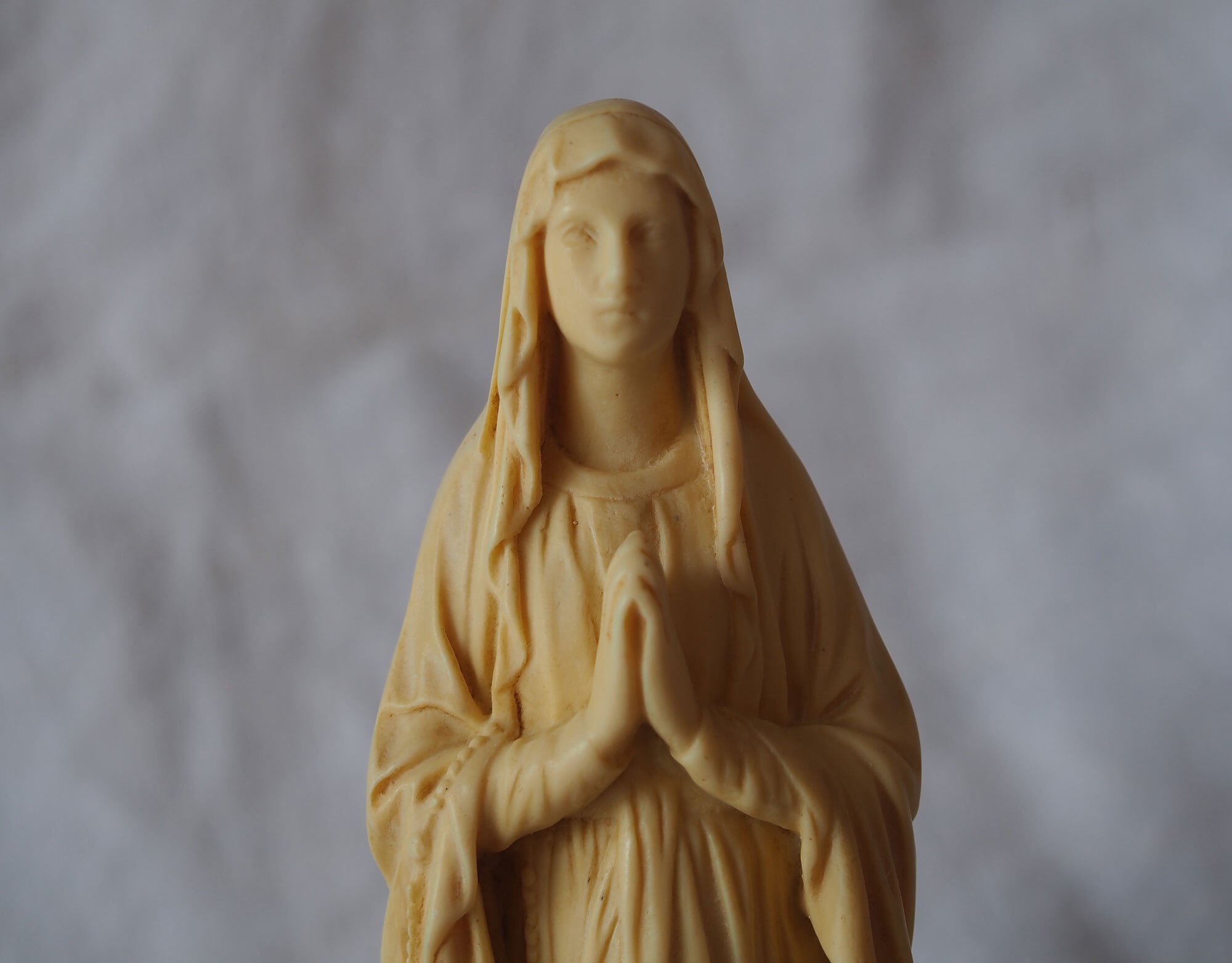 ヨーロッパのアンティーク市で入手。20世紀中頃に制作されたと考えられるヴィンテージのルルドの聖母像。経年により象牙のような色合いに変色して良い雰囲気を出しています。ヴィンテージ品として自然な経年感が見られます。大きな欠けや割れはなく、全体として良好なコンディションです。