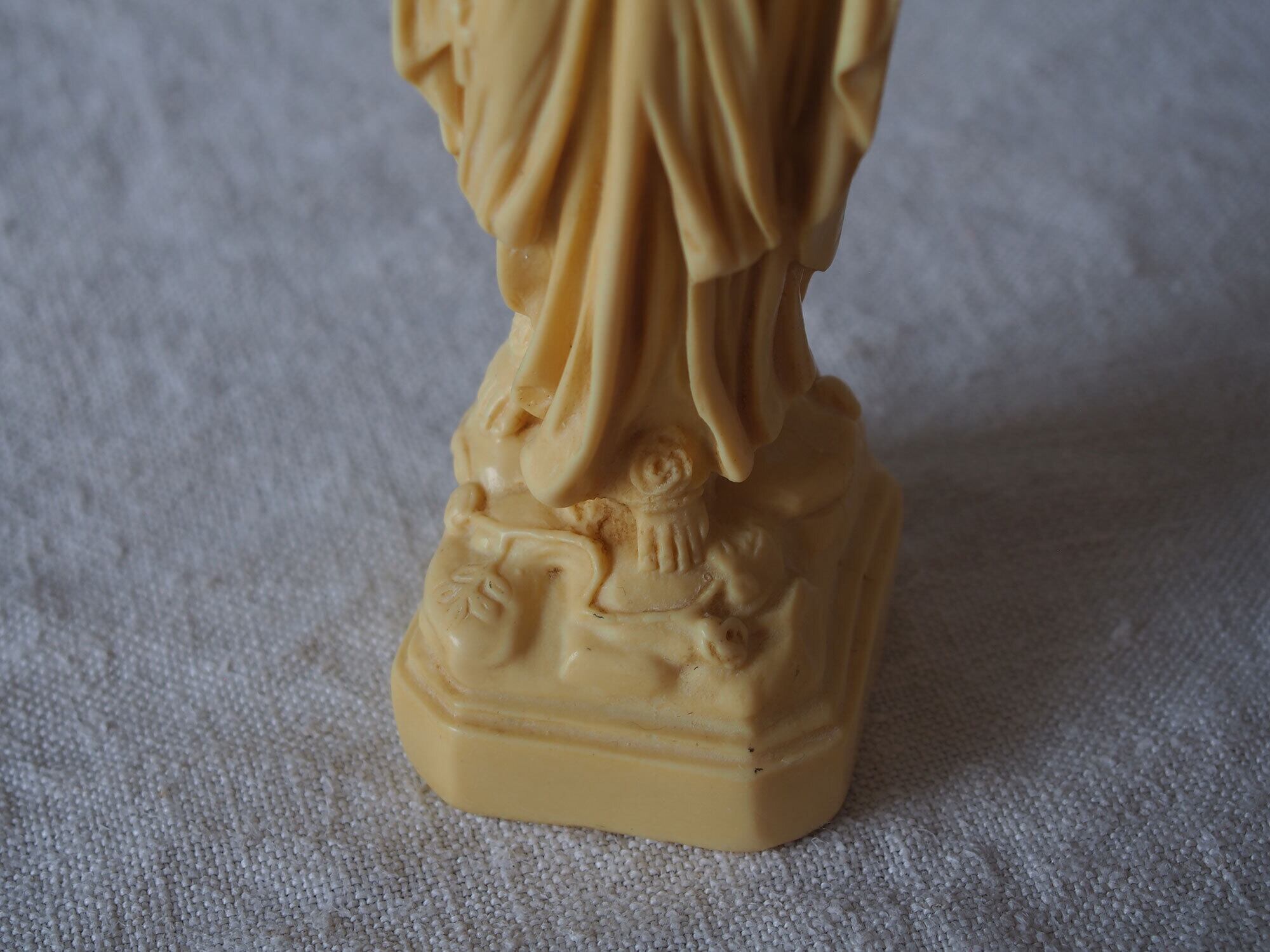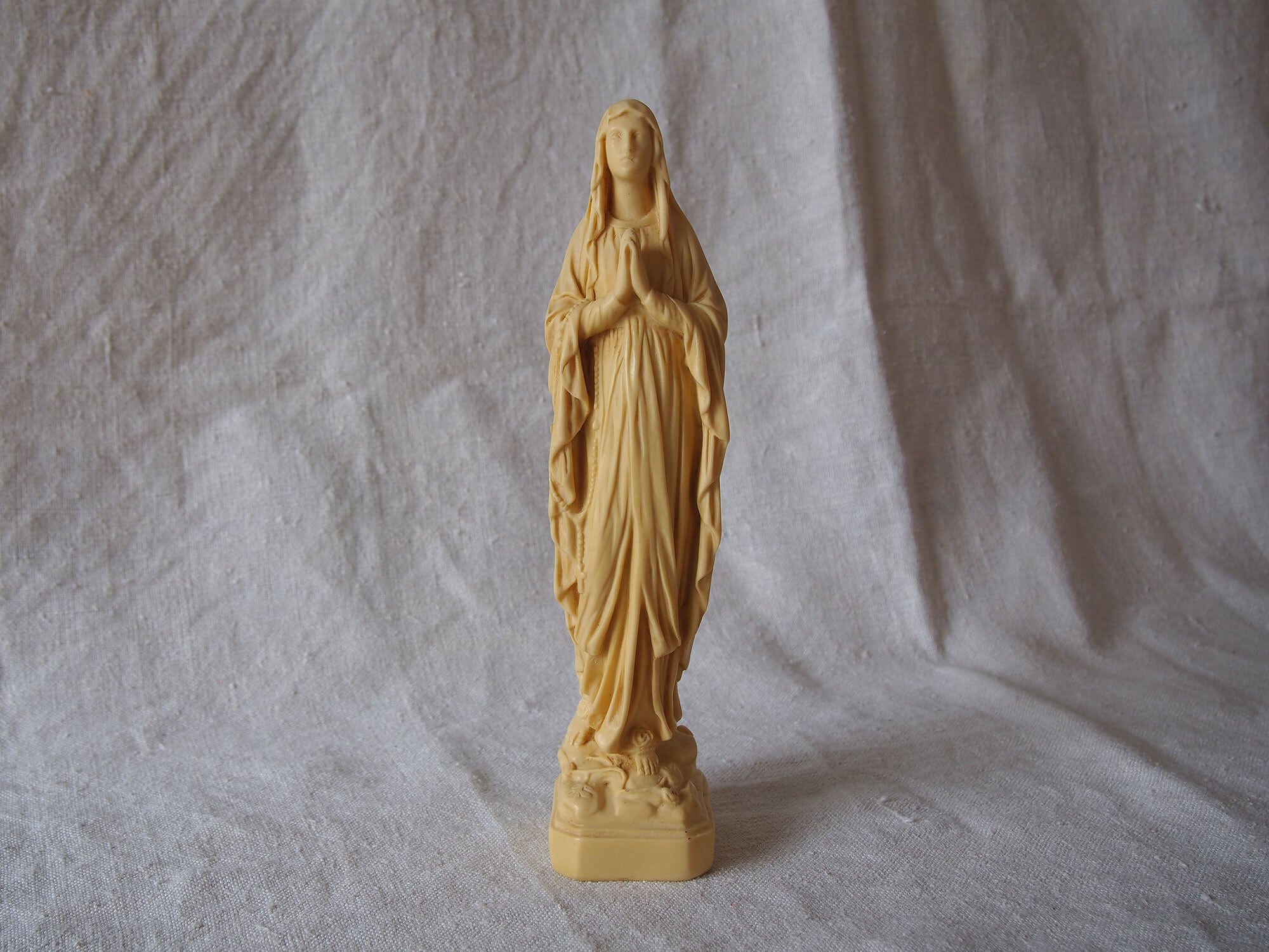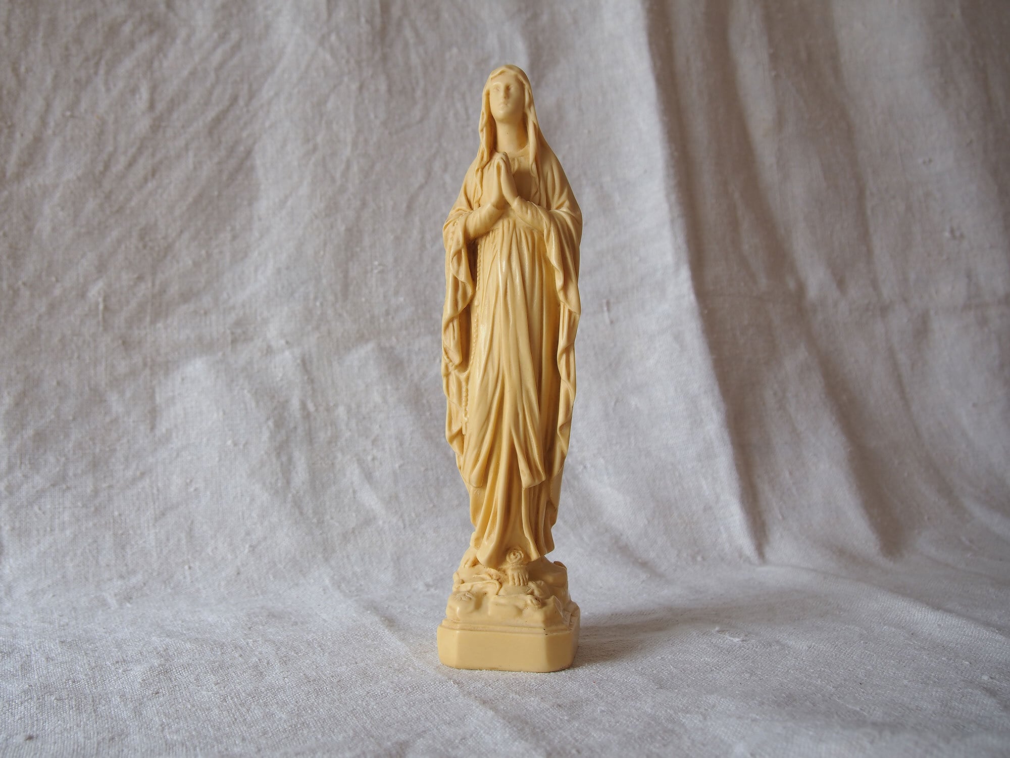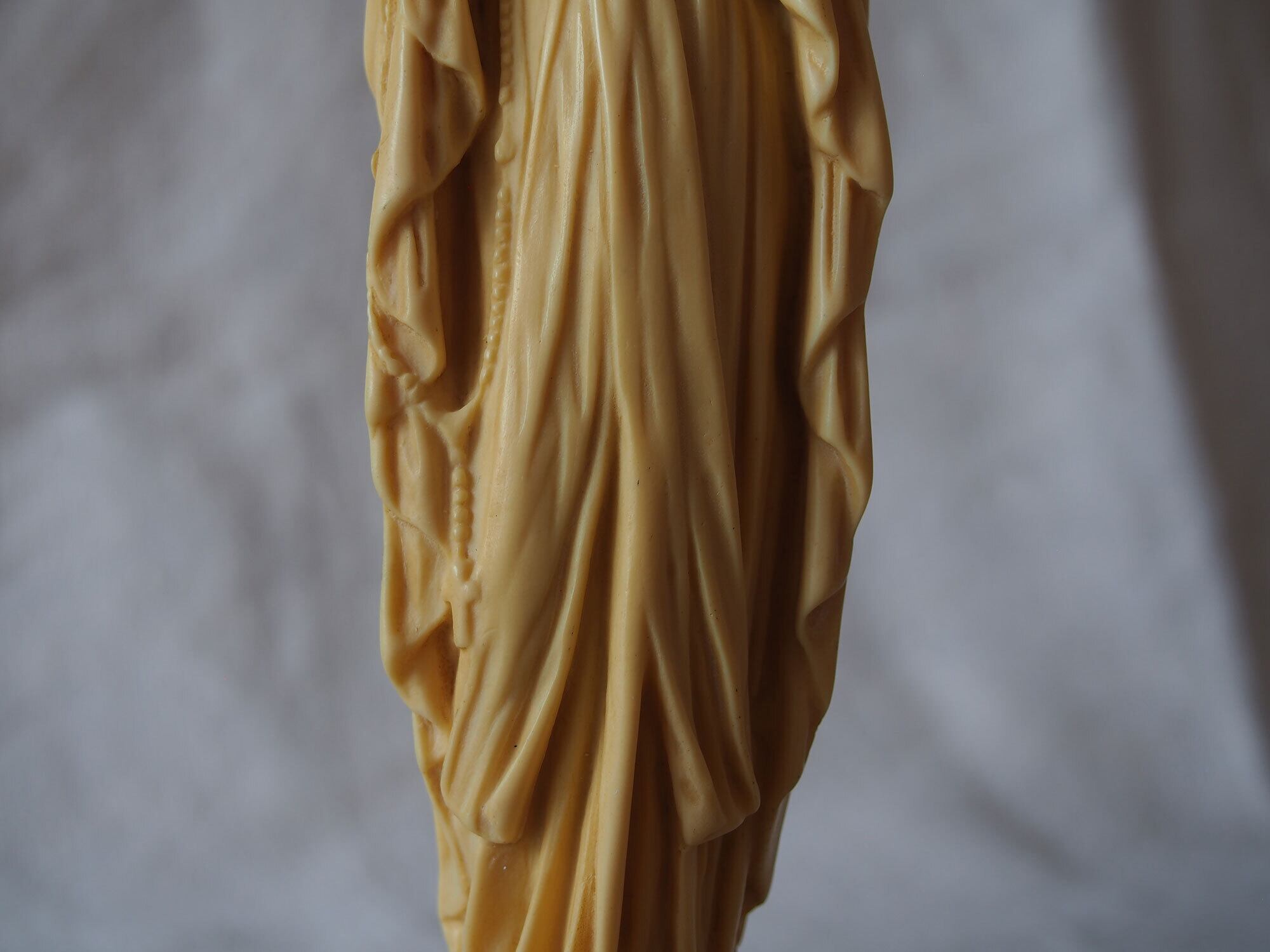象牙色のルルドの聖母マリア像 高21.8cm フランスカトリック宗教美術 ヴィンテージ フランス製 宗教彫刻 工藝 アンティーク/K432 ●サイズ:高21.8cm 幅5cm 台座4.6cm×5.2cm, 346g ●材質:樹脂(初期プラスチック/フェノール樹脂系)