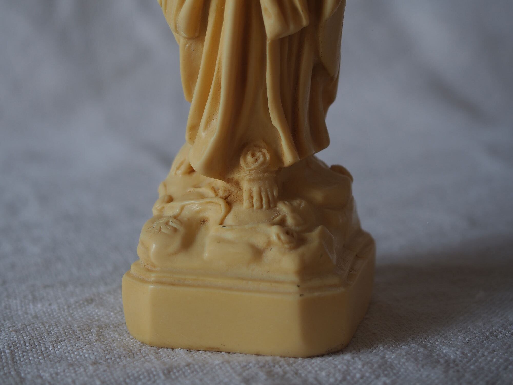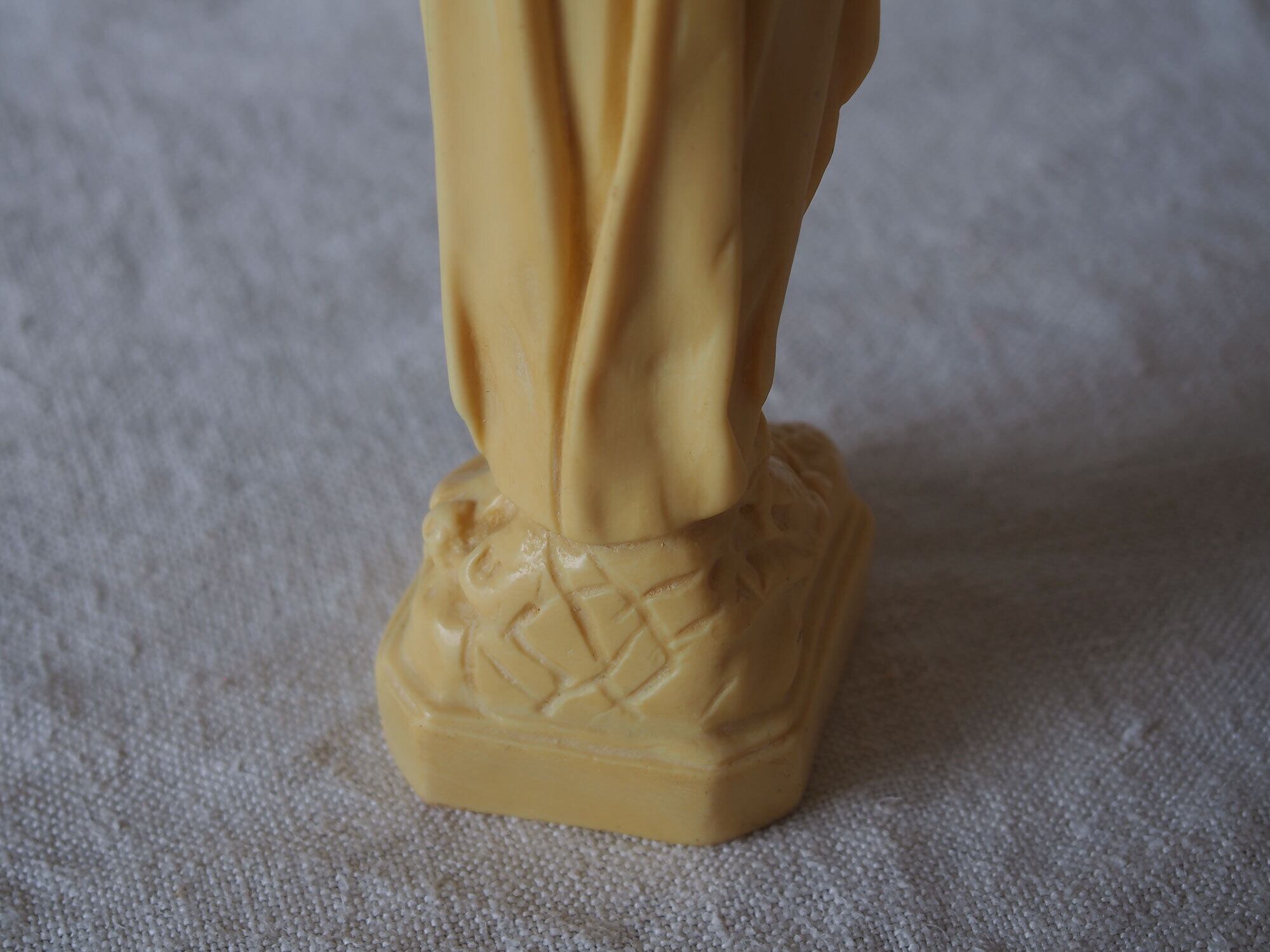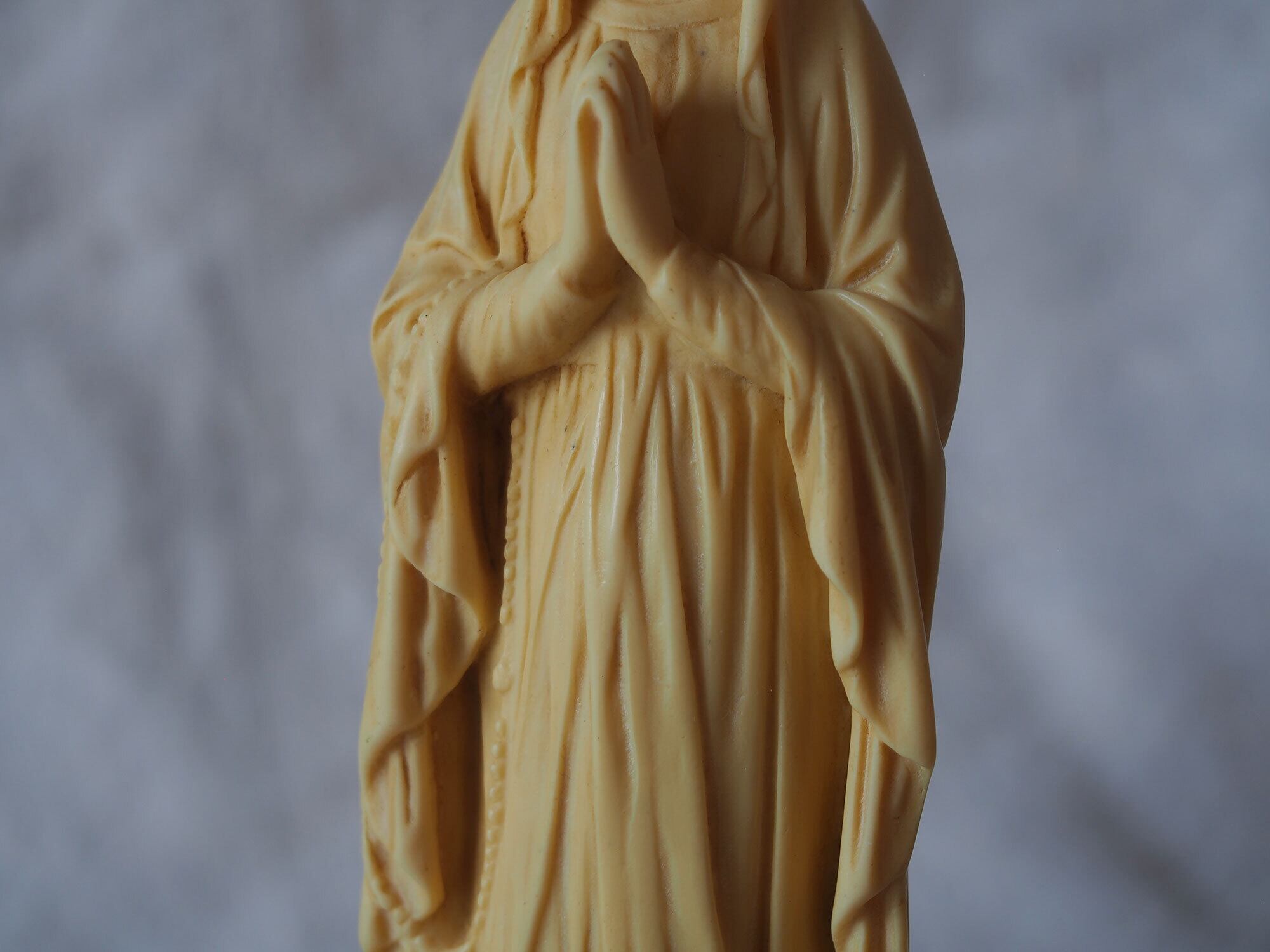 象牙色のルルドの聖母マリア像 高21.8cm フランスカトリック宗教美術 ヴィンテージ フランス製 宗教彫刻 工藝 アンティーク/K432 ●サイズ:高21.8cm 幅5cm 台座4.6cm×5.2cm, 346g ●材質:樹脂(初期プラスチック/フェノール樹脂系)