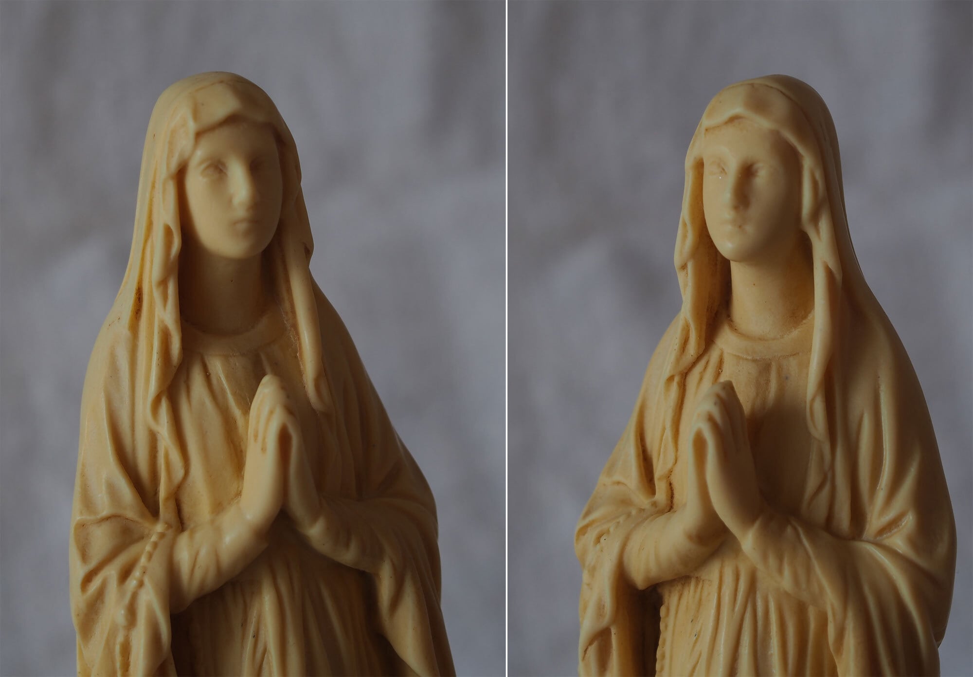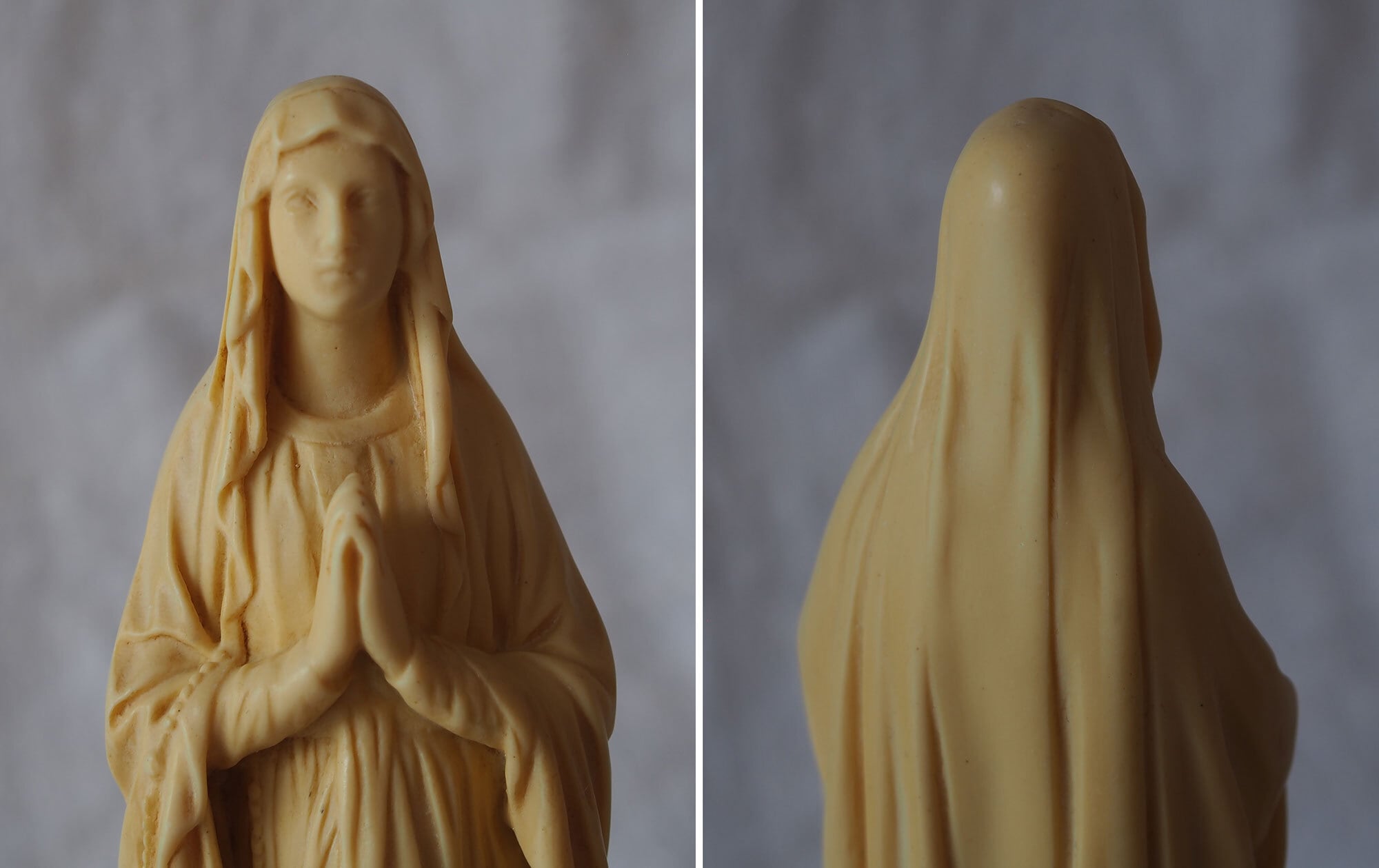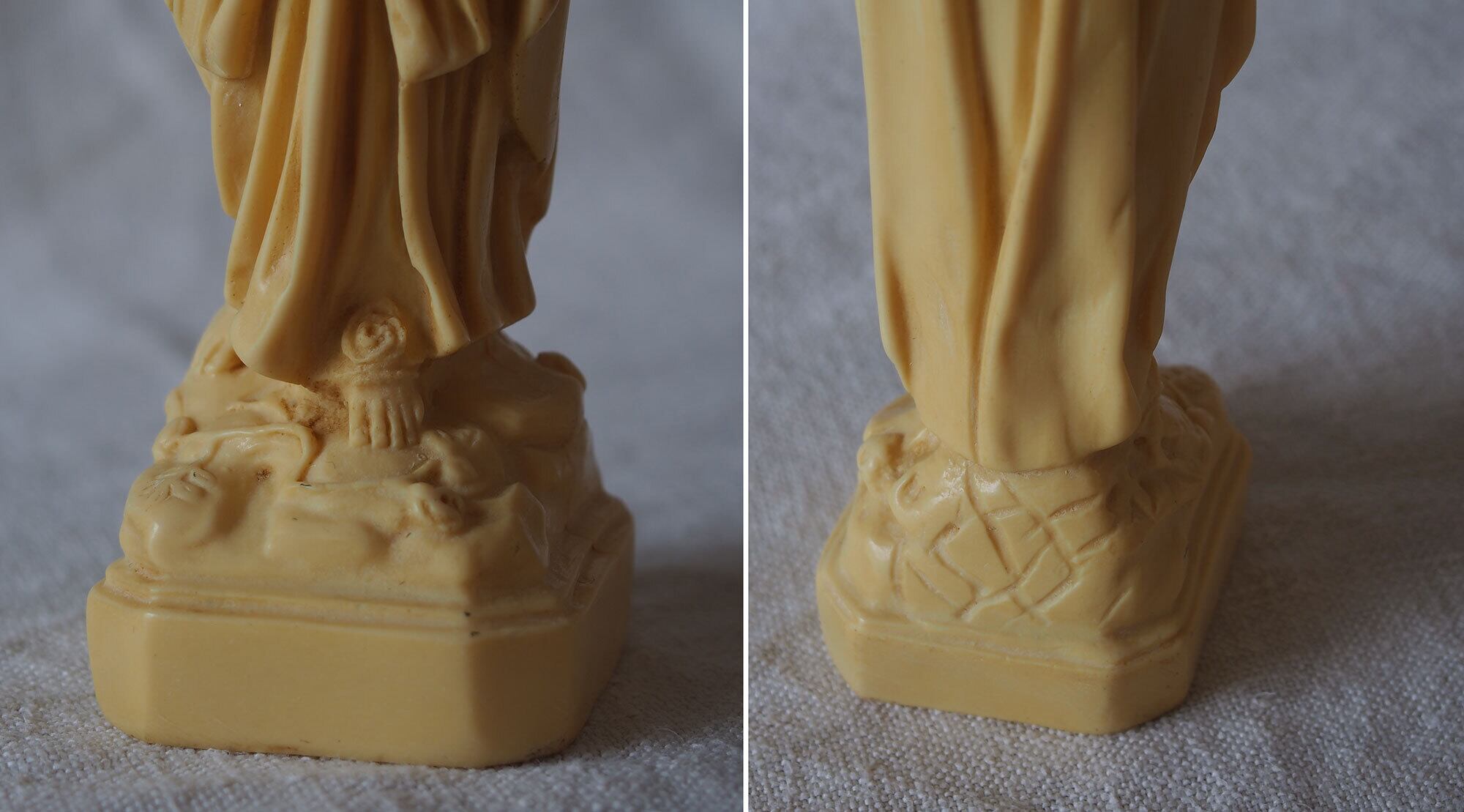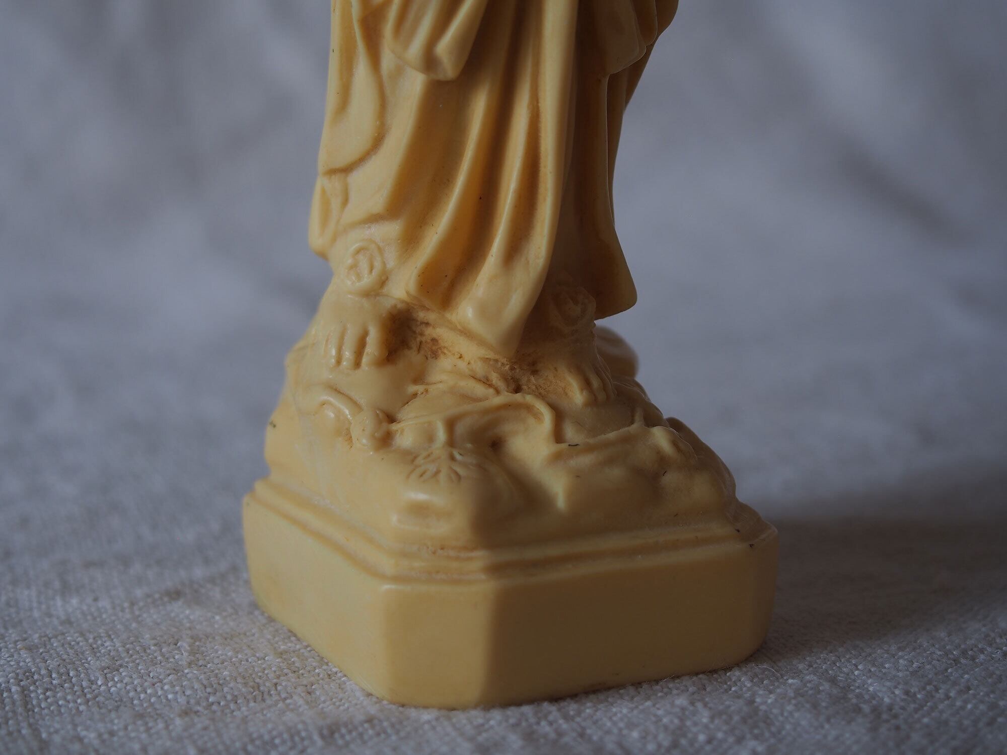 象牙色のルルドの聖母マリア像 高21.8cm フランスカトリック宗教美術 ヴィンテージ フランス製 宗教彫刻 工藝 アンティーク/K432 ●サイズ:高21.8cm 幅5cm 台座4.6cm×5.2cm, 346g ●材質:樹脂(初期プラスチック/フェノール樹脂系)