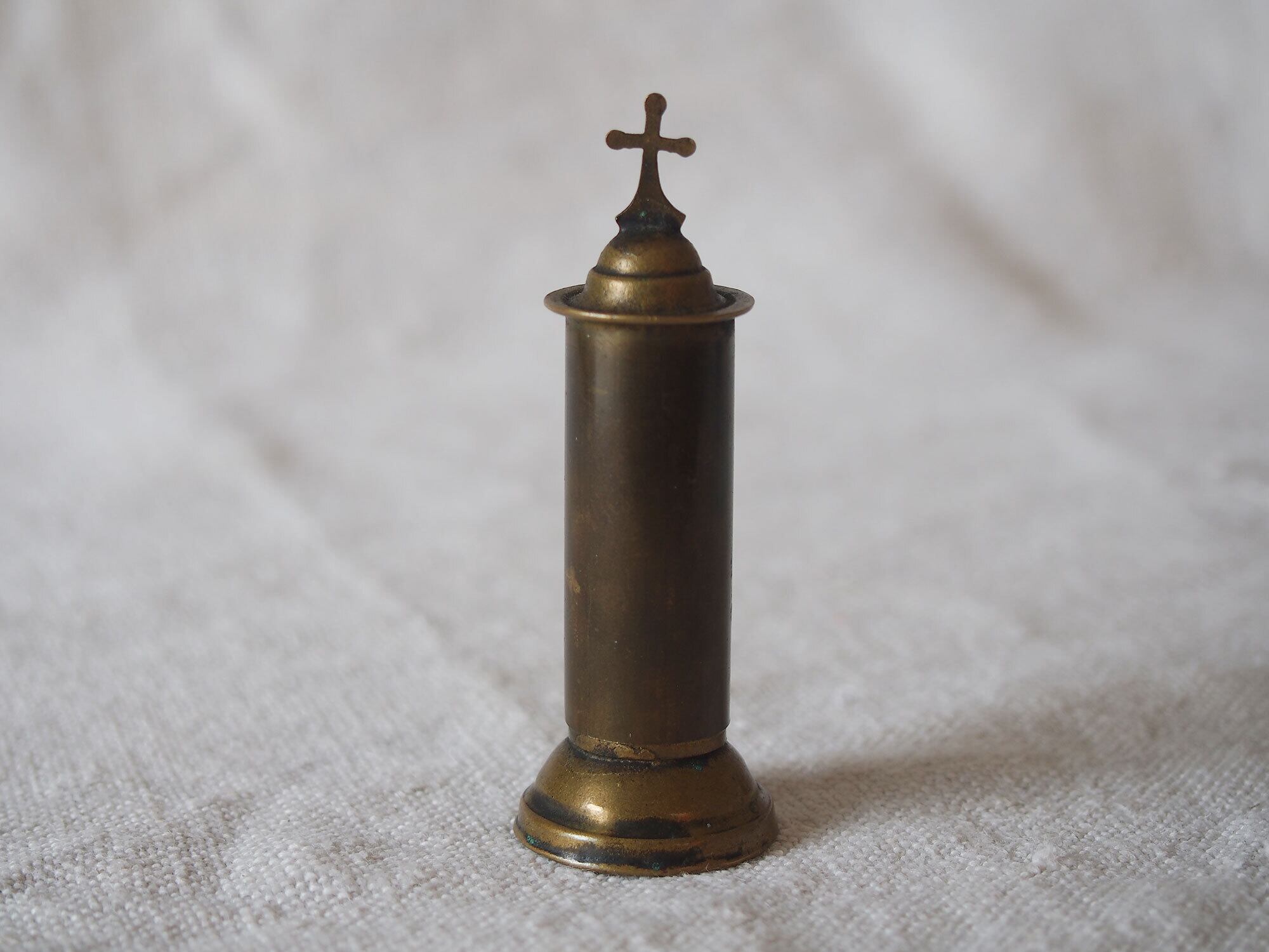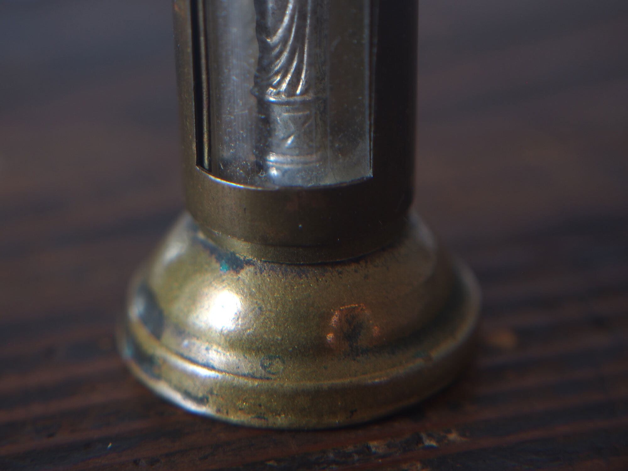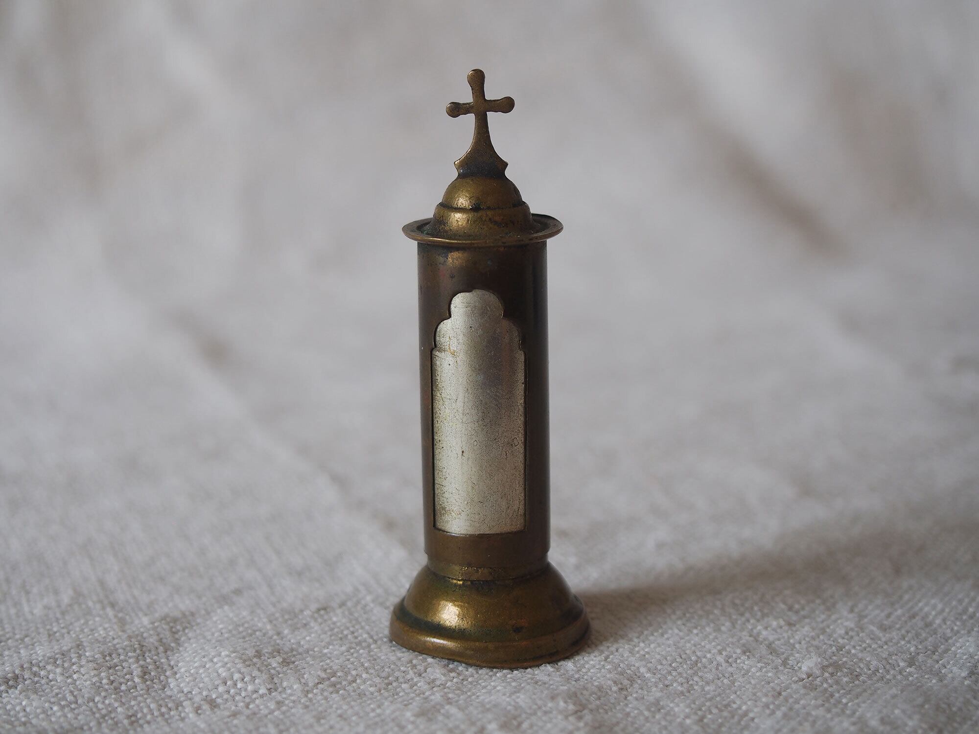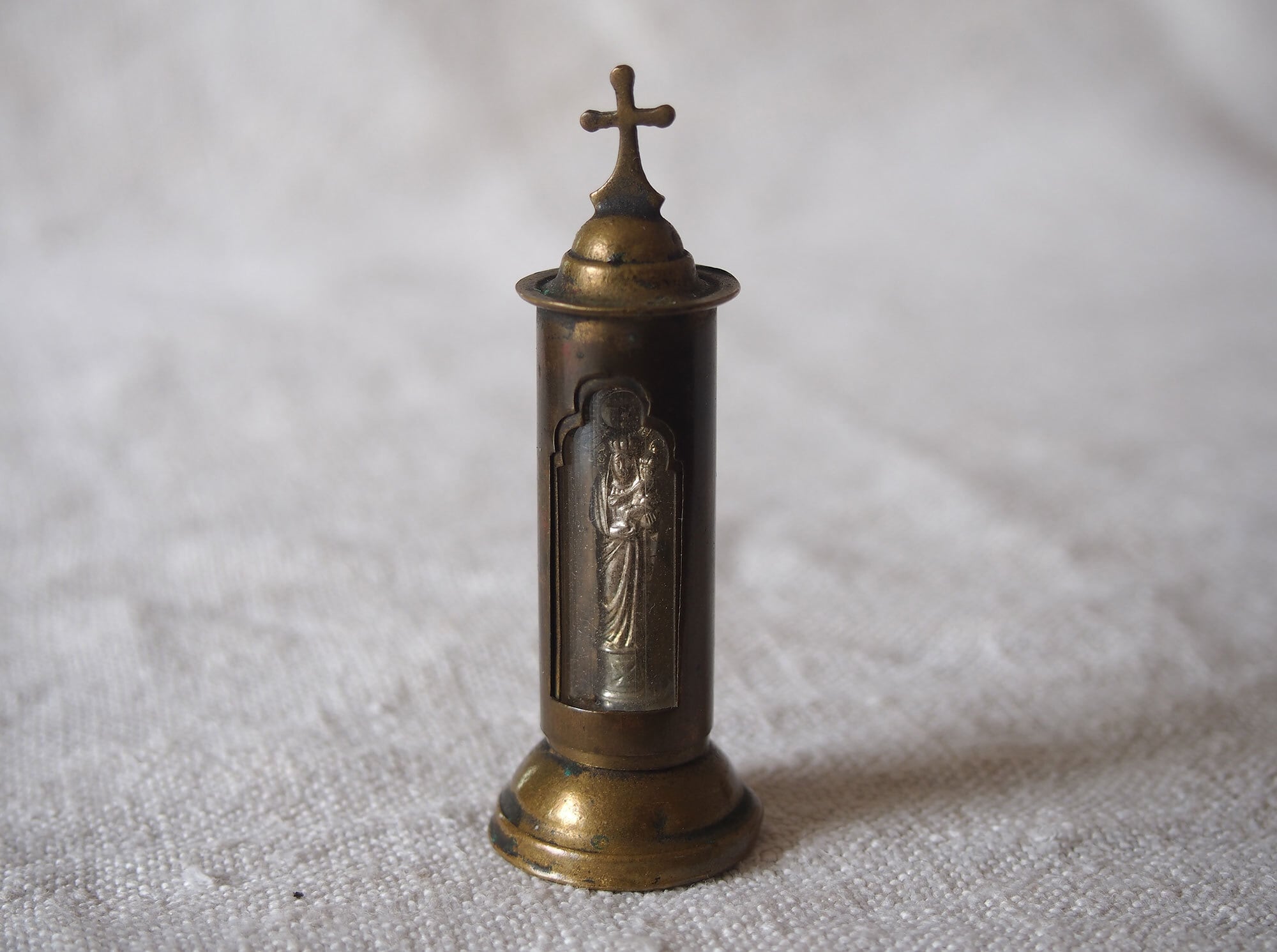 十字架付きの金属製ケースに、ガラス窓越しに聖人像を収めた小型のカトリック信心具です。1880〜1910年頃。上部の十字架も含めた高さ約6.5cmで、携帯用または個人の祈りのために用いられていたものと思われます。聖母は冠を被り左手に幼子を抱えています、聖母の足元にはマルタ十字があります。このタイプはフランス部〜南ドイツ圏(アルザス/バイエルン)で非常に多いです。金属部分には経年によるくすみや変色が見られ、アンティークならではの風合いがあります。中に入っているガラスの筒にダメージがあります、写真でご確認ください。背面に回転させれば正面からは見えなくなります。古い物と言う事をご理解の上のご入札をお願い致します。