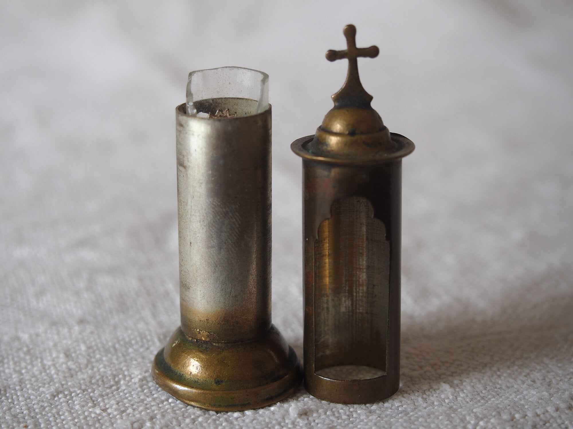 カトリック信心具 小さな十字架付き金属ケース 冠を戴いた聖母子像 聖人像 ガラス窓 民藝 聖遺物 アンティーク/K430