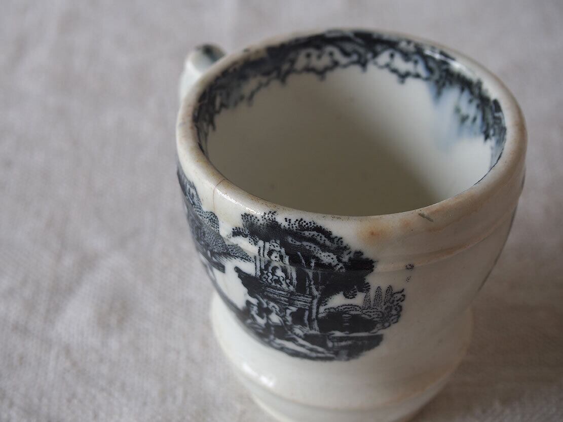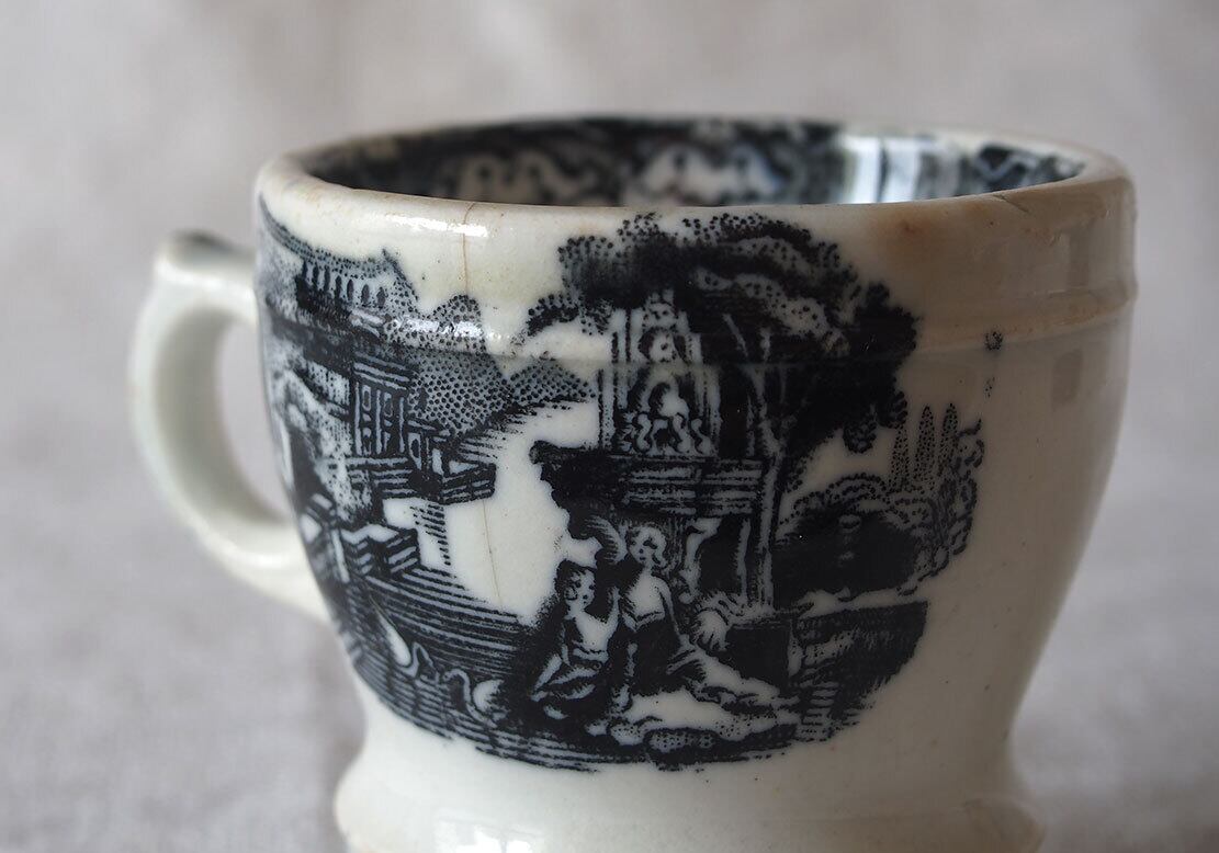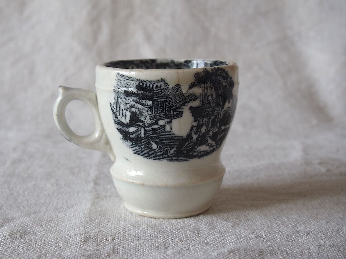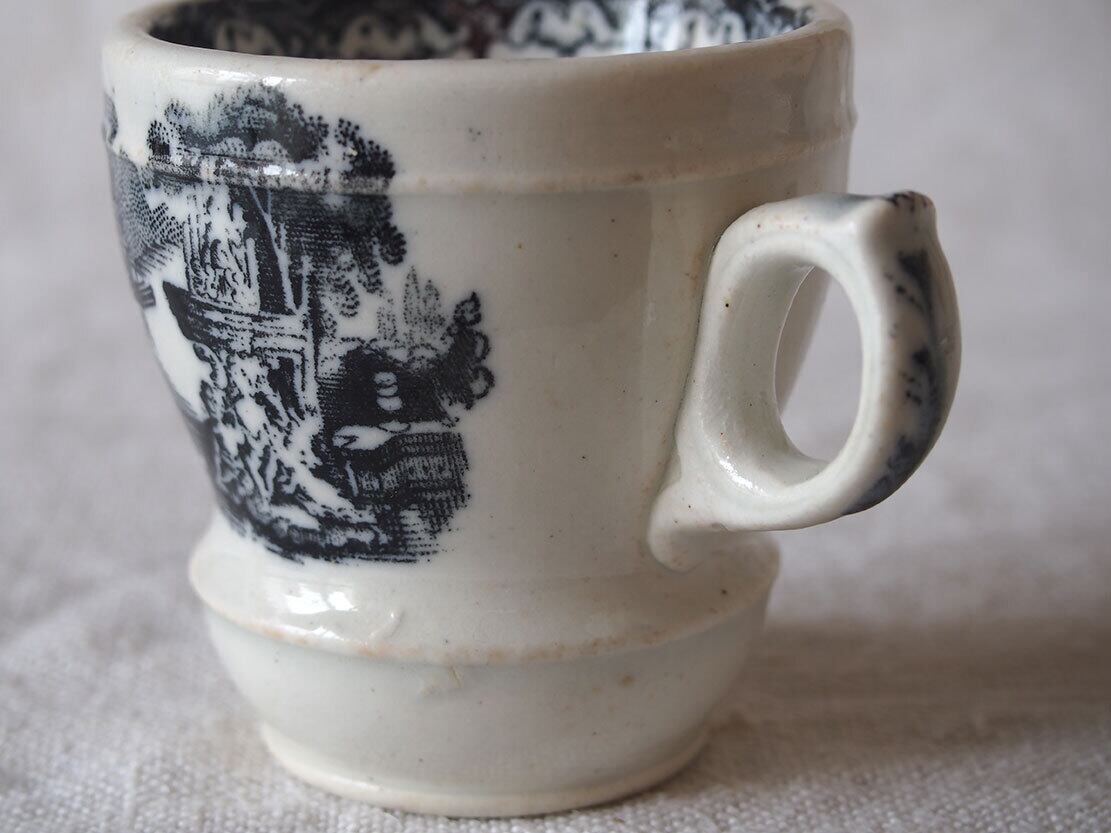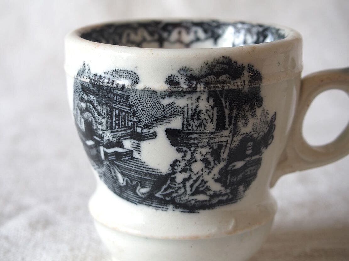 ヨーロッパで入手。ブラック・トランスファーウエァのカップ、19世紀後半〜20世紀初頭頃、スペインで作られた転写絵付けの陶器カップ。1841年創業、英国人のピックマンによってセビリアの修道院を利用して作られたスペインの古陶。1800年初頭に英国からの膨大な陶器製品のスペインへの輸入を禁止されたのち、スペイン国内で生産するために英国から多数のマイスターが派遣され指導したと言われています。水辺の館と水鳥、男女の紋様。ニュウや変色などあります、写真でよくご確認ください。コレクション、実用にもいかがでしょう。