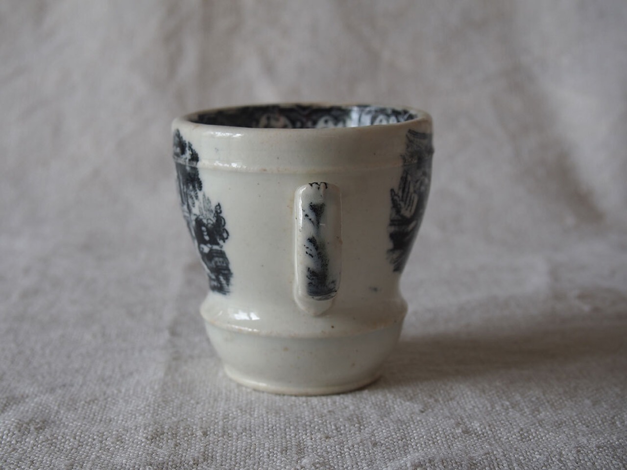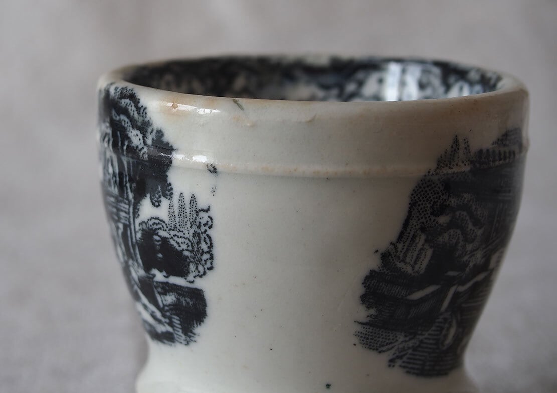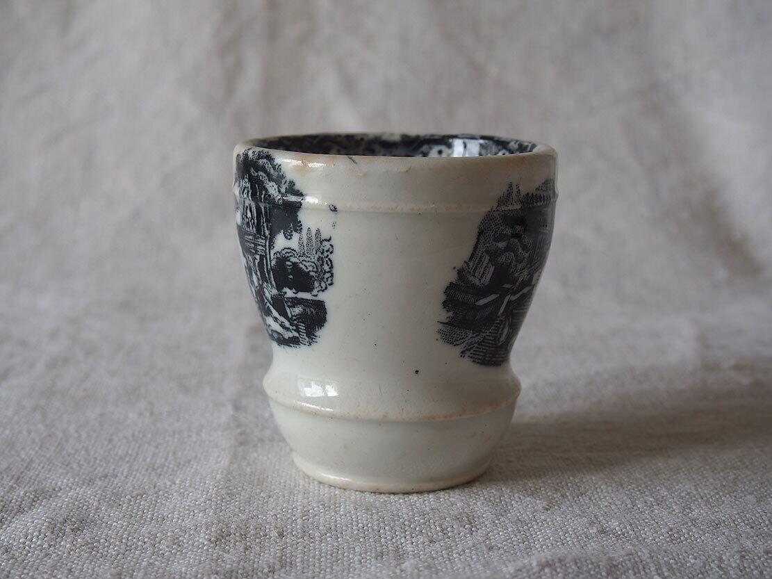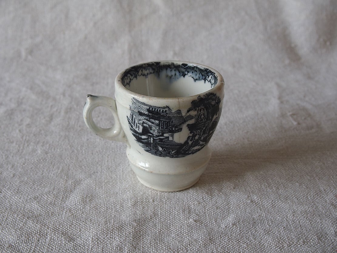 ヨーロッパで入手。ブラック・トランスファーウエァのカップ、19世紀後半〜20世紀初頭頃、スペインで作られた転写絵付けの陶器カップ。1841年創業、英国人のピックマンによってセビリアの修道院を利用して作られたスペインの古陶。1800年初頭に英国からの膨大な陶器製品のスペインへの輸入を禁止されたのち、スペイン国内で生産するために英国から多数のマイスターが派遣され指導したと言われています。水辺の館と水鳥、男女の紋様。ニュウや変色などあります、写真でよくご確認ください。コレクション、実用にもいかがでしょう。