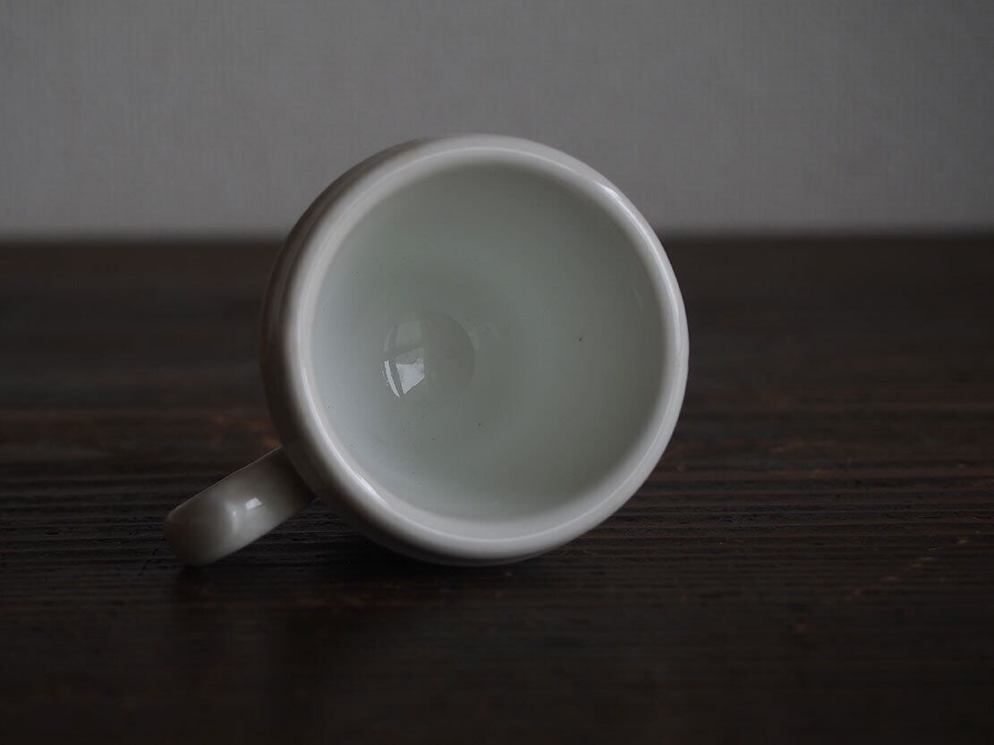 ヨーロッパの蚤の市で入手。1910年代ぐらい。おそらくスペイン、セビージャの陶器。すっぽり手になじむ小ぶりのカップ。わずかに青味を帯びた釉薬。黄ばみ、製造時にできた亀裂などあります、写真でご確認いただけます。コレクション、実用にもいかがでしょう。