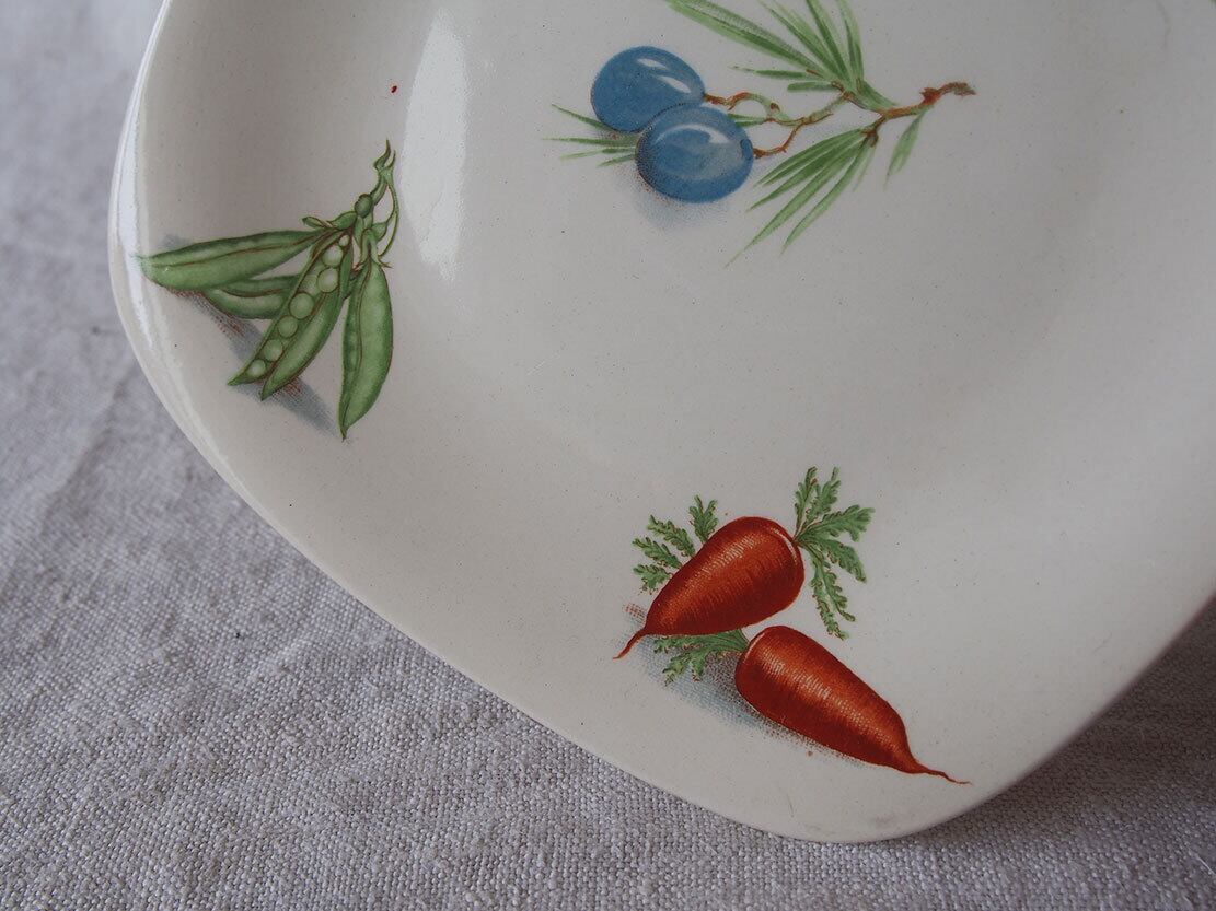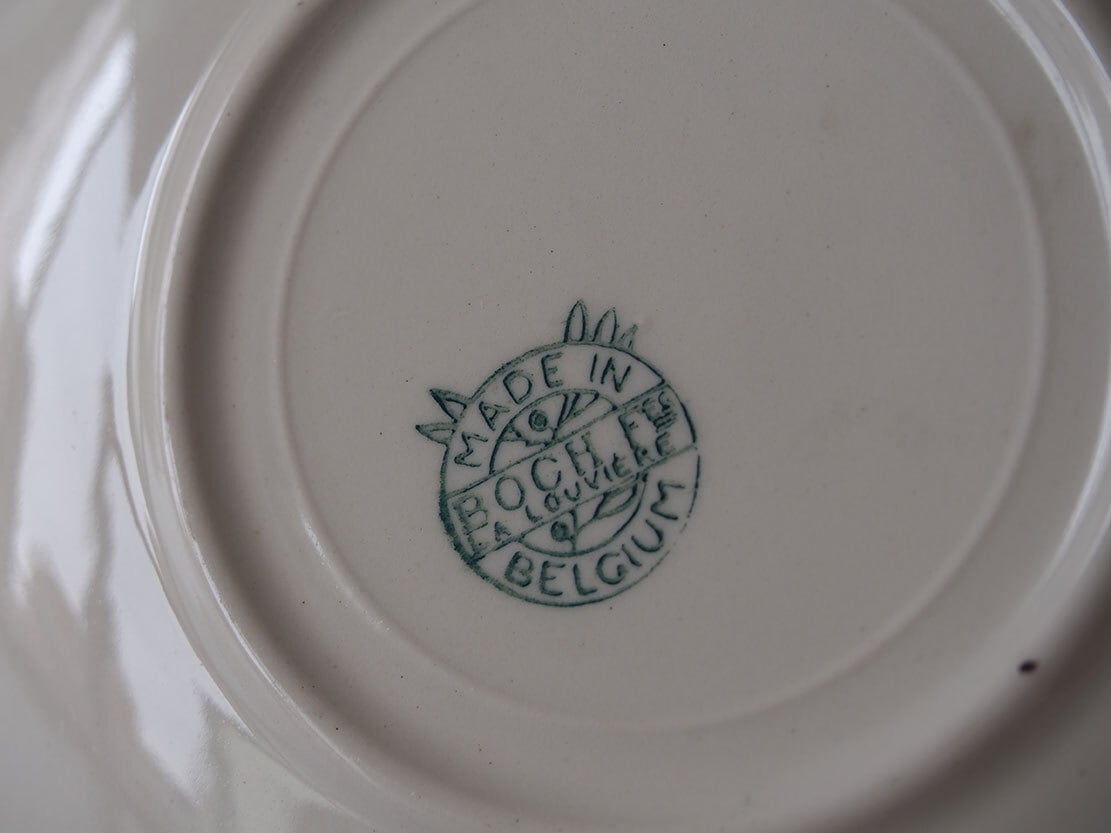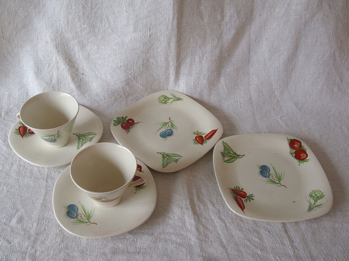 ヨーロッパの蚤の市で入手。1950年代。カップ&ソーサー2組とケーキプレート2枚のセット。2人用デザートセット。MADSE IN BELGIUM BOCH Frres La Louvireのバックスタンプ。Lgumes(レギューム / 野菜)シリーズのようです。特に目立つダメージはみあたりません、詳細は写真でご確認いただけます。コレクション、実用にもいかがでしょう。バラ売りはいたしません。