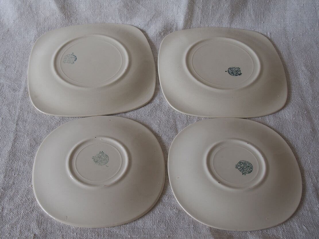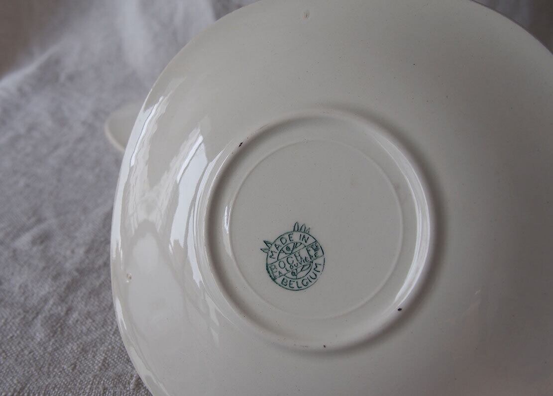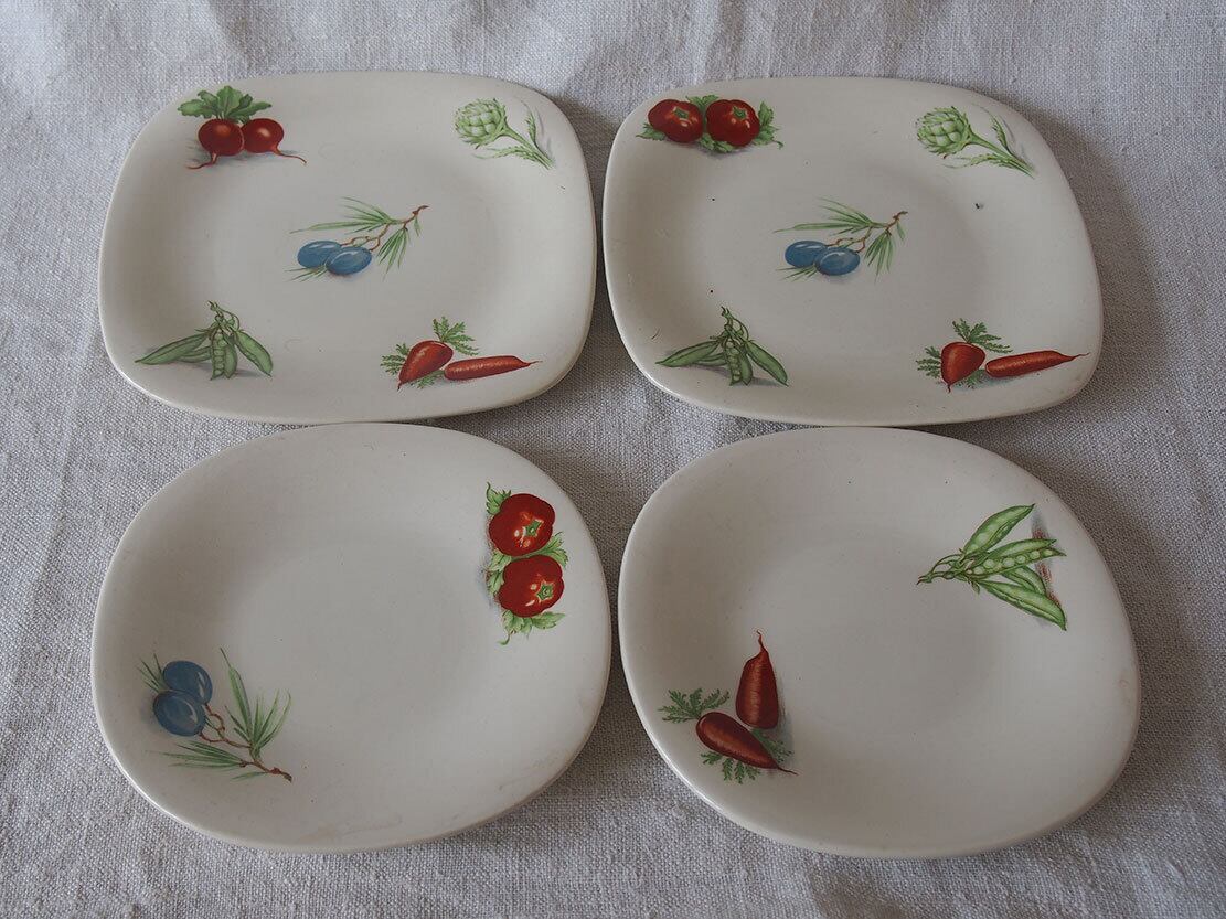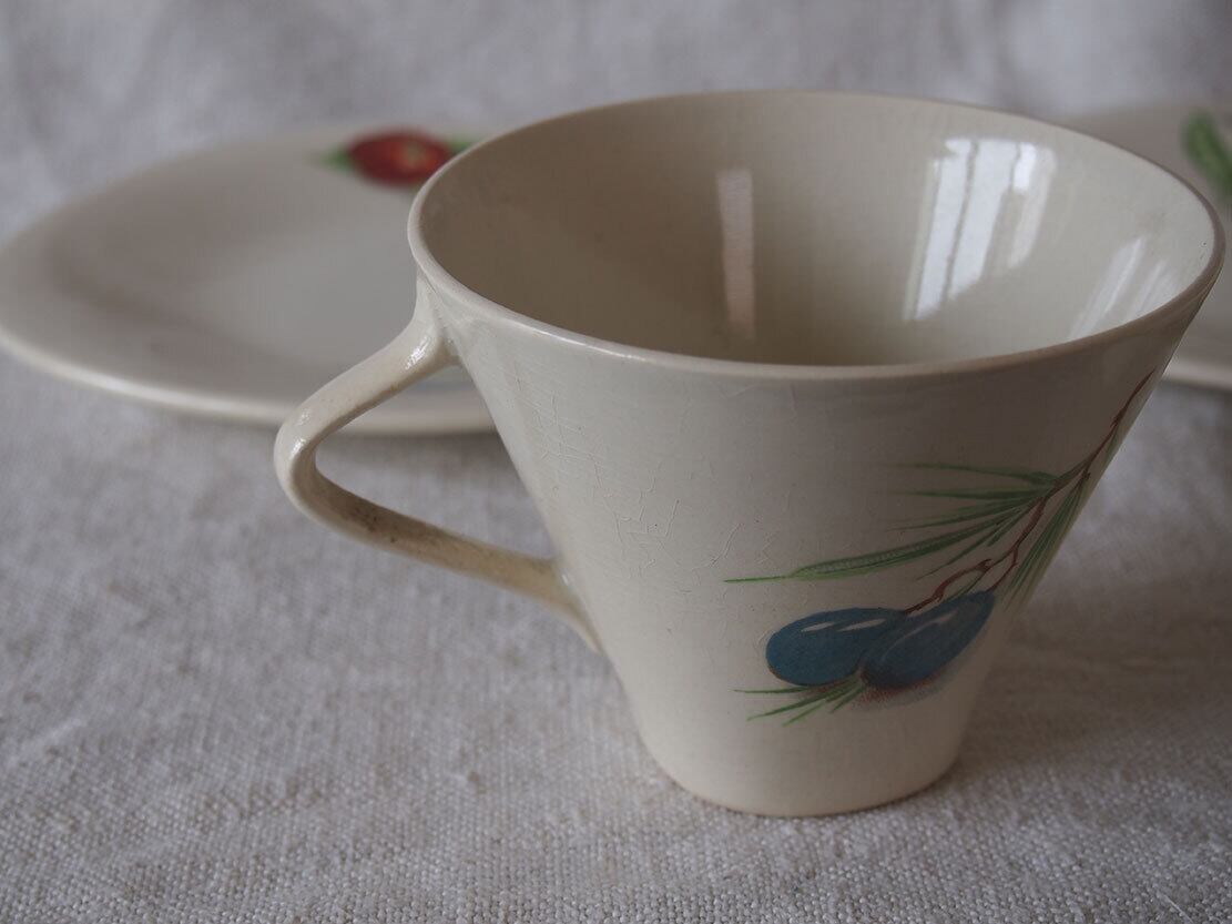 ヨーロッパの蚤の市で入手。1950年代。カップ&ソーサー2組とケーキプレート2枚のセット。2人用デザートセット。MADSE IN BELGIUM BOCH Frres La Louvireのバックスタンプ。Lgumes(レギューム / 野菜)シリーズのようです。特に目立つダメージはみあたりません、詳細は写真でご確認いただけます。コレクション、実用にもいかがでしょう。バラ売りはいたしません。