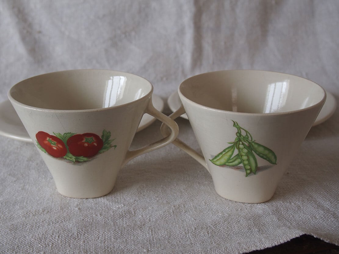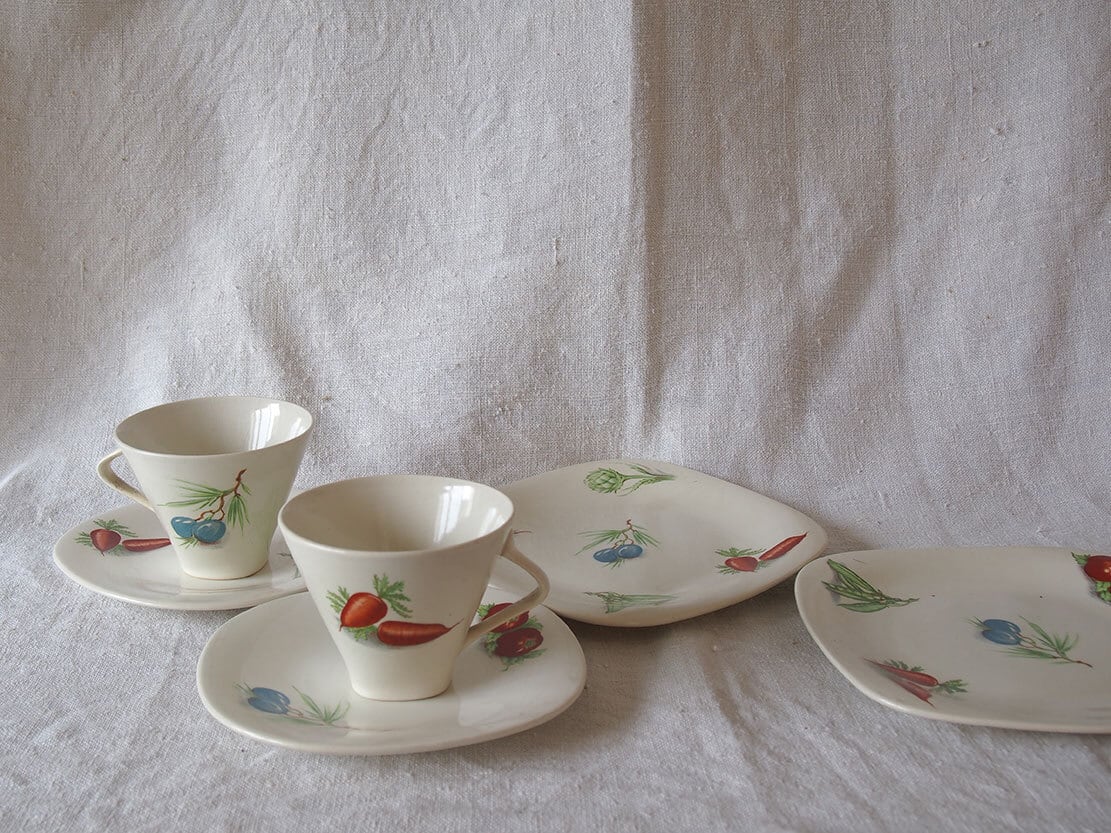 野菜の柄のカップ&ソーサー2組+ケーキプレート2枚 ベルギー 陶器 1950年代 アフタヌーンティ ヴィンテージ/K446