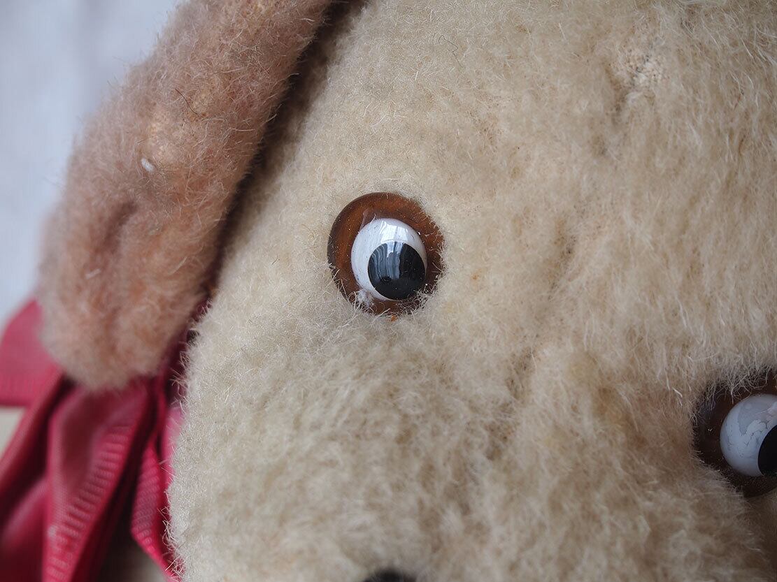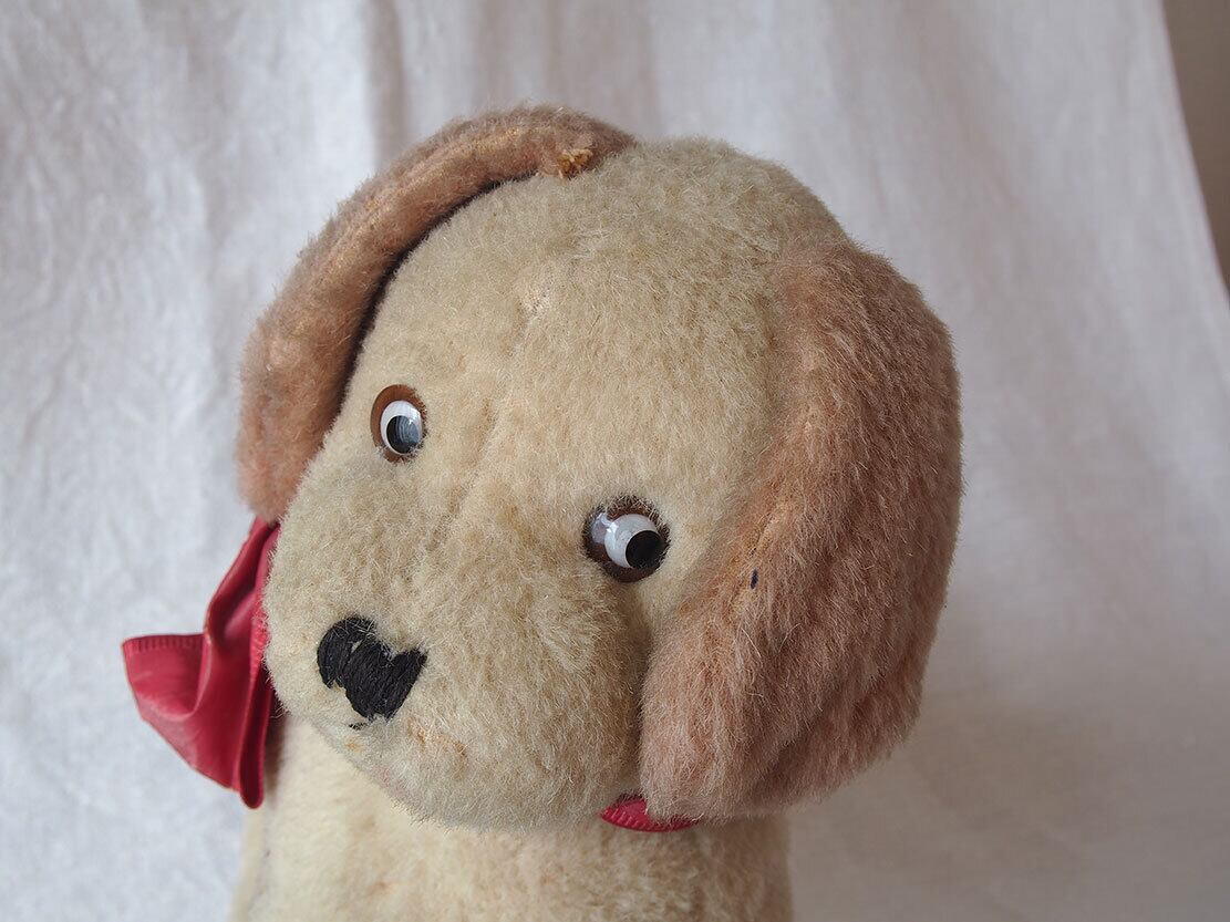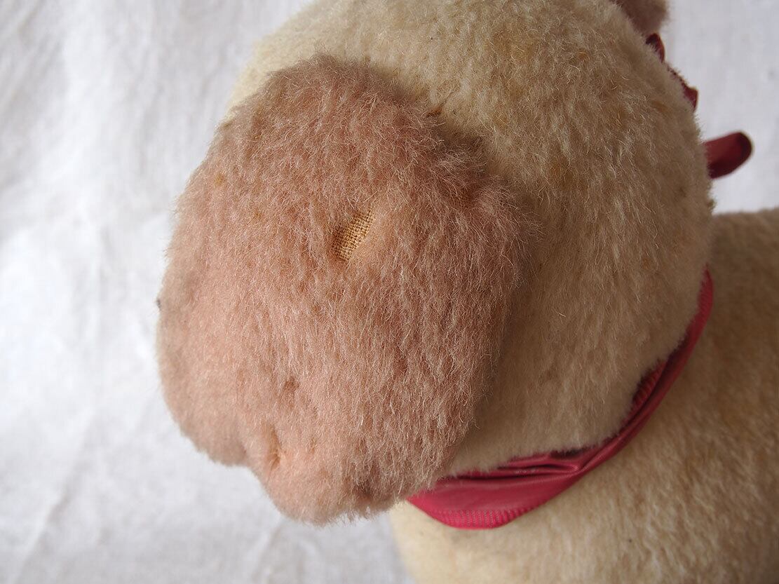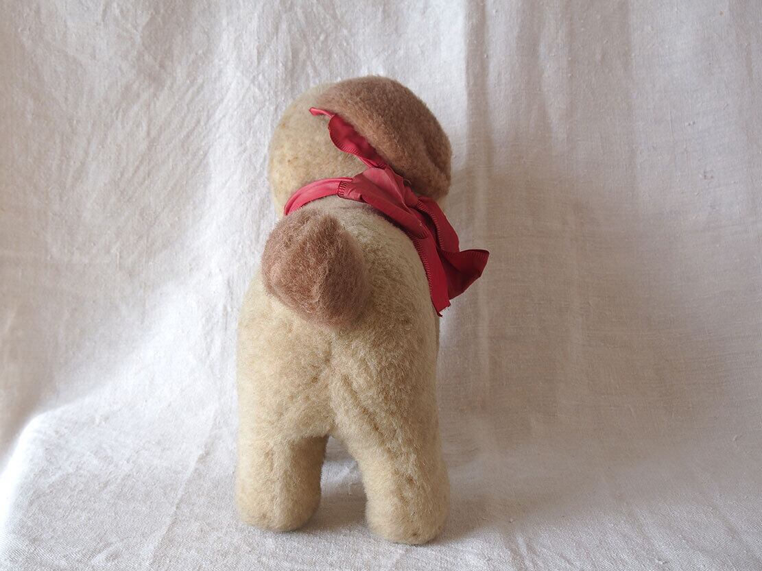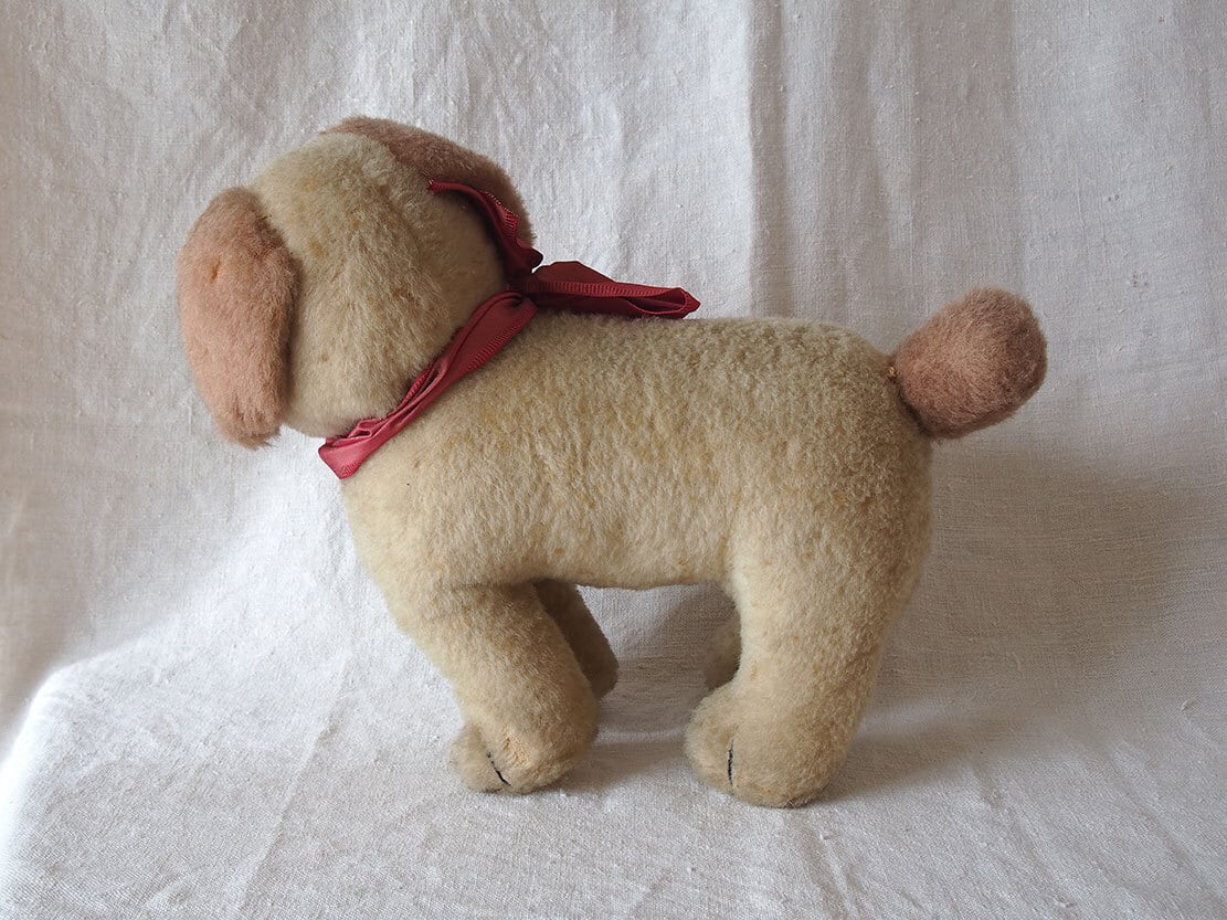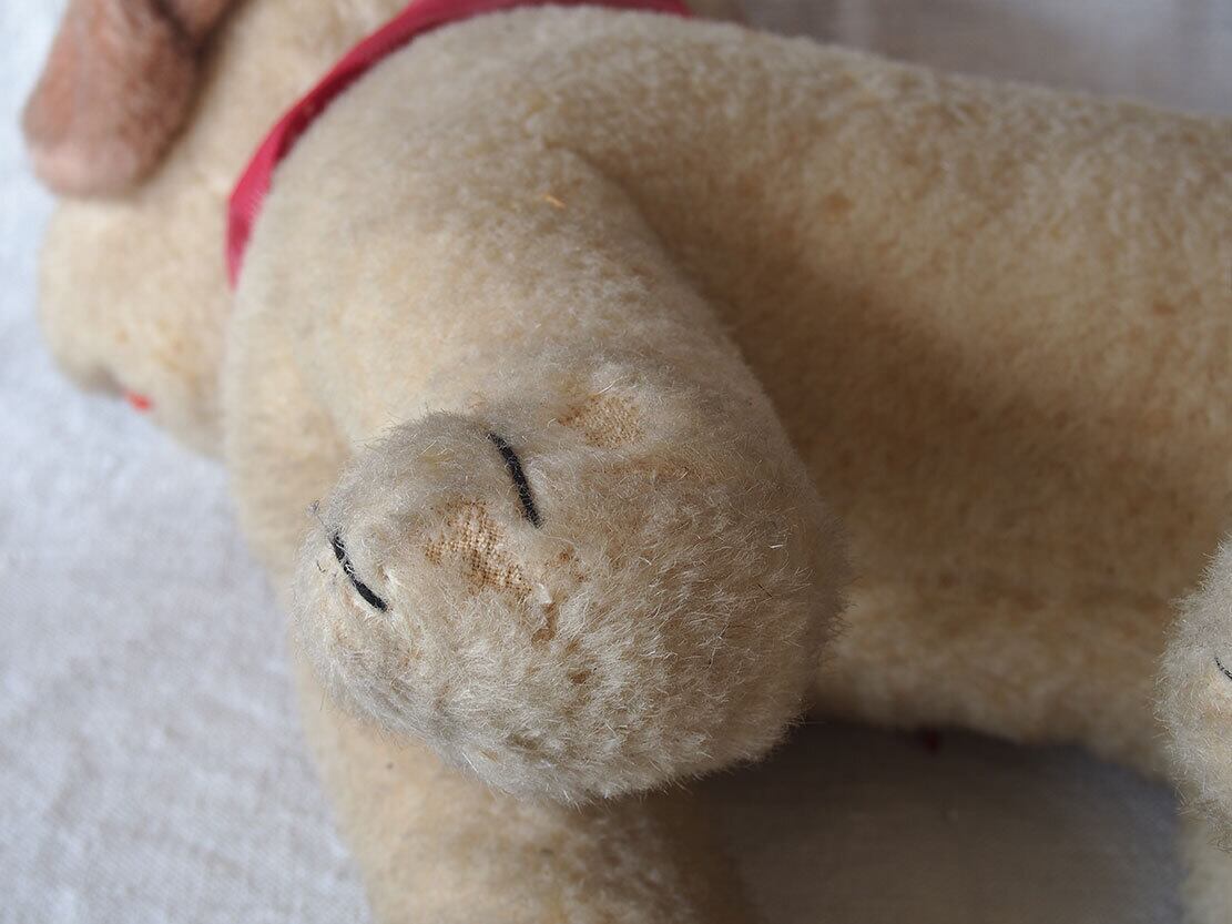 ウール(モヘア系)素材で作られた、ヨーロッパのヴィンテージドッグです。白目のあるグラスアイ使用しています、1920〜1930年代ぐらい。経年による毛並みの擦れ虫食いや使用感は見られますが、オリジナルの風合いを保ったヴィンテージコンディションです。ブラッシング程度の手入れをしてあります。