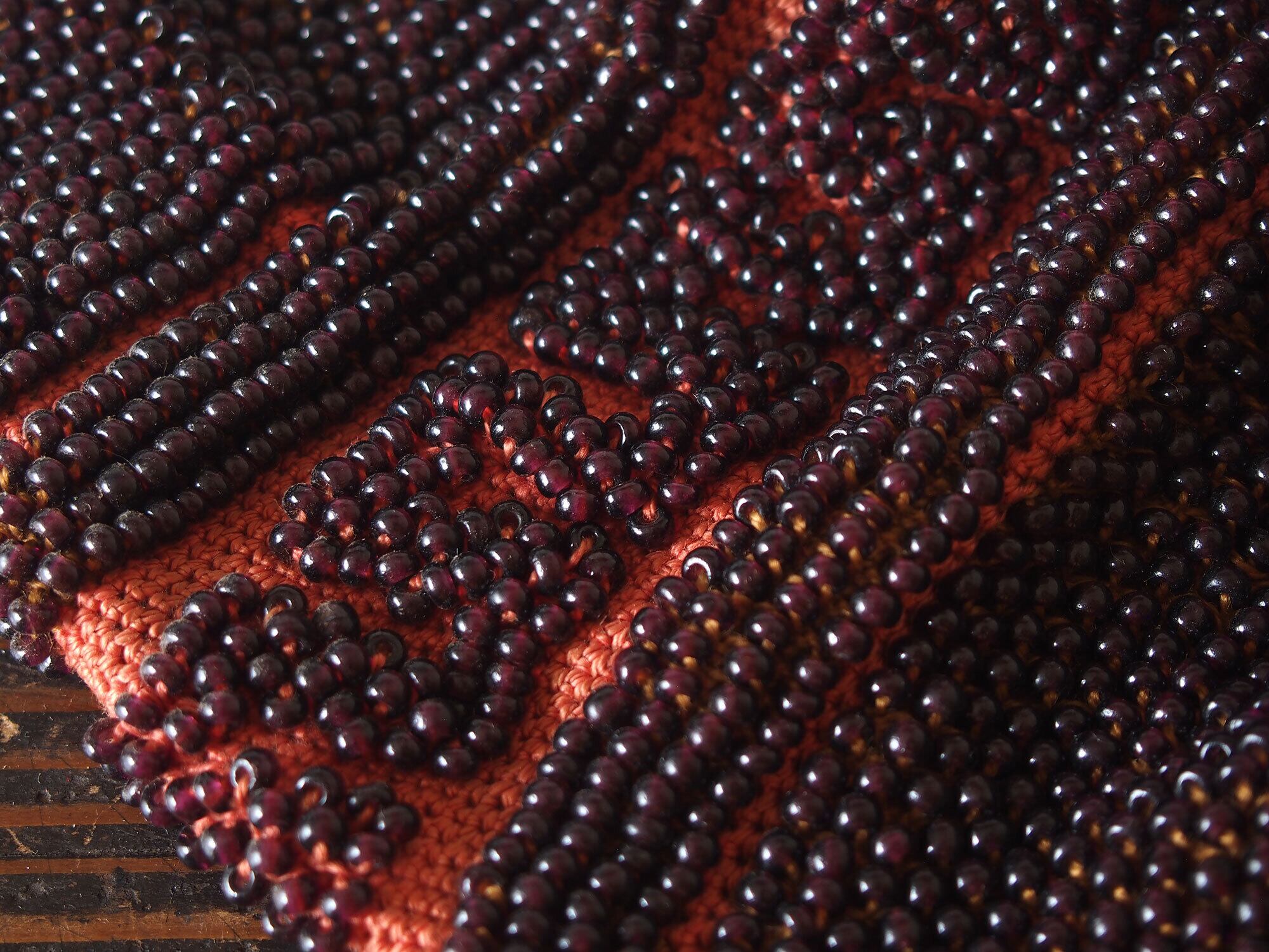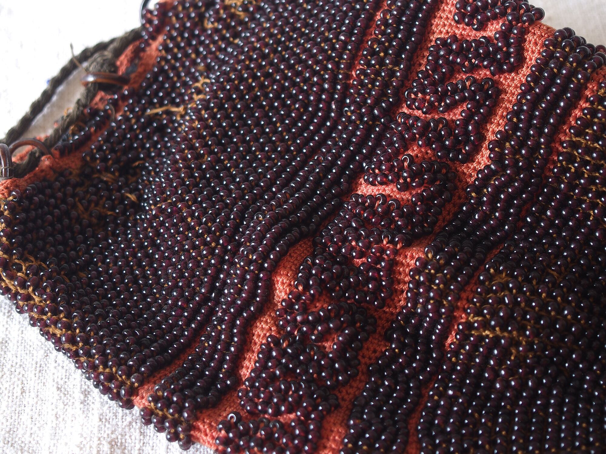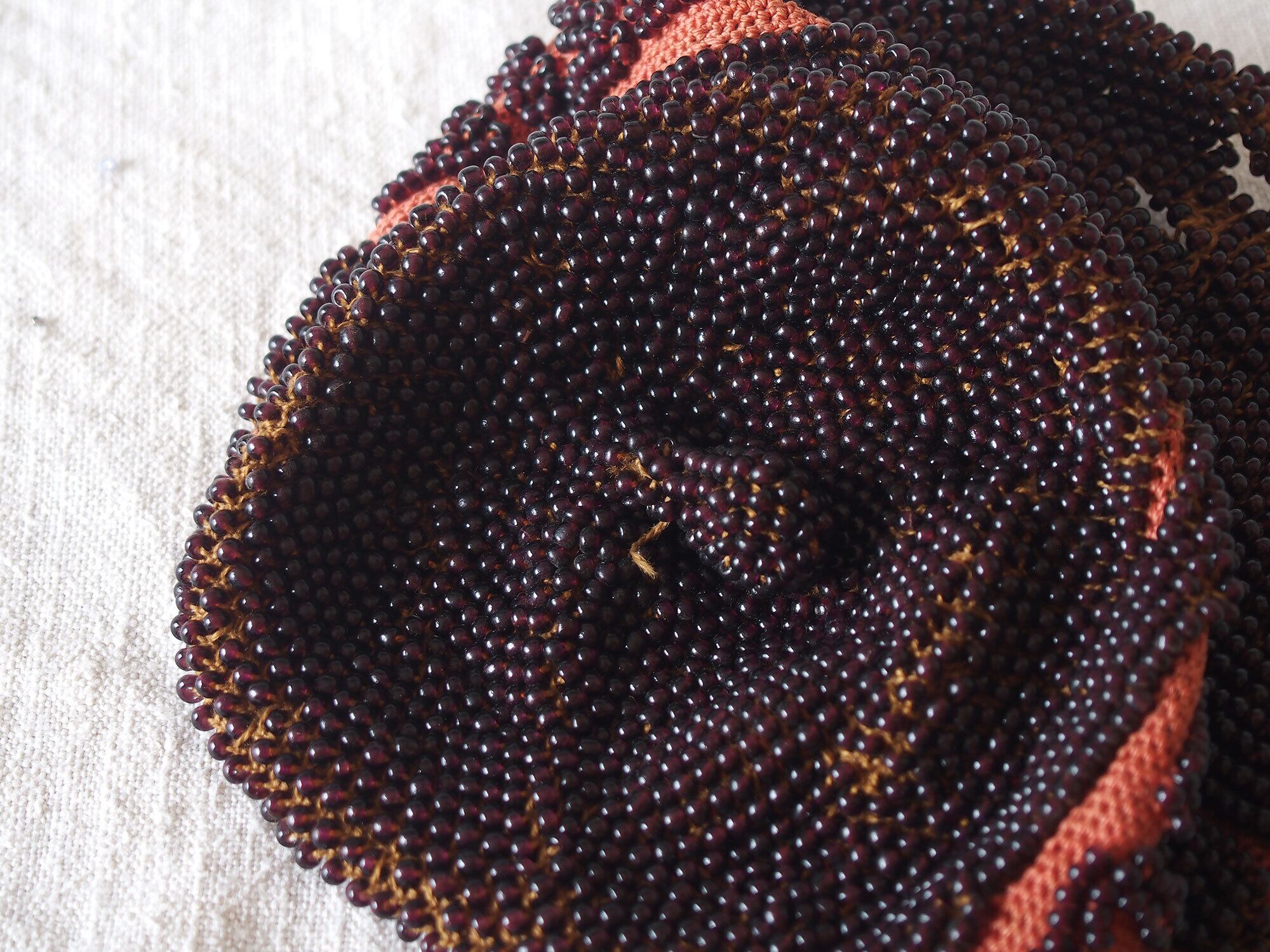 ●サイズ: 口幅16cm 長さ18m+底の丸い飾り1.8cm ビーズ約2mm 201g ●材質:ガラスビーズ、綿など