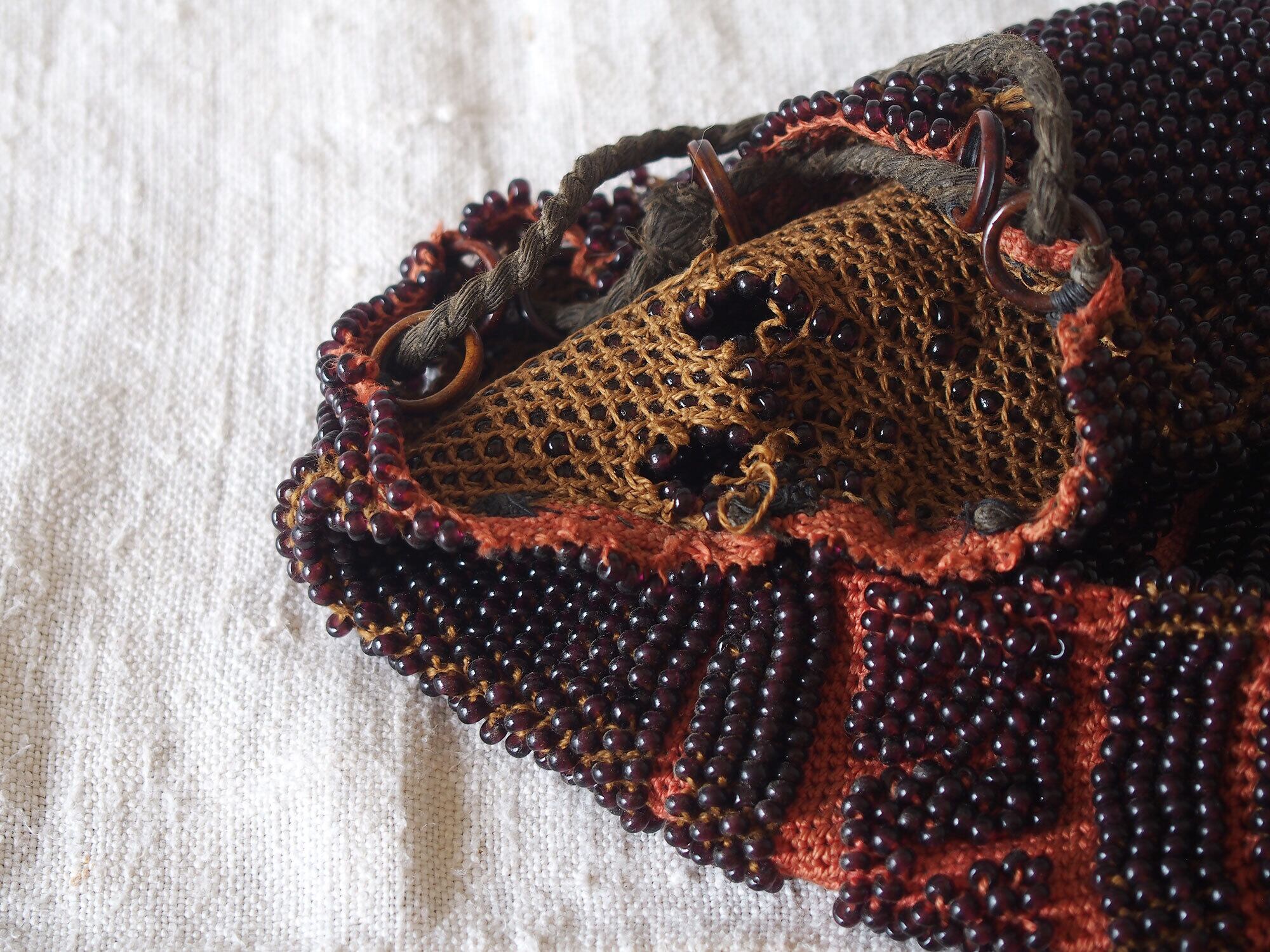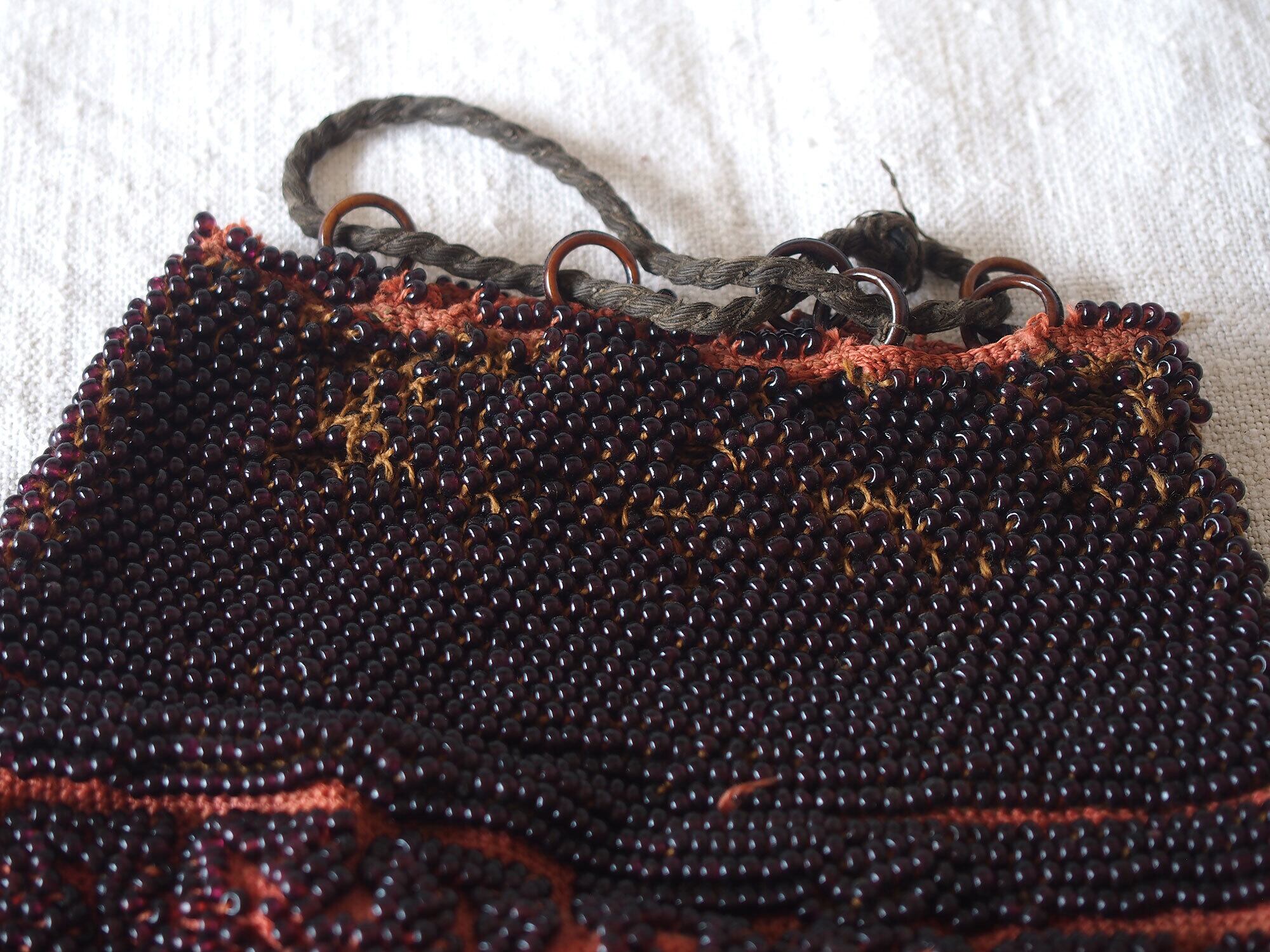 欧州のアンティーク市で入手。美しいガラスビーズで全面に刺繍が施された、19世紀末〜20世紀初頭およそ1890〜1910年代のアンティーク・ビーズパースです。口には古い樹脂のリングに紐を通してあり、底部にはビーズ装飾のボール状チャームが付いています。口の部分にダメージあります。ドールのバッグやデザインなどの参考資料、部品取りにもいかがでしょう。写真を多数用意し、状態をきちんと確認できるように努めていますので、ノークレーム・ノーリターンでおねがいします。詳細は写真でご確認いただけます。古い物だと言う事をご理解の上のご入札をお願い致します。材質及び年代の判定は困難な場合があります、差異についてはあらかじめご了承下さい。アンティークドールの小物などにも。