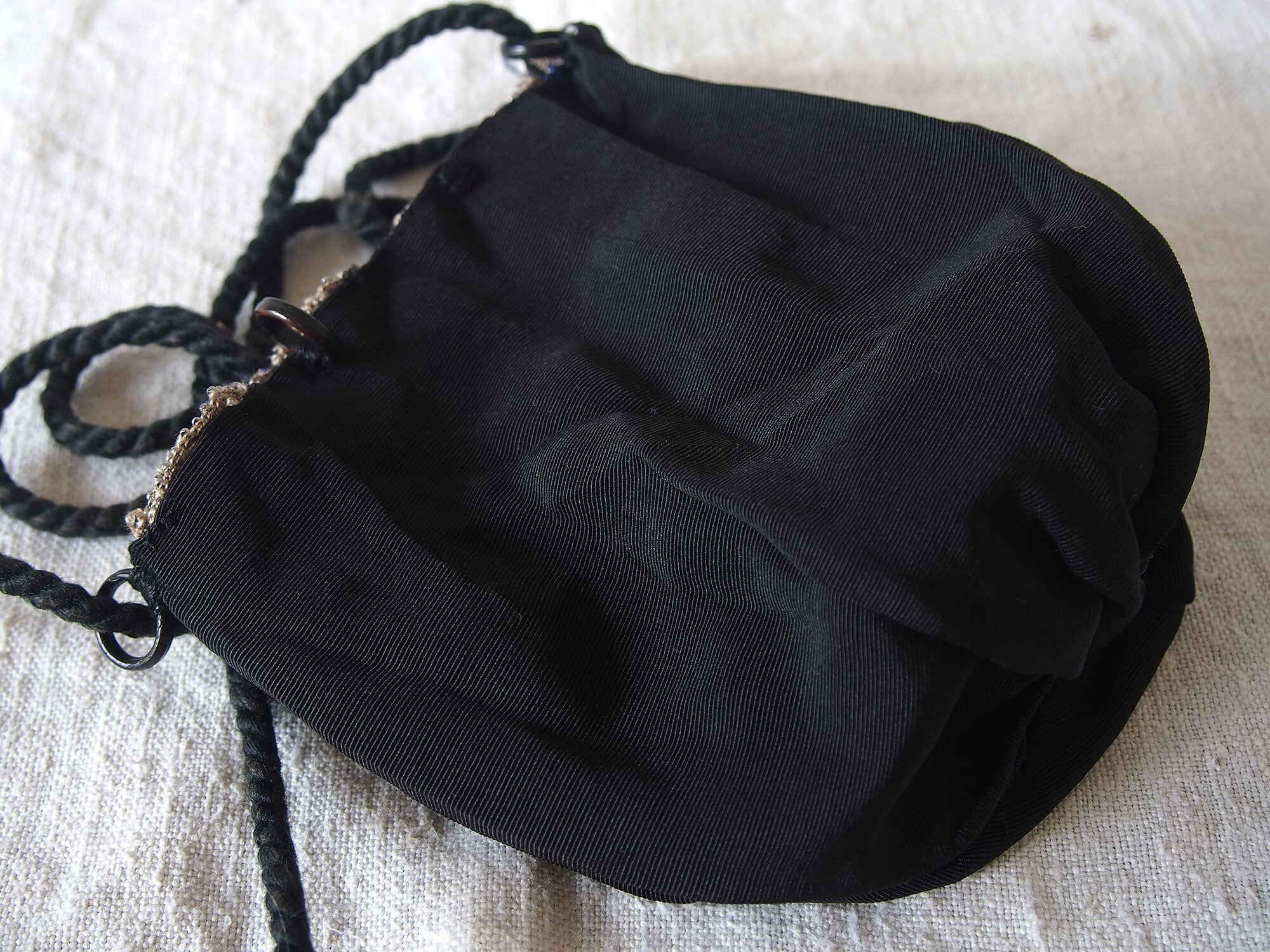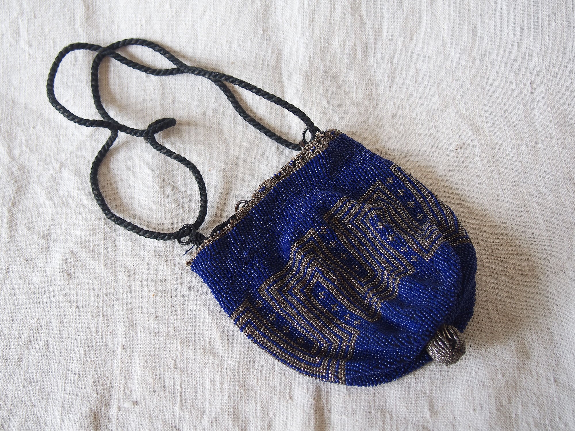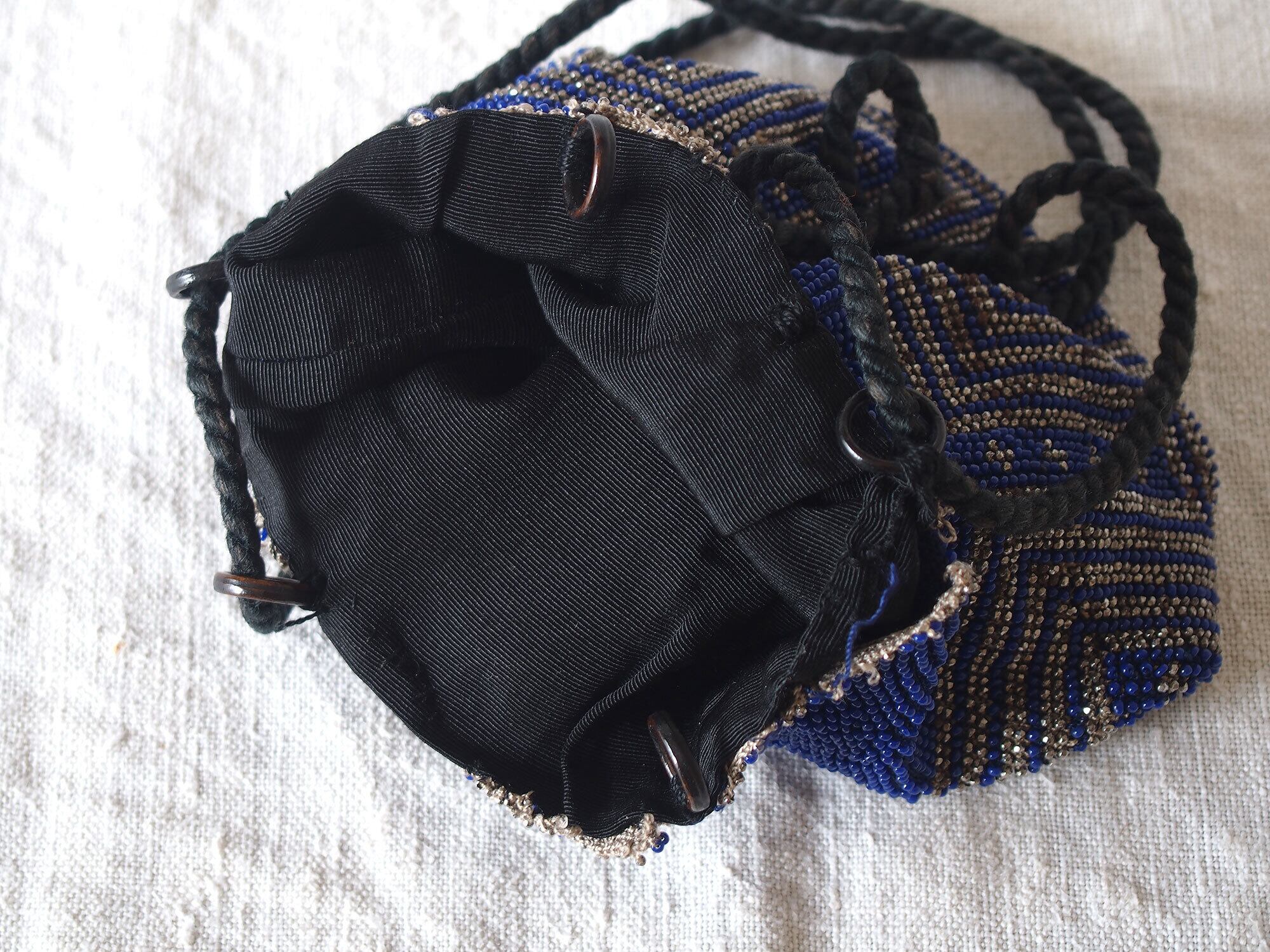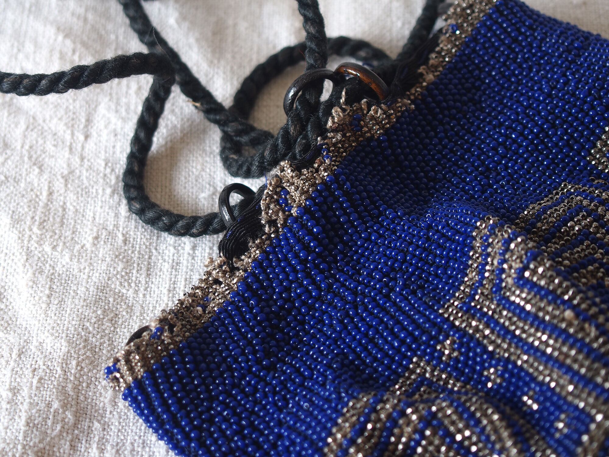 ガラスビーズ刺繍パース ドローストリング ブルー×シルバー ヴィクトリアン 巾着バッグ マイクロガラスビーズ アンティーク 時代衣装/ K390