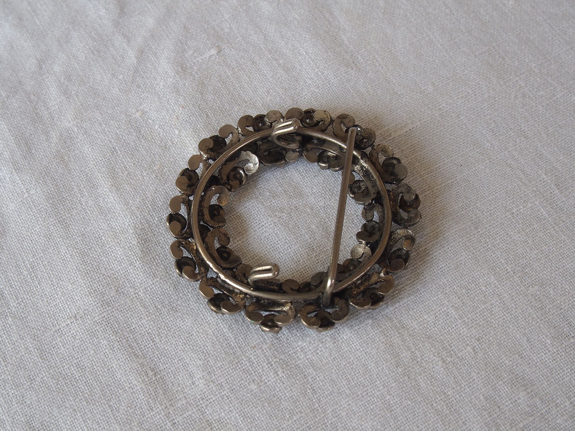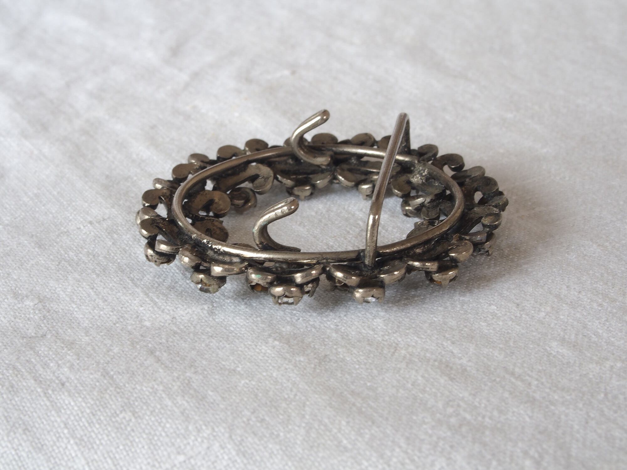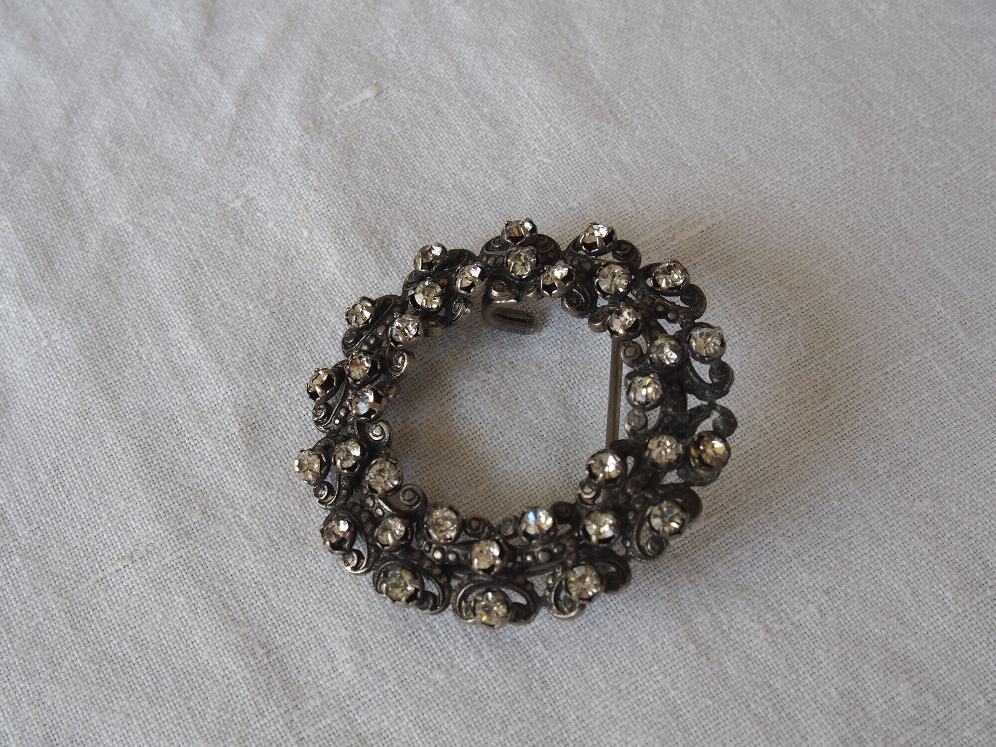 ヨーロッパのアンティーク市にて入手、1925〜1935頃。アンティークの円形ラインストーンのベルトバックル、またはシューズ用バックル、またはブローチです。リースのような円形デザインに、小さなラインストーンが多数セットされています。透かしのスクロール装飾が美しく、20世紀初頭のエレガントなスタイルを感じさせるデザインです。石の欠損はないようです。アンティーク品のため、経年による風合いがあります。状態は写真をご確認ください。