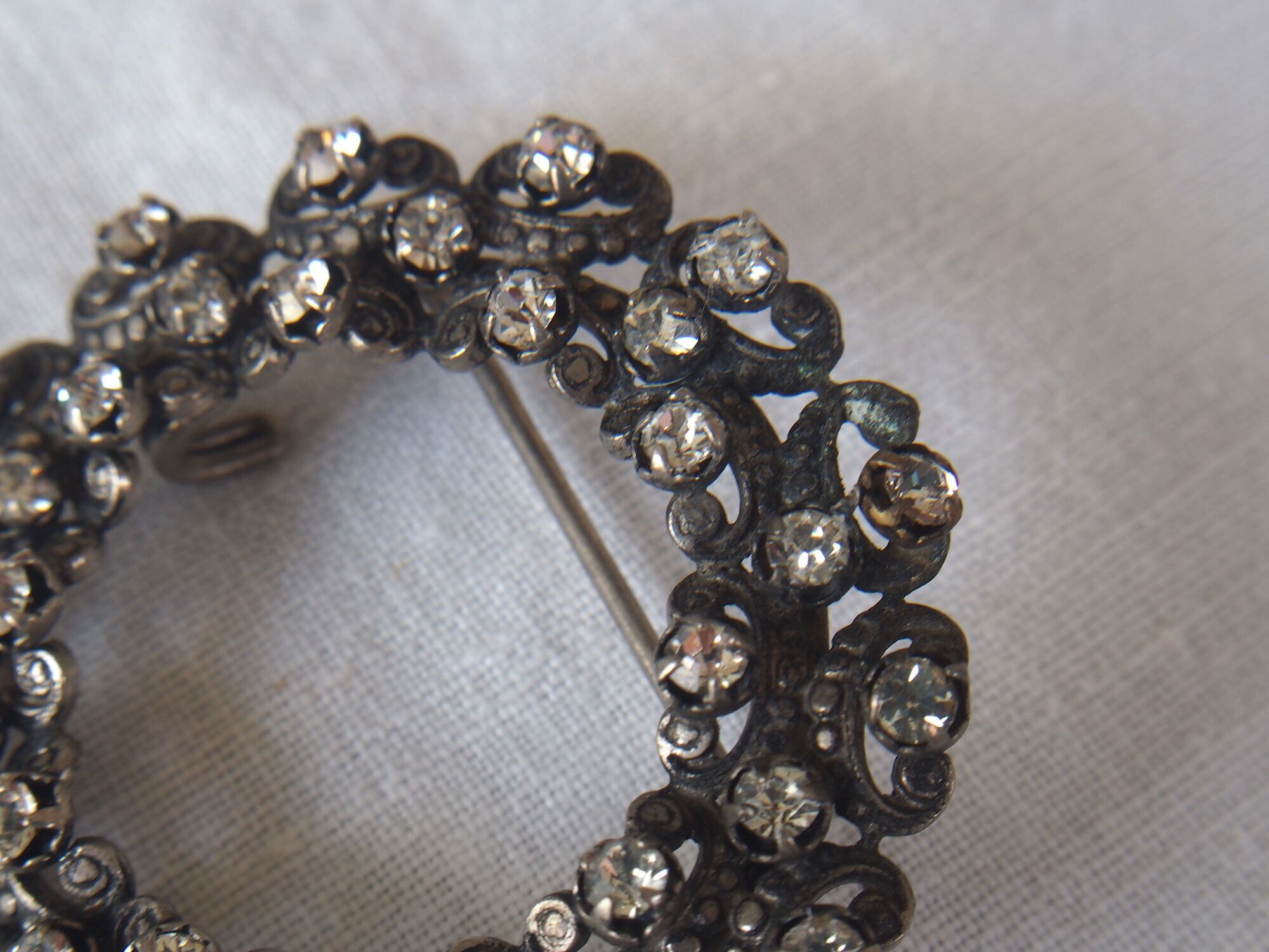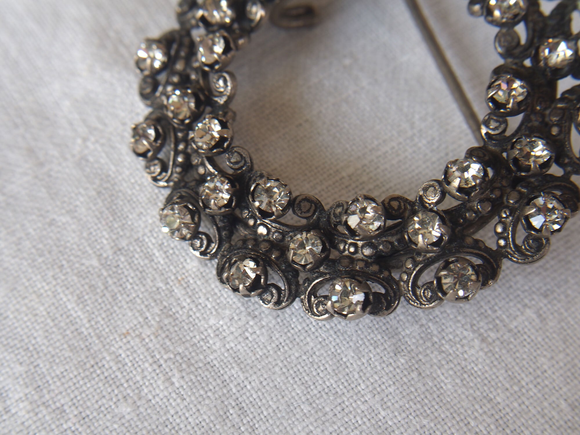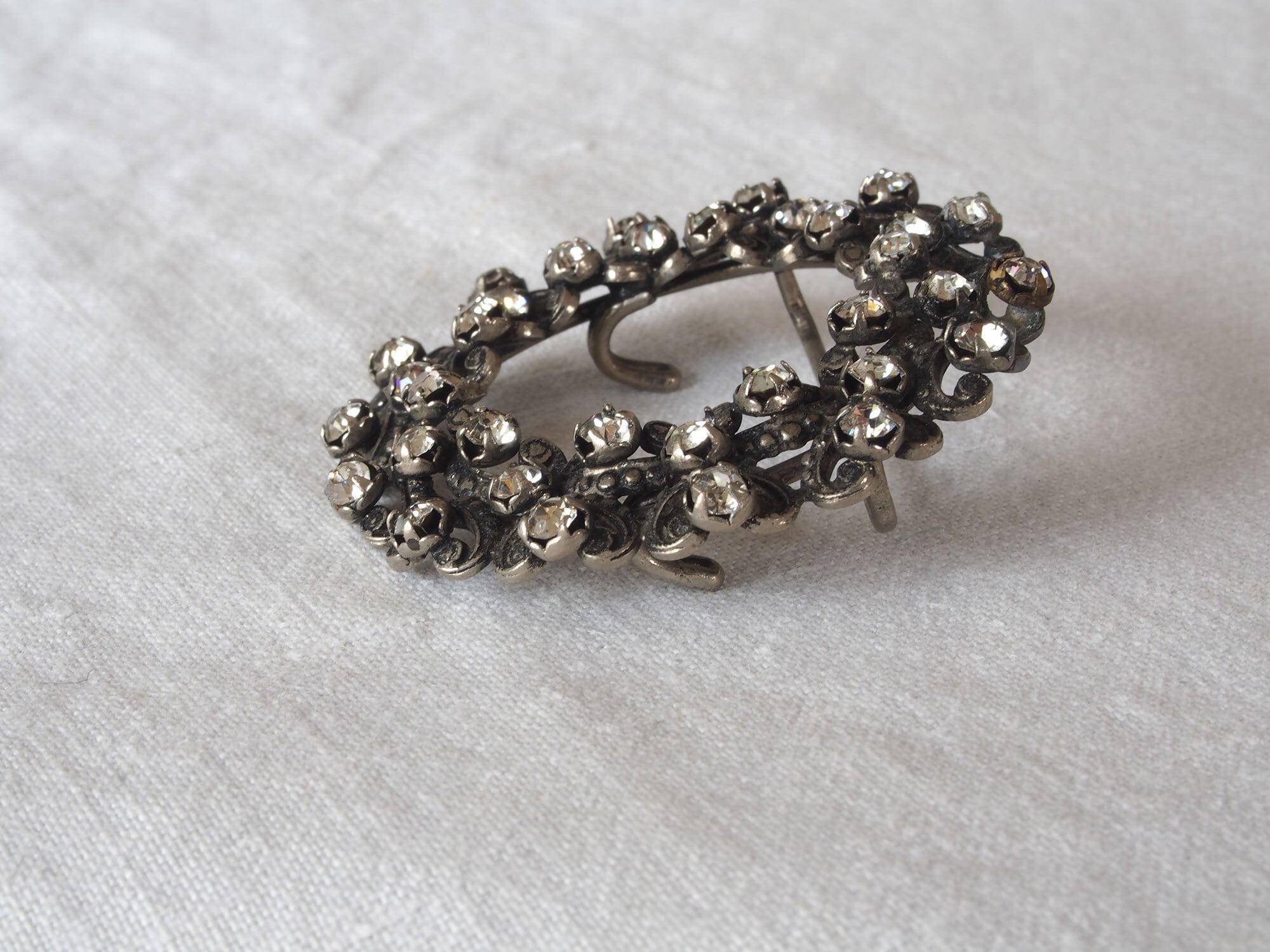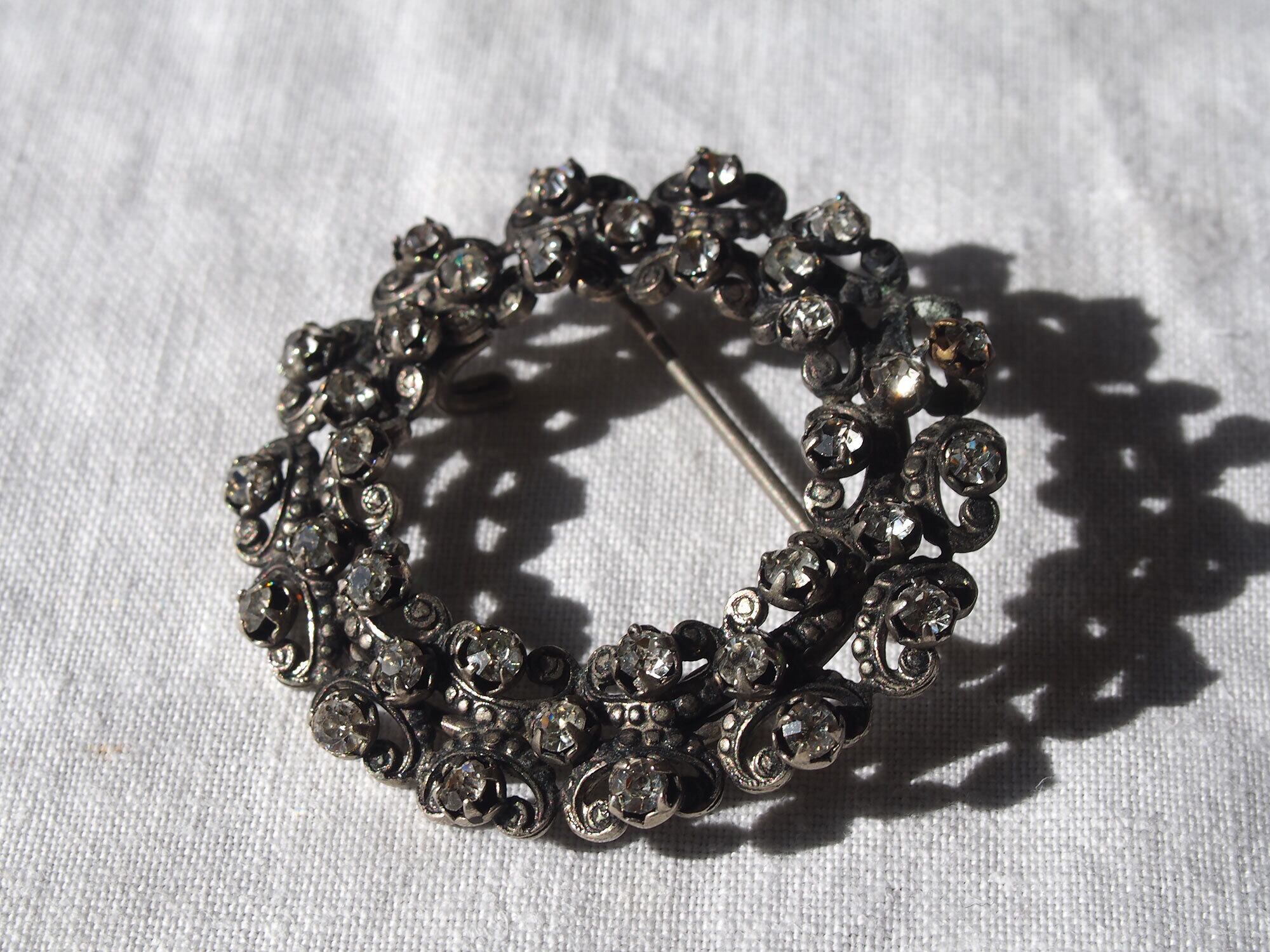 ヨーロッパのアンティーク市にて入手、1925〜1935頃。アンティークの円形ラインストーンのベルトバックル、またはシューズ用バックル、またはブローチです。リースのような円形デザインに、小さなラインストーンが多数セットされています。透かしのスクロール装飾が美しく、20世紀初頭のエレガントなスタイルを感じさせるデザインです。石の欠損はないようです。アンティーク品のため、経年による風合いがあります。状態は写真をご確認ください。