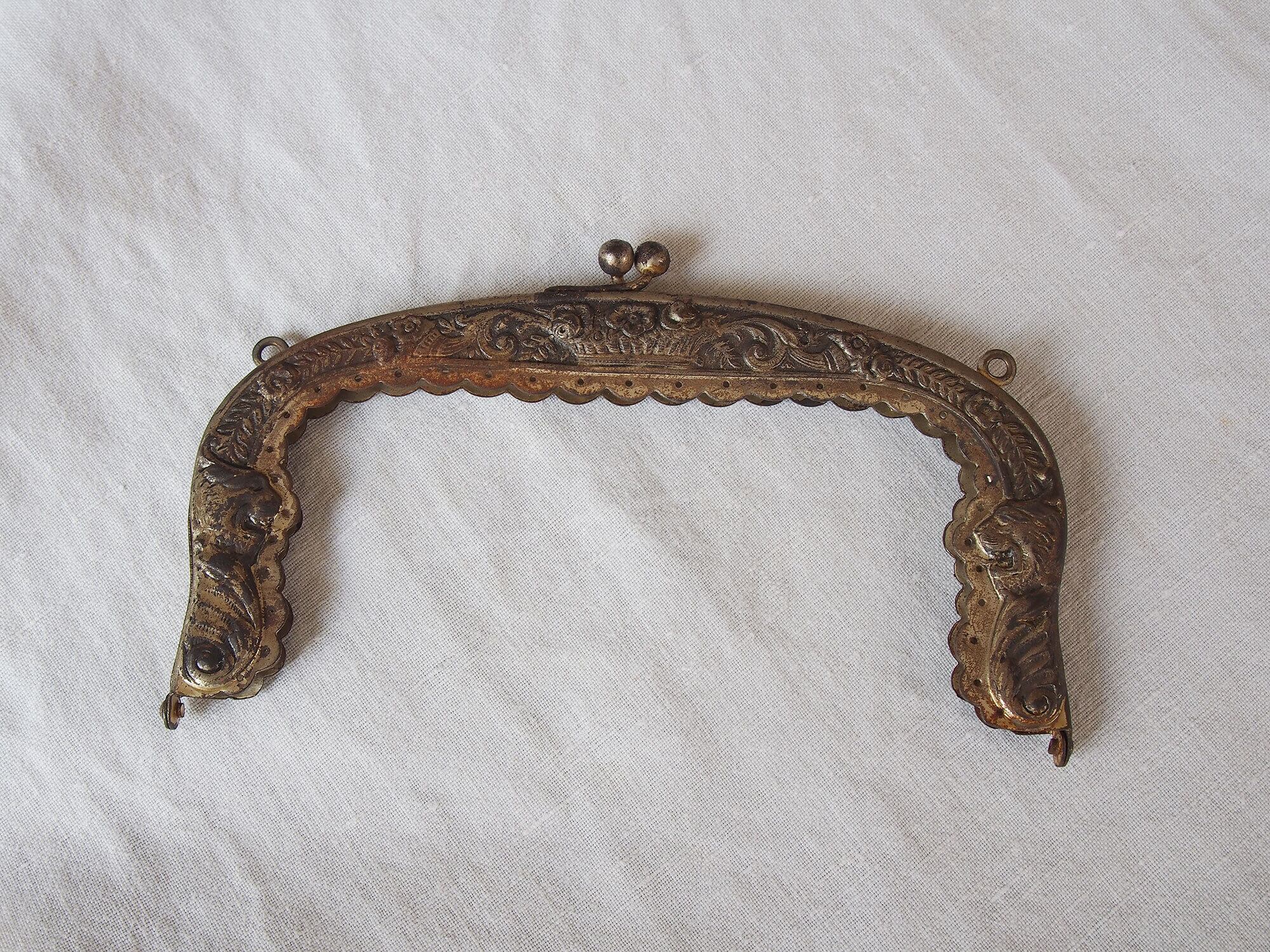 欧州のアンティーク市で入手。1890年〜1910年ぐらいのものと思われます。小さなハンドバッグやコインパースに使われていた口金で、内側にはバッグを縫い付けるための穴があります。ご覧のようにサビがあります。詳細は写真でご確認いただけます。古い物だと言う事をご理解の上のご入札をお願い致します。材質及び年代の判定は困難な場合があります、差異についてはあらかじめご了承下さい。アンティークドールの小物などにも。