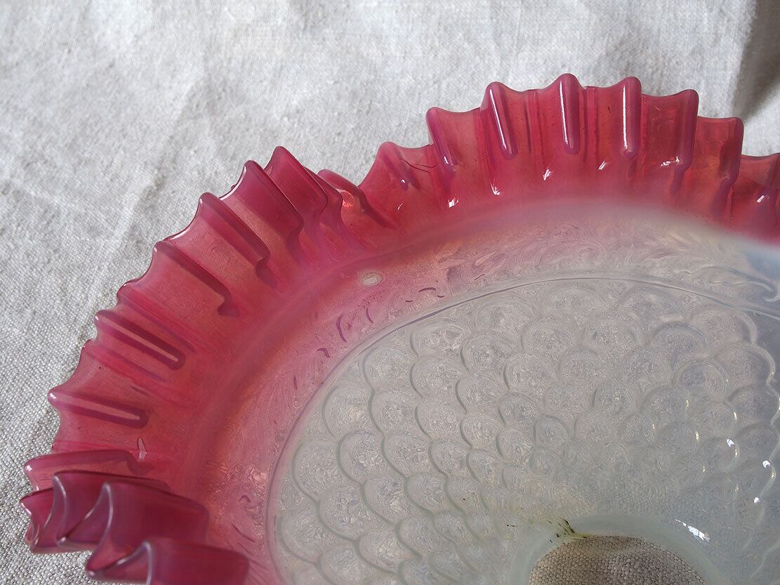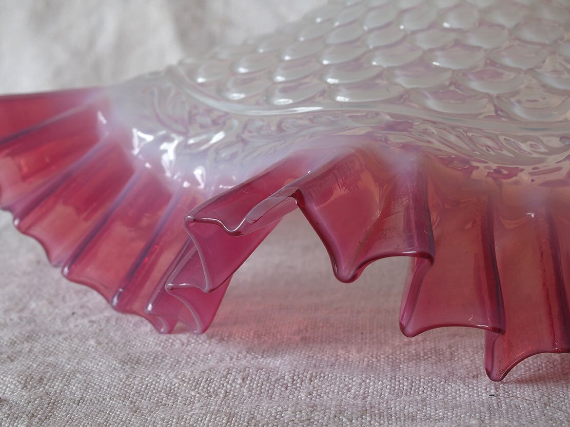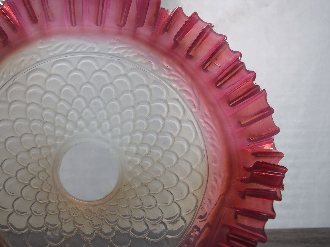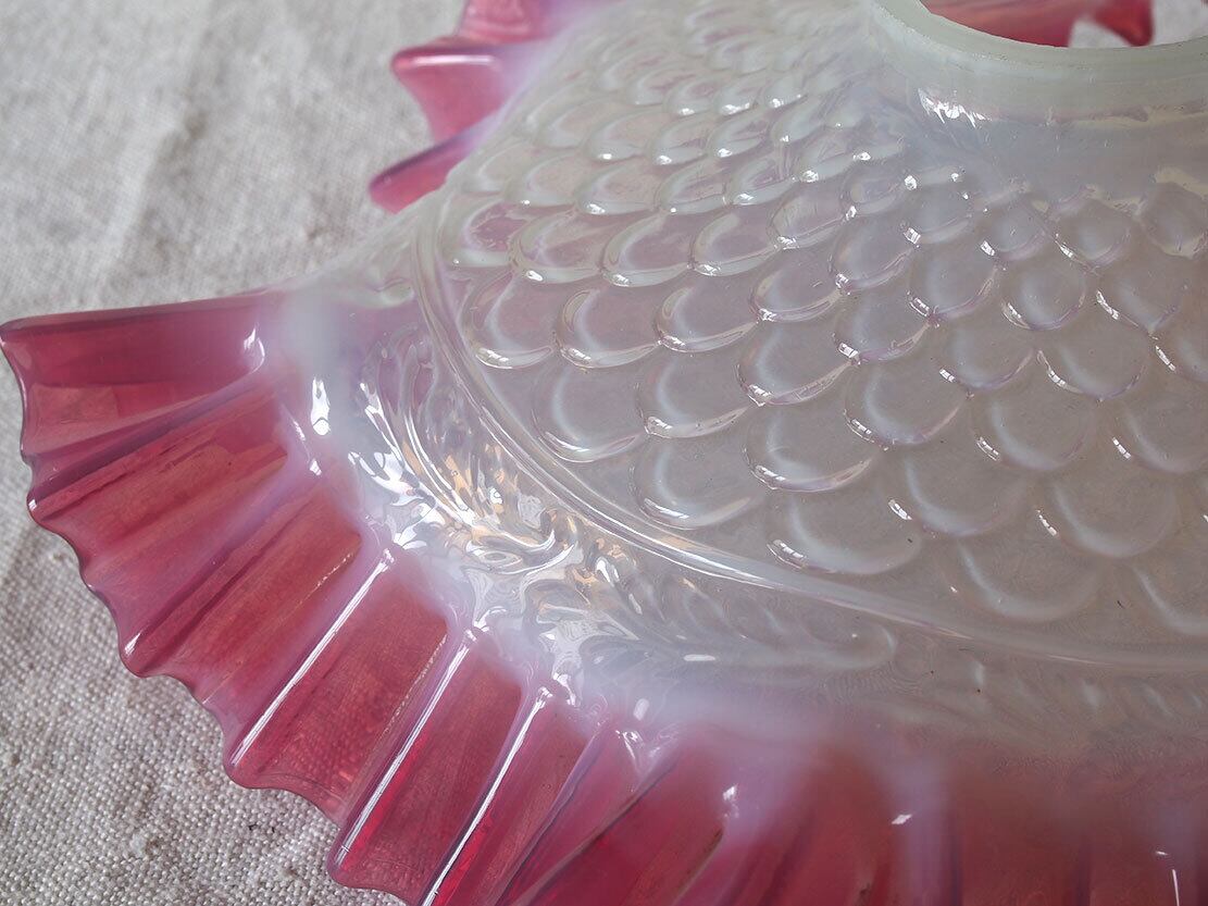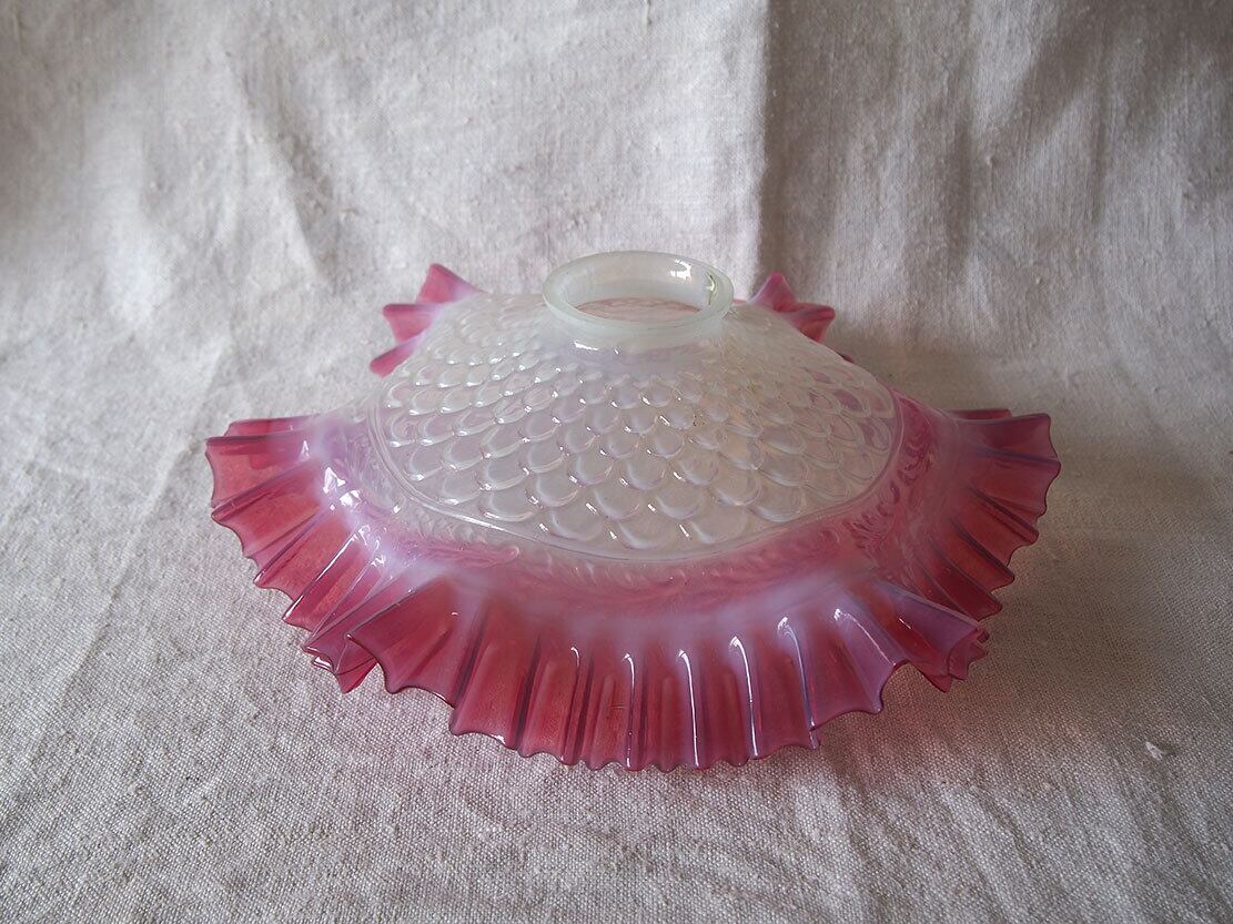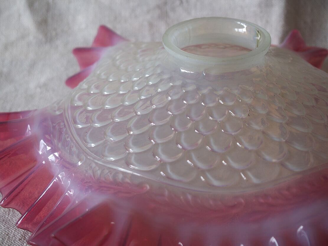 ヨーロッパのアンティーク市にて入手、1885年から1905年ぐらい。 美しいハンドメイドのガラスシェード。薄い乳白色にウロコのような模様、クランベリーピンクのフリルリム。金をガラスに混ぜて着色するとこのような色味がでるそうです。内側のピンクのフリルのあたりに気泡が1箇所あります。ダメージのない良い状態のものです。ソケット挿入口外径5.9cm、内径4.5cm、くびれ部外径5cm。日本の規格のソケットE26がご利用いただけます。参考資料、リメイクなどにどうぞ。