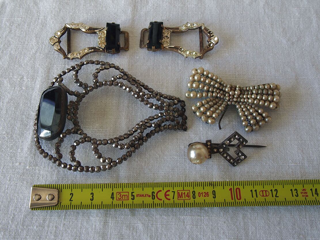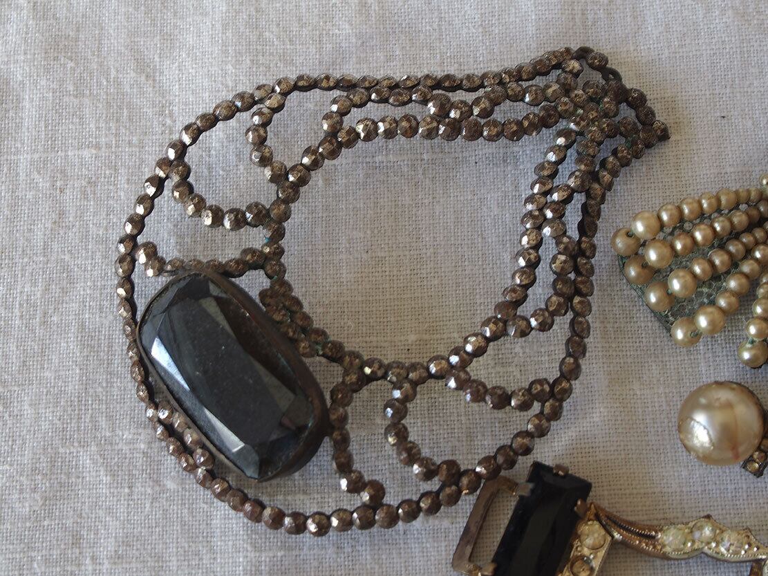 ヨーロッパのアンティーク市にて収集した小物。1930年前後。ご覧のようにどれもストーンの欠損などのダメージがあります。状態は写真をご確認ください。バラ売りはいたしません。デザインの参考、ドールの衣装、リメイクなどにご活用ください。