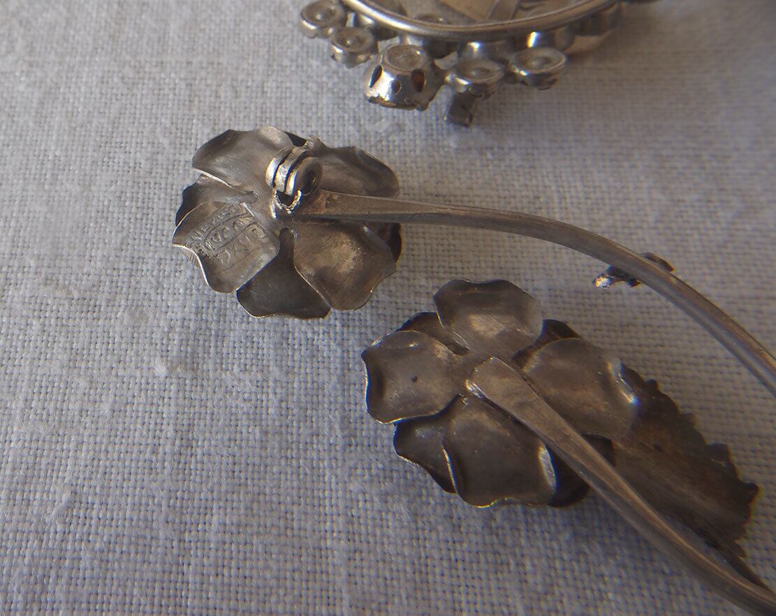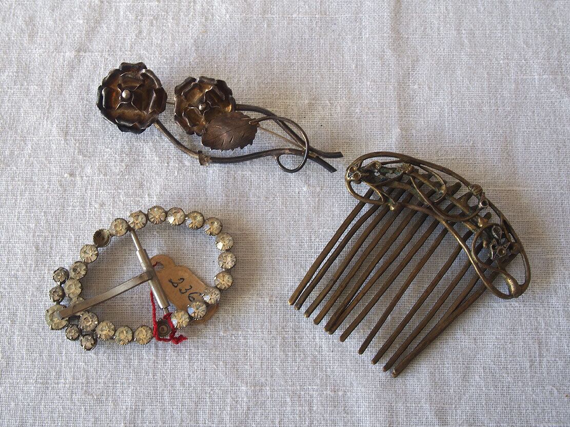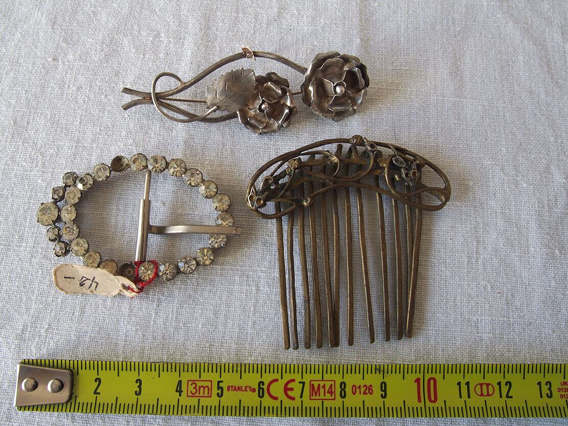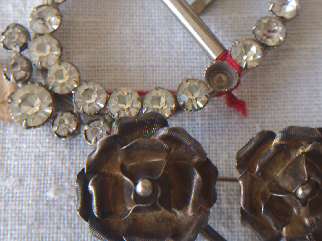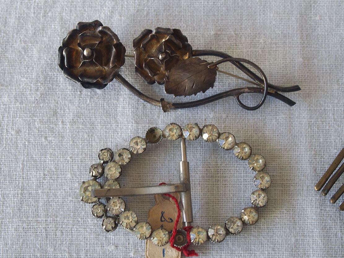 ヨーロッパのアンティーク市にて収集した小物。1930年前後。ご覧のようにどれもストーンの欠損などのダメージがあります。状態は写真をご確認ください。バラ売りはいたしません。デザインの参考、ドールの衣装、リメイクなどにご活用ください。