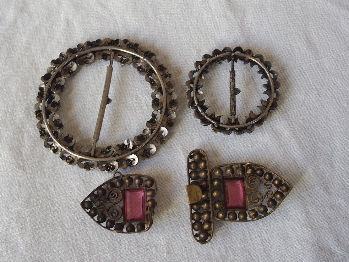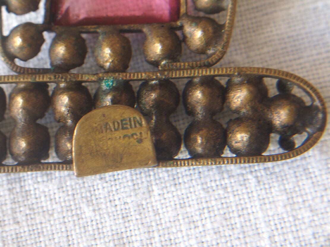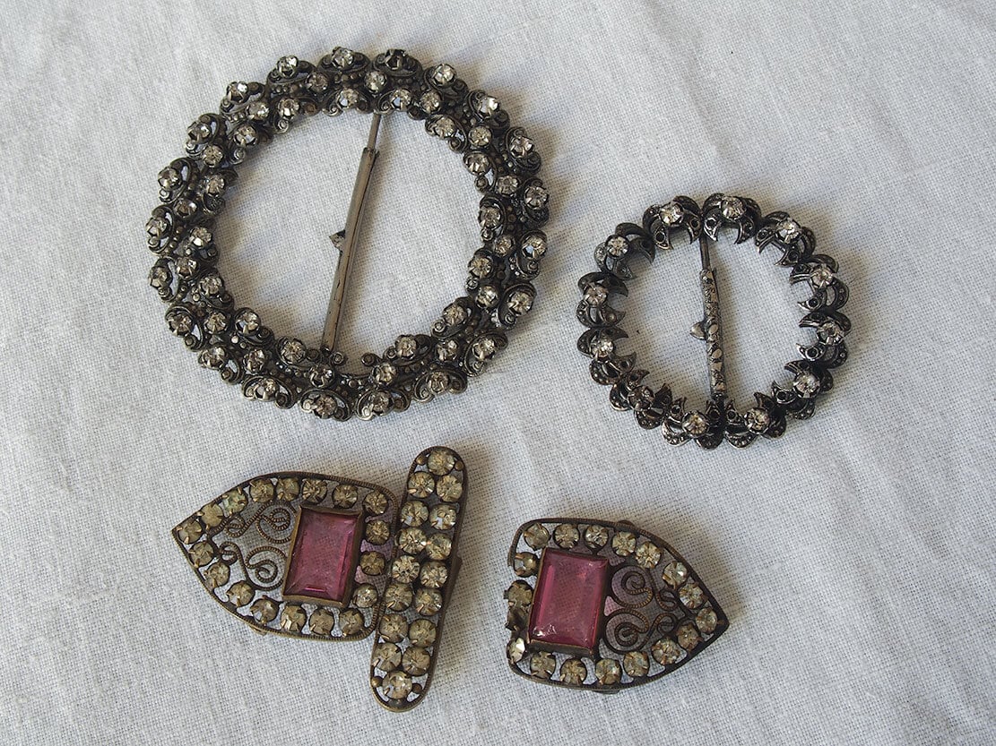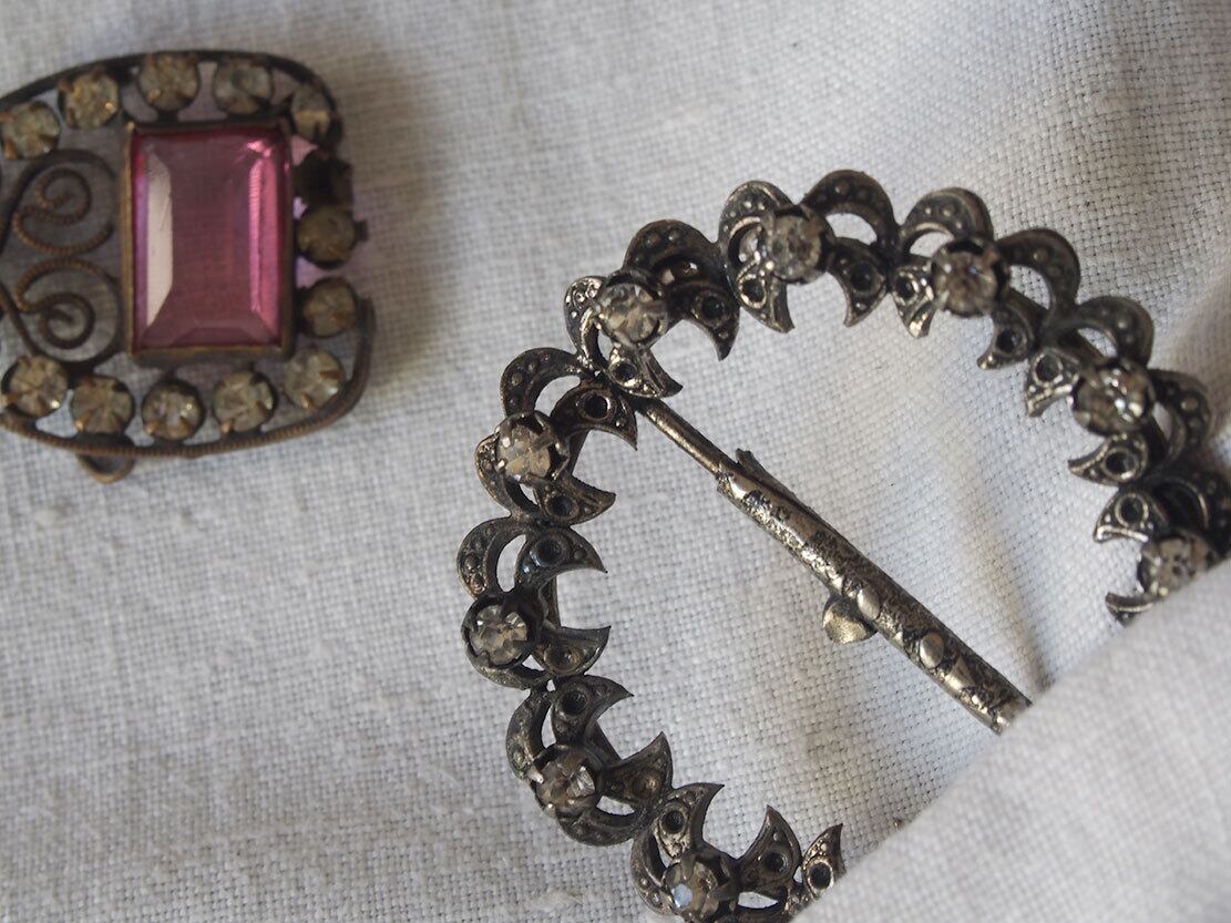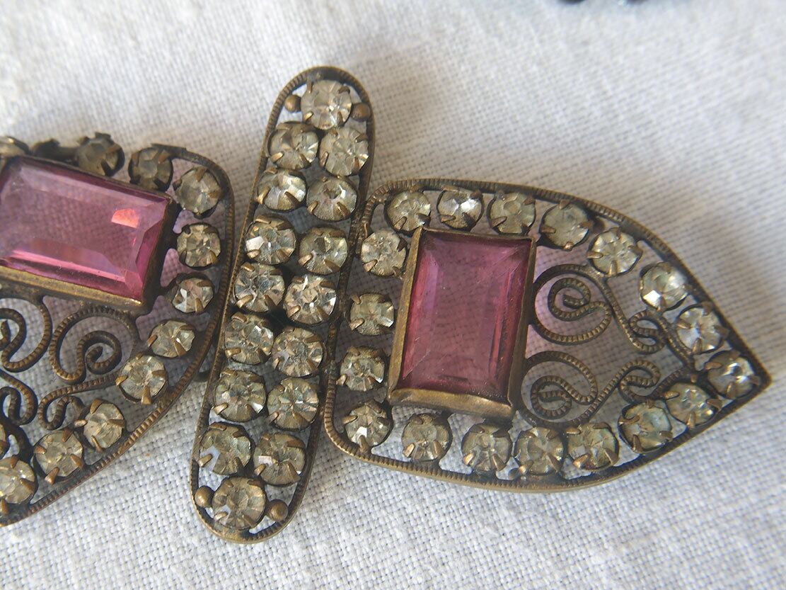 ヨーロッパのアンティーク市にて収集した小物。1930年前後。ご覧のようにどれもストーンの欠損などのダメージがあります。ピンクのストーンのバックルの裏に刻印があります、多分フランスだと思いますが、はっきりとは読み取ることができません。状態は写真をご確認ください。バラ売りはいたしません。デザインの参考、ドールの衣装、リメイクなどにご活用ください。