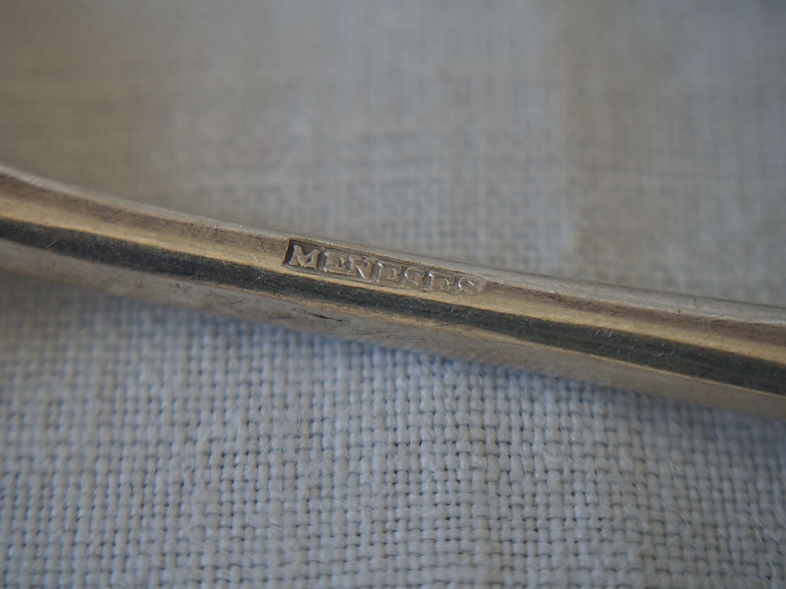 ヨーロッパのアンティーク市で入手。1920〜1940年代ぐらい。MENESES(スペイン)のシルバープレートスプーンのアイスクリームプーン5本セット。裏面にMENESESの刻印あり、1840年マドリードで創業のスペイン王室御用達銀製品ブランド。ハンドルに手彫りでイニシャルがあります。洗浄してあります、多少の傷やがあります。バラ売りはいたしません。*撮影の環境で少し黄味がかって見えますが、ごく普通のシルバーの色です。古い物なのでご覧のように傷などあります。