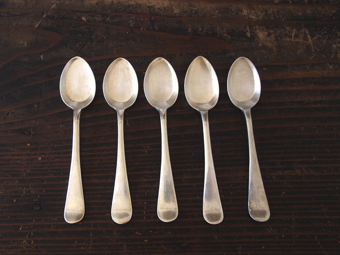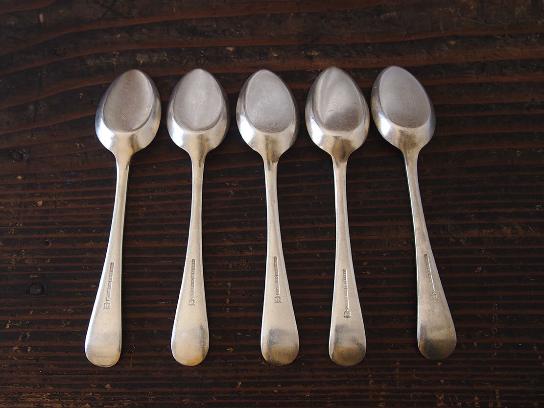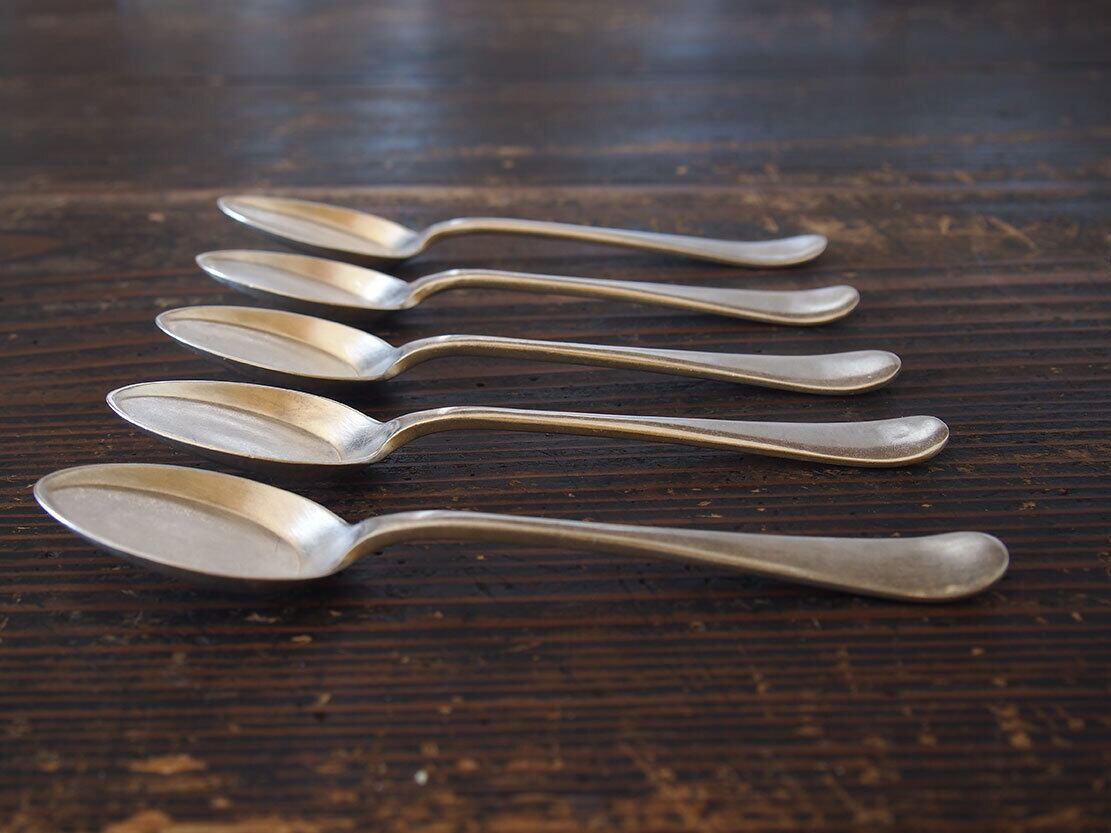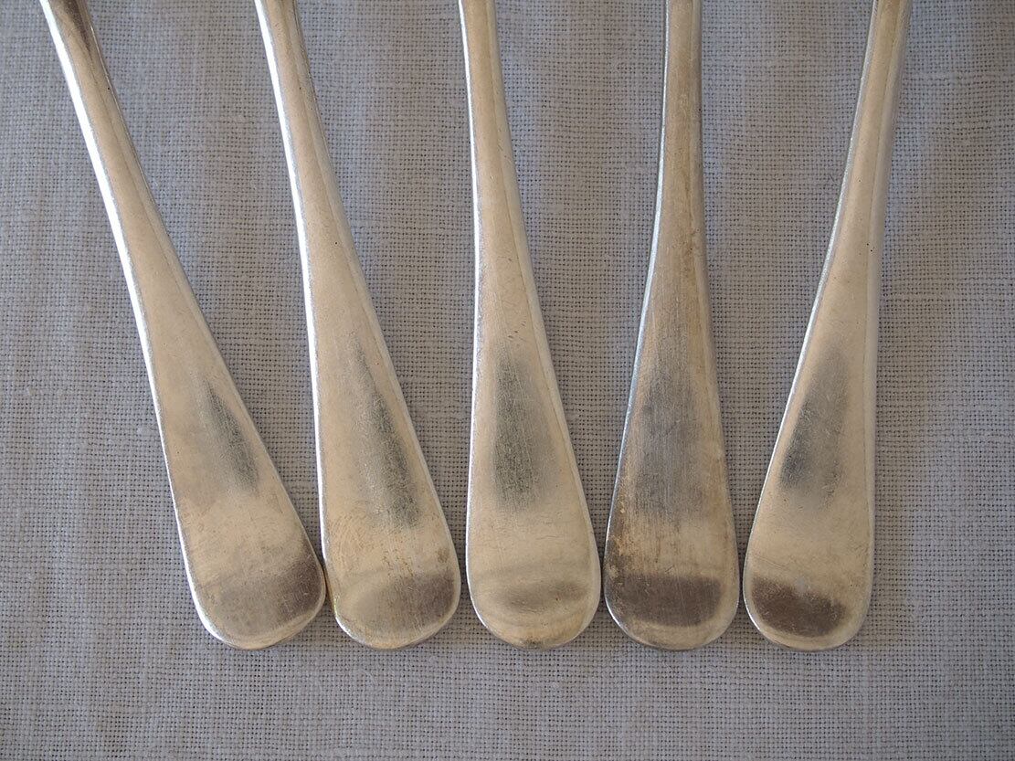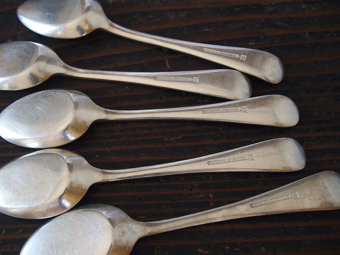 ヨーロッパのアンティーク市で入手。1920〜1940年代ぐらい。イギリスの老舗シルバー工房、1775年創業マッピン&ウェッブ MAPPIN & WEBBのティースプーン5本セット。裏面に刻印あり、MAPPIN & WEBB / PRINCE’S PLATE。洗浄してあります、多少の傷やがあります。*撮影の環境で少し黄味がかって見えますが、ごく普通のシルバーの色です。バラ売りはいたしません。古い物なのでご覧のように傷などあります。