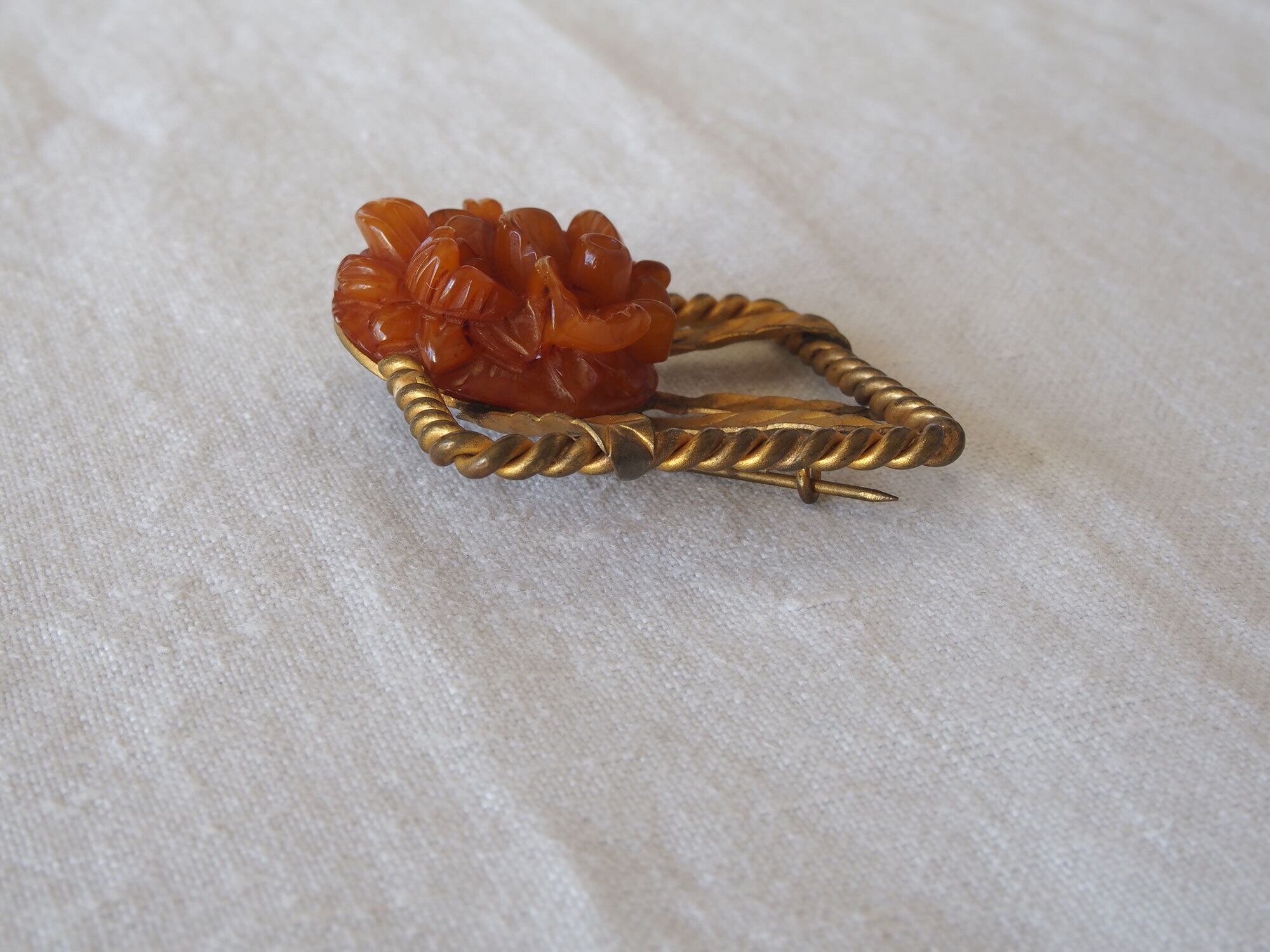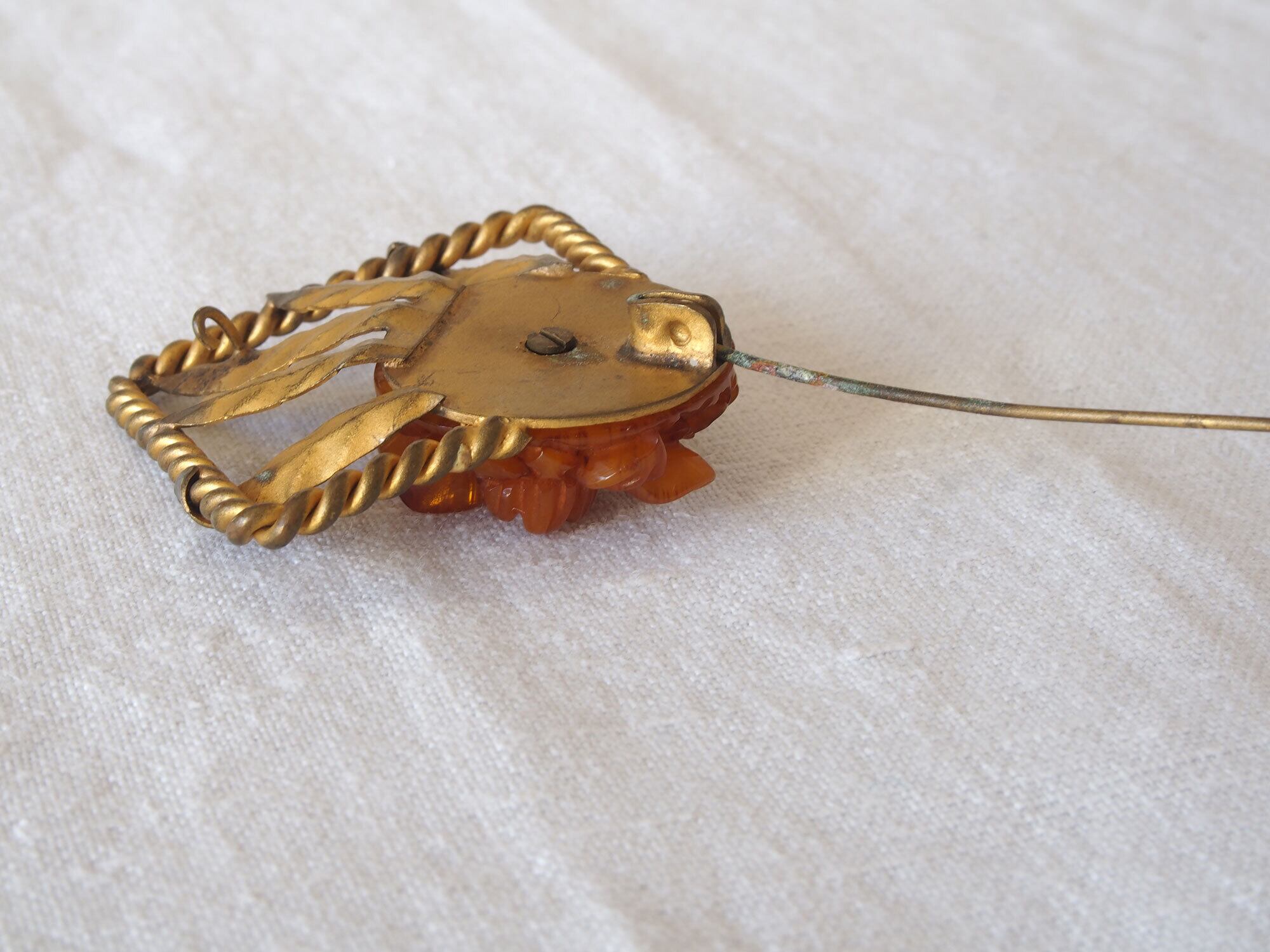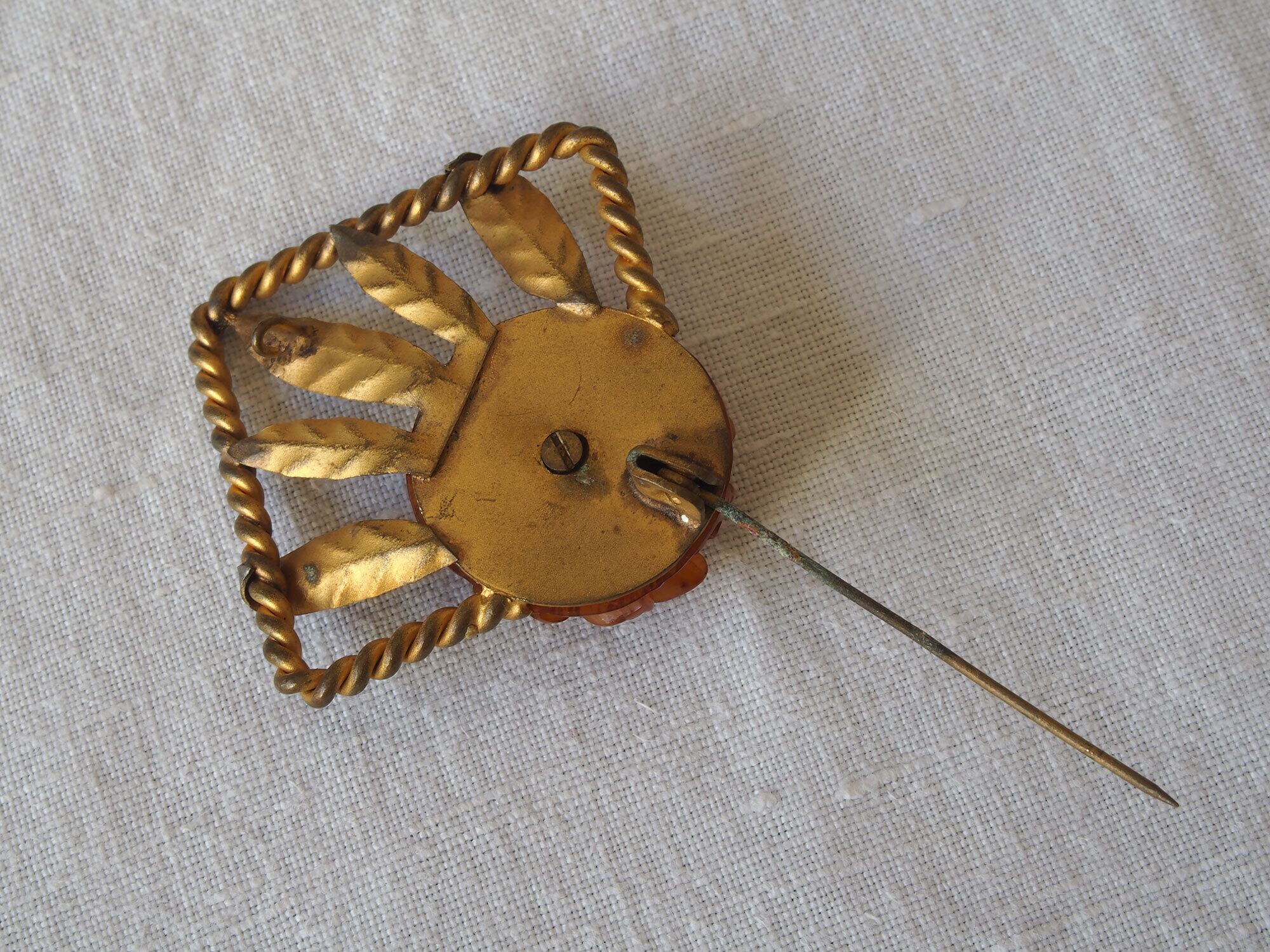 ヨーロッパのアンティーク市にて入手、1930〜40年代頃。カービング(彫刻)樹脂(ベークライト系)に真鍮のツイストフレーム。金属部分に多少の腐食はありますが、留め具の動きは良好です。ドールのアクセサリーなどに。
