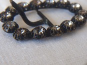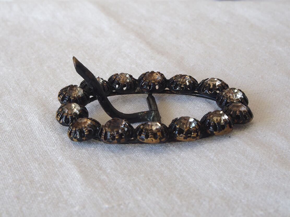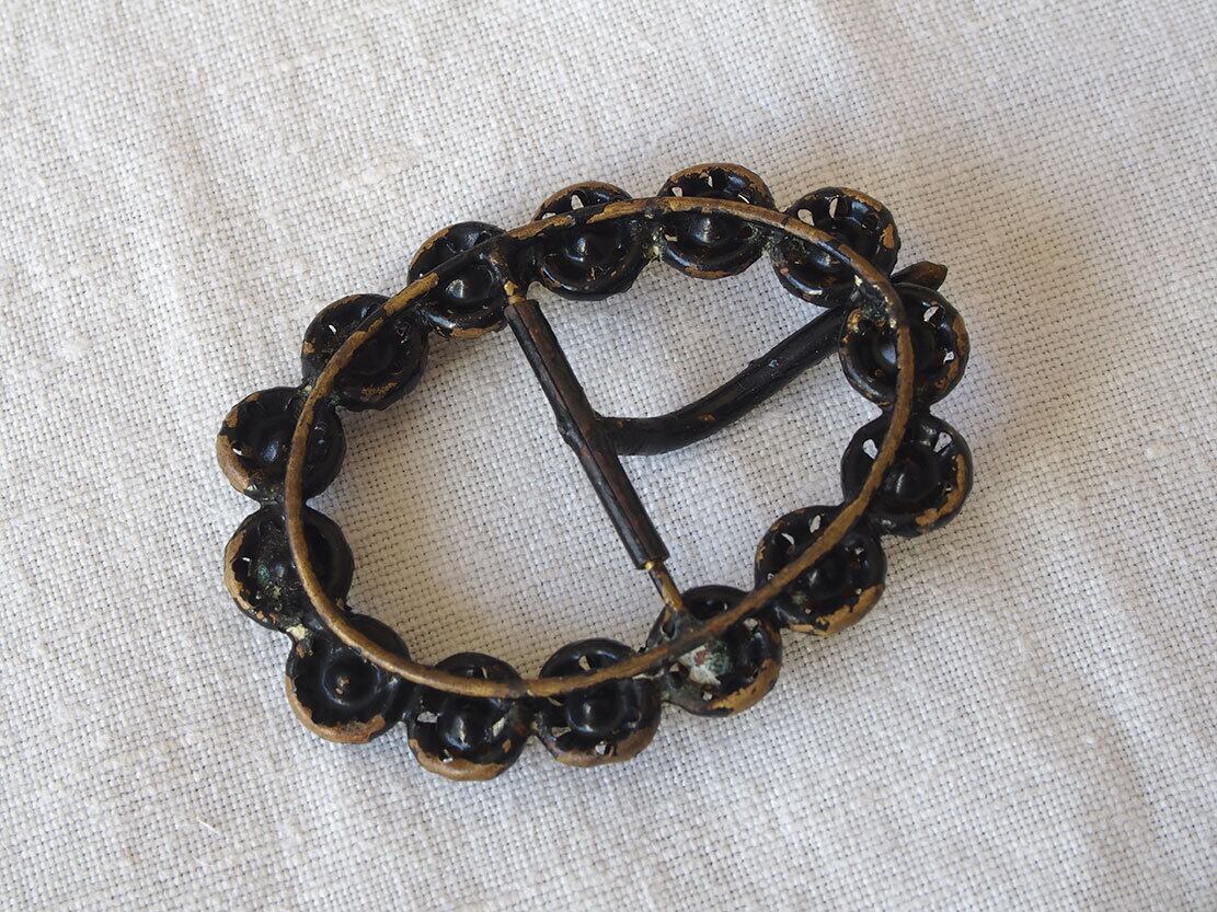 ヨーロッパのアンティーク市にて入手、1920〜30年代頃。アンティークのオーバル型ラインストーンのベルトバックル。オープンバック(Open-back)セッティングでラインストーンがつけられています。石の欠損はありませんが、ブラックの塗装のハゲがあります。アンティーク品のため、経年による風合いがあります。状態は写真をご確認ください。