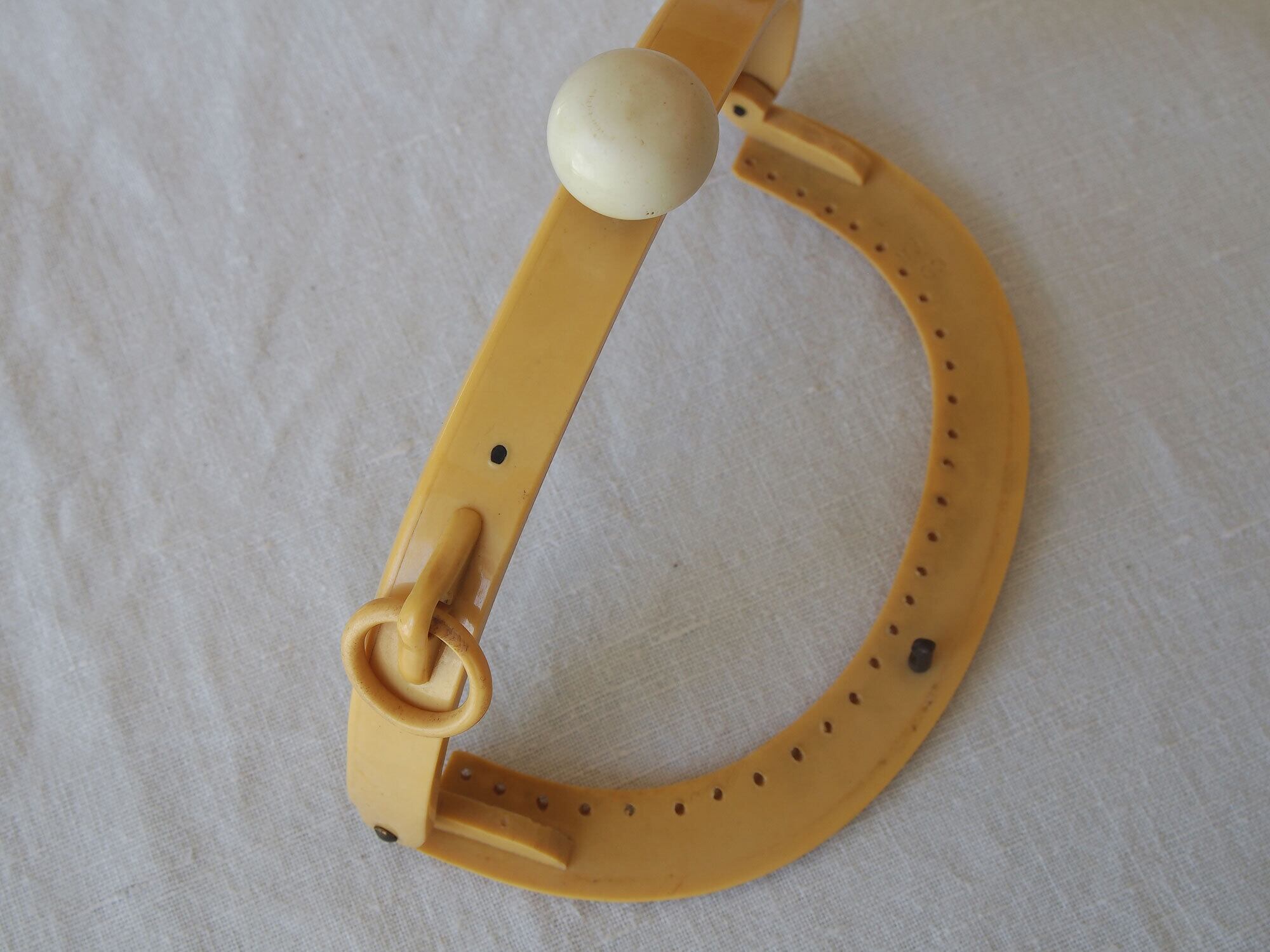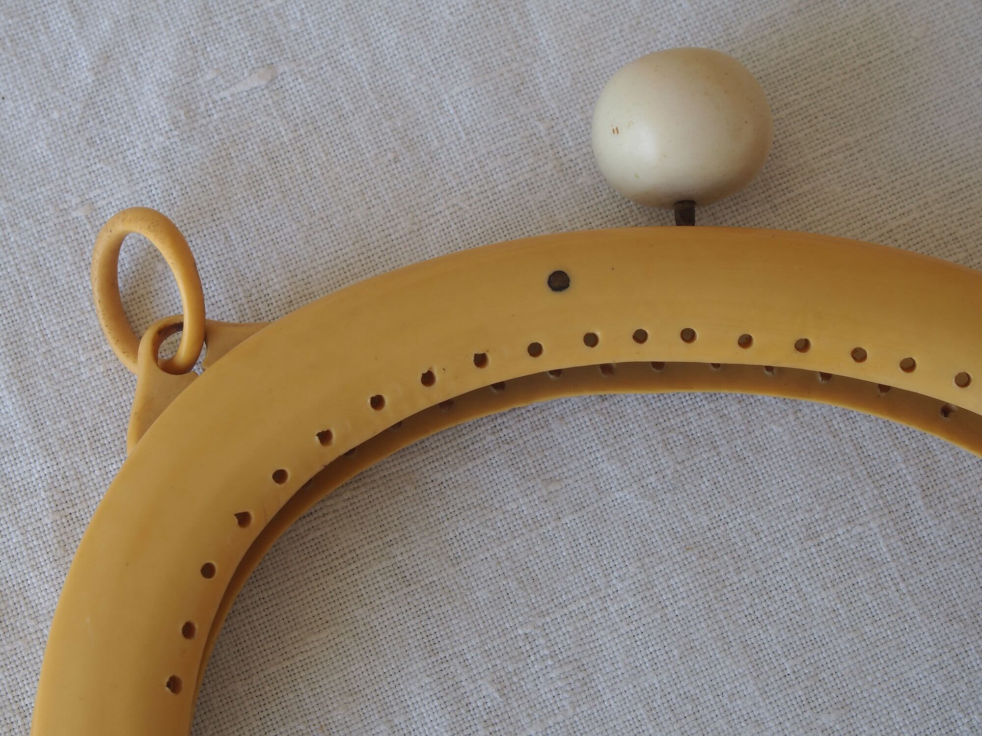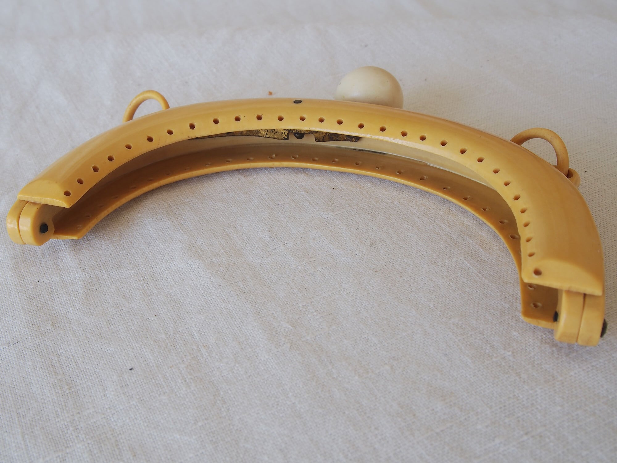 欧州のアンティーク市で入手。バターイエローのベークライト製のヴィンテージがまぐち口金です。アールデコ期(1930〜50年代)のものと思われます。小さなハンドバッグやコインパースに使われていた口金で、口金にある小さな穴に袋(布、クロシェなど)を留めつけてバッグを作るタイプです。留め具は丸玉のクラシックなデザイン。口金の開閉は良好です。詳細は写真でご確認いただけます。古い物だと言う事をご理解の上のご入札をお願い致します。材質及び年代の判定は困難な場合があります、差異についてはあらかじめご了承下さい。こだわりのバッグ制作に、ヴィンテージ着物とも相性が良いと思います。アンティークドールの小物などにも。