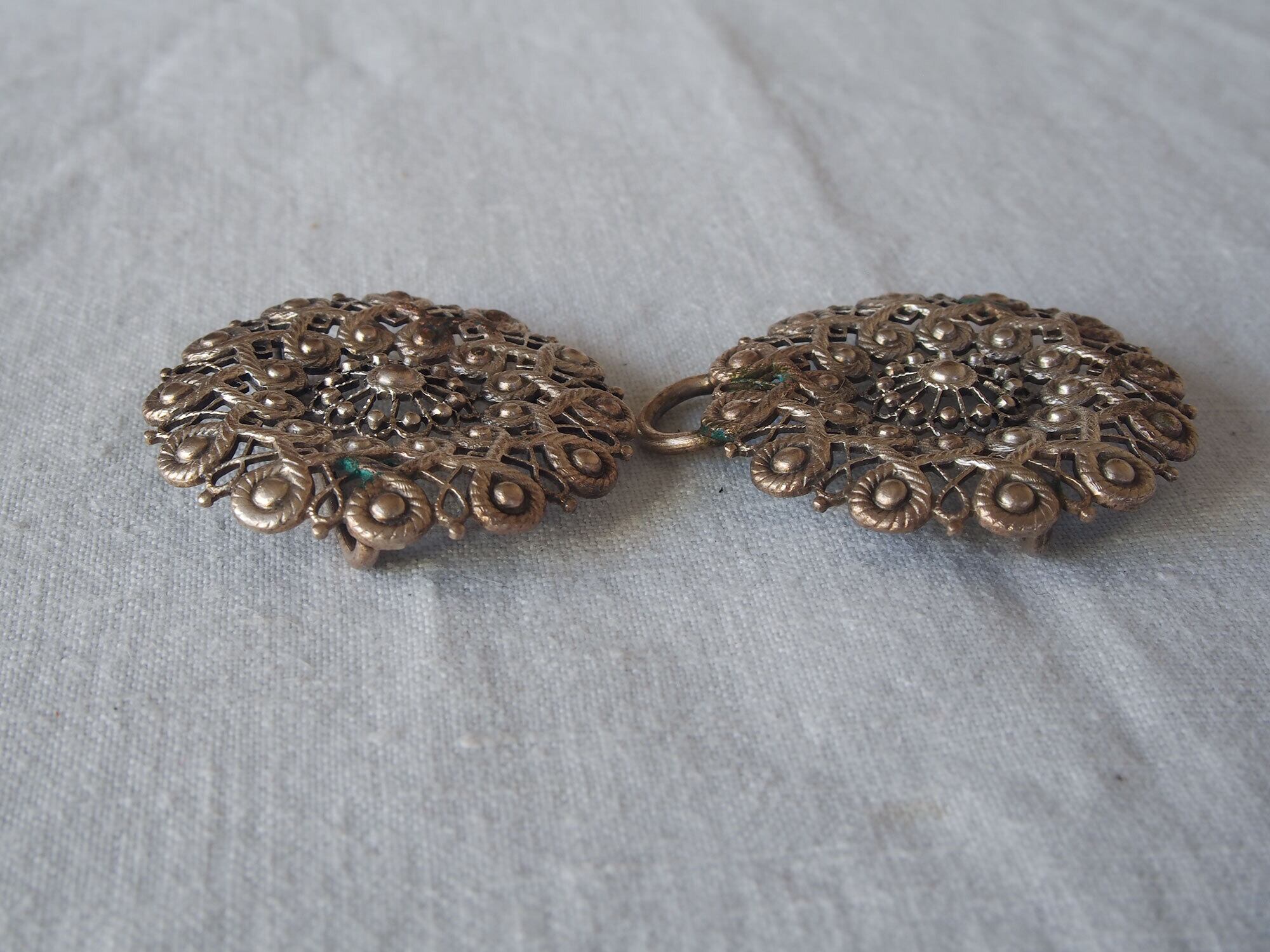 ヨーロッパのアンティーク市にて入手、1920〜1930年代頃。アンティークのフィリグリー風デザインのベルトバックル。セパレート型バックルで、左右のパーツにベルトを留めつけて利用します。温かみのあるシルバー色です。アンティーク品のため、経年による風合いがあります。状態は写真をご確認ください。