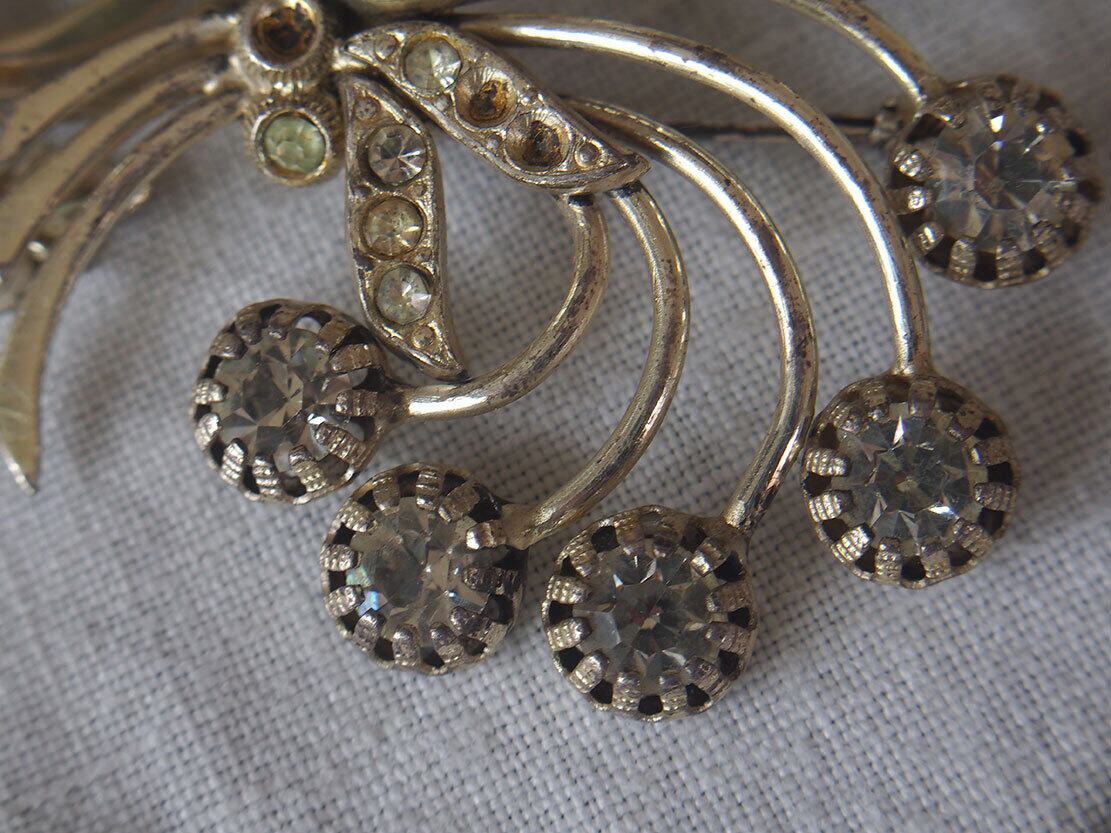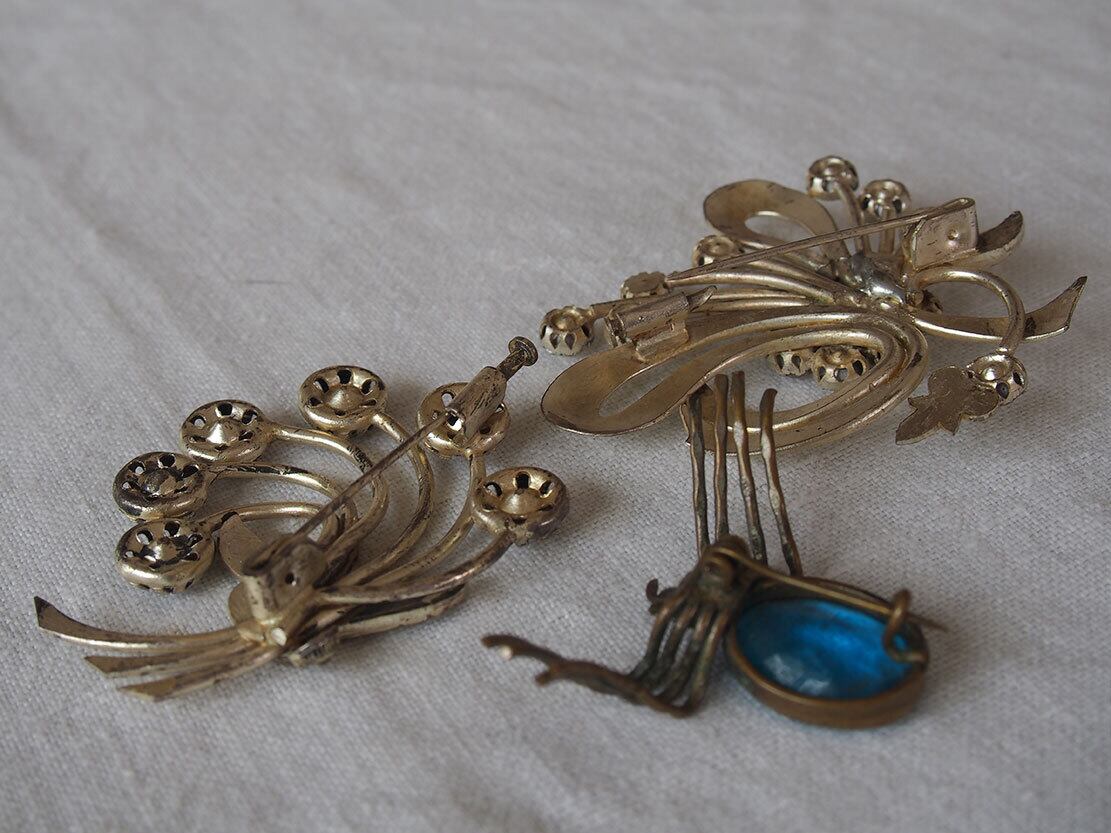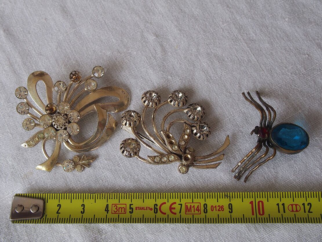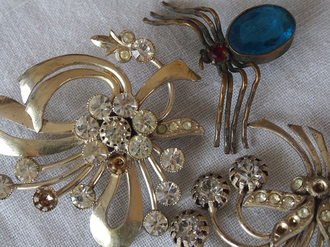 ヨーロッパのアンティーク市にて収集した小物。1930年前後。ご覧のようにどれもストーンの欠損などのダメージがあります。シルバー色のブローチ2点は留め具の形が横に通った筒状のヒンジです。蜘蛛のブローチが一番古いものです。状態は写真をご確認ください。バラ売りはいたしません。デザインの参考、ドールの衣装、リメイクなどにご活用ください。
