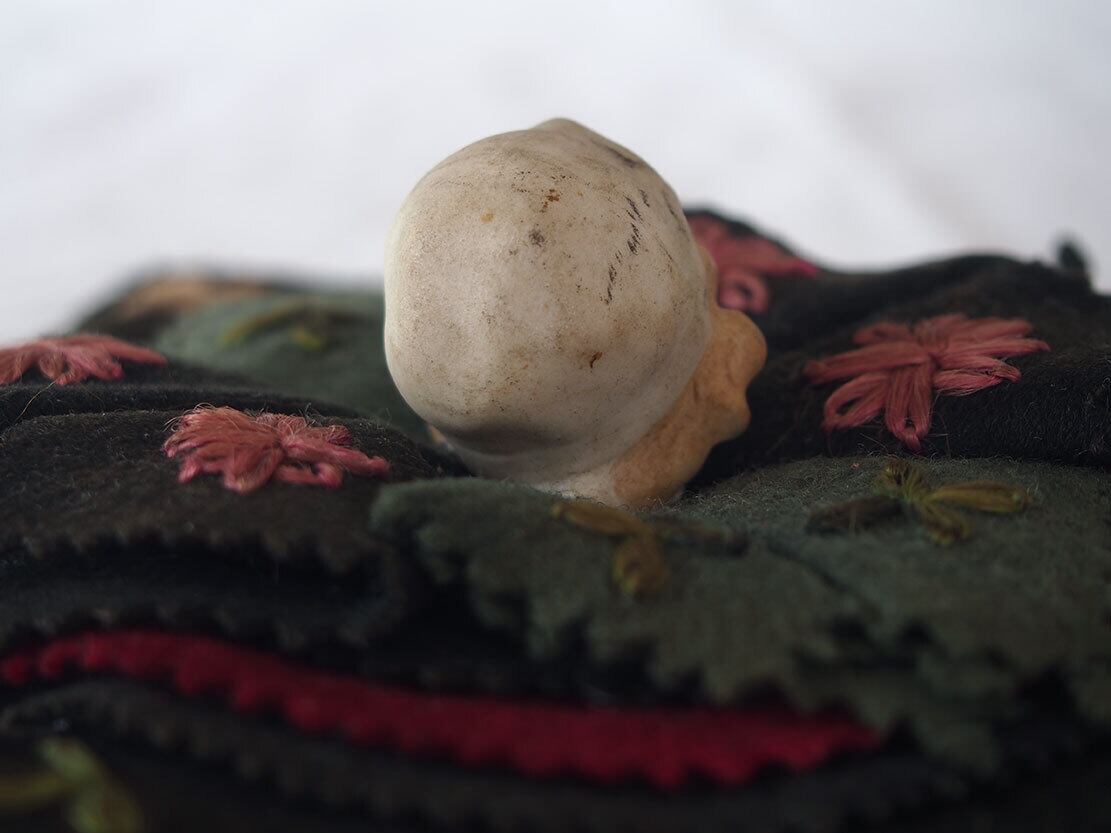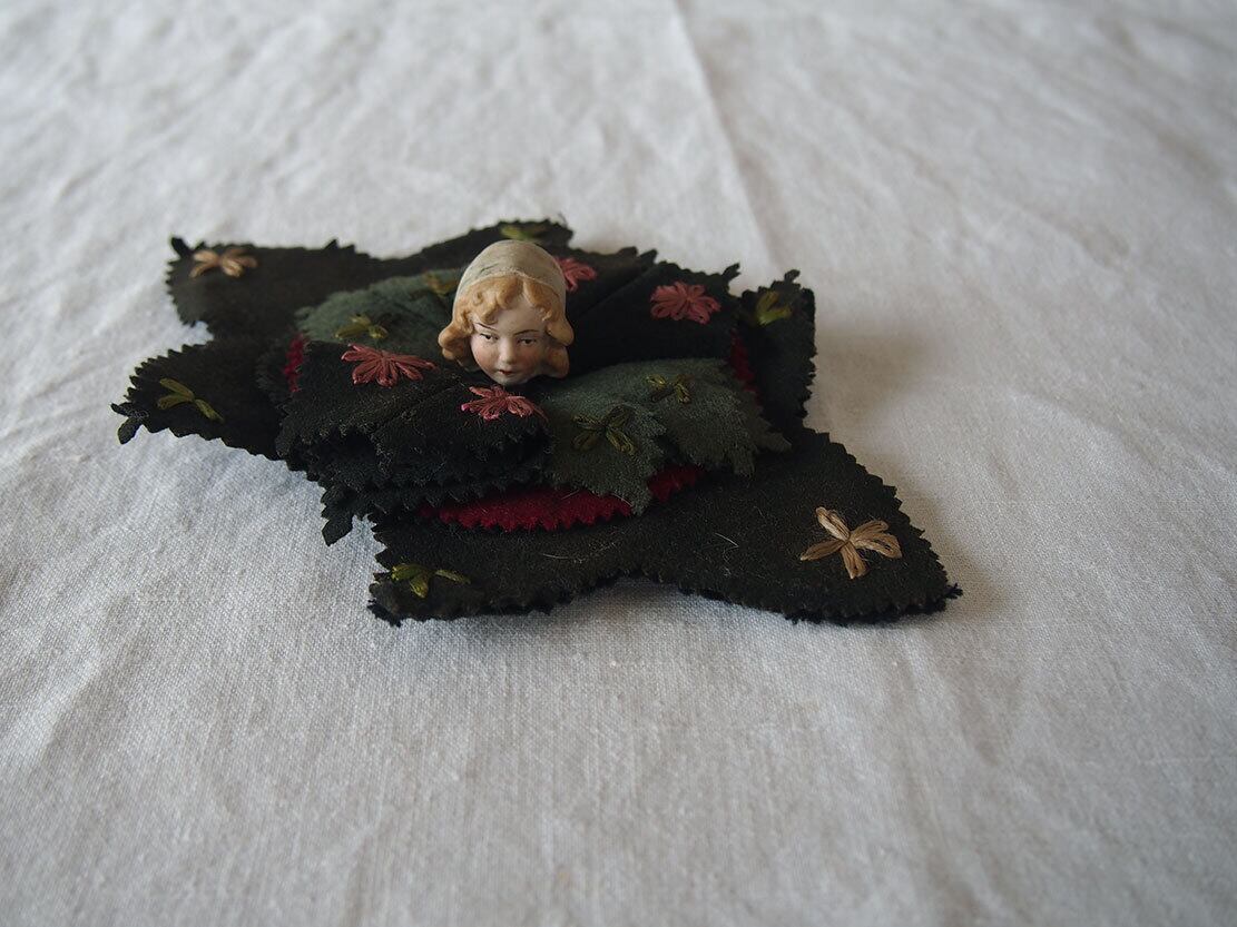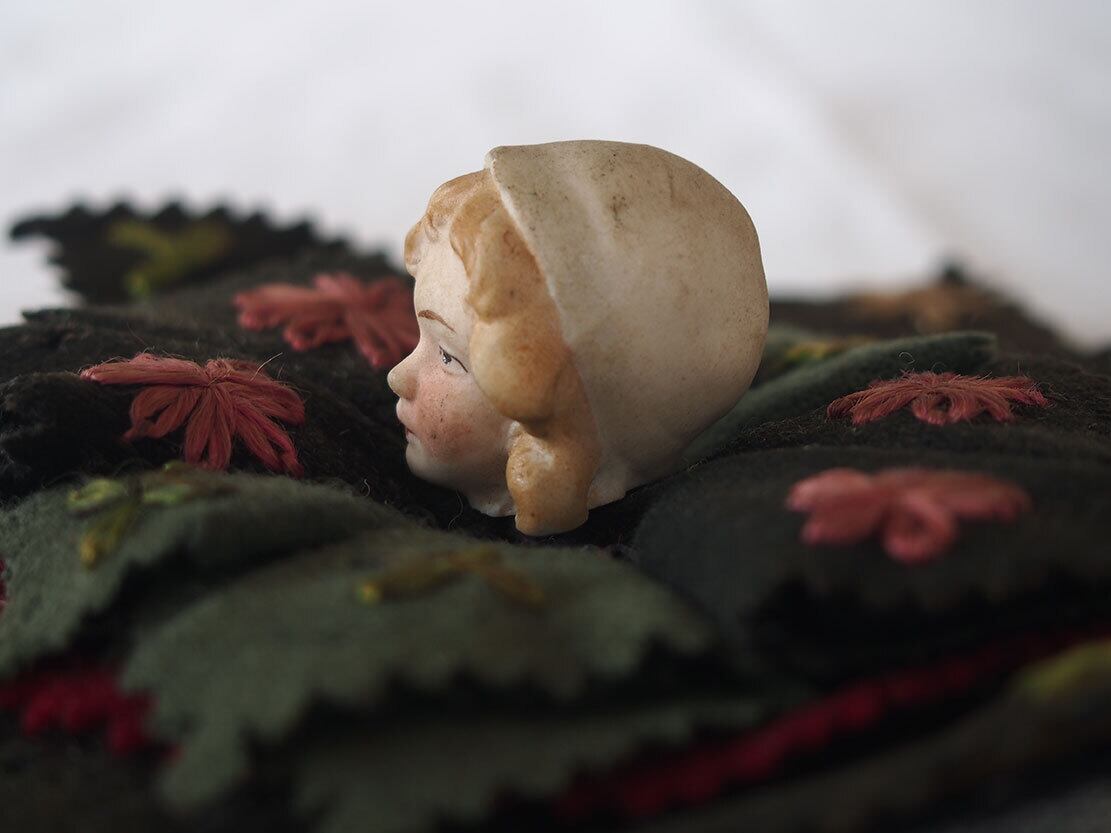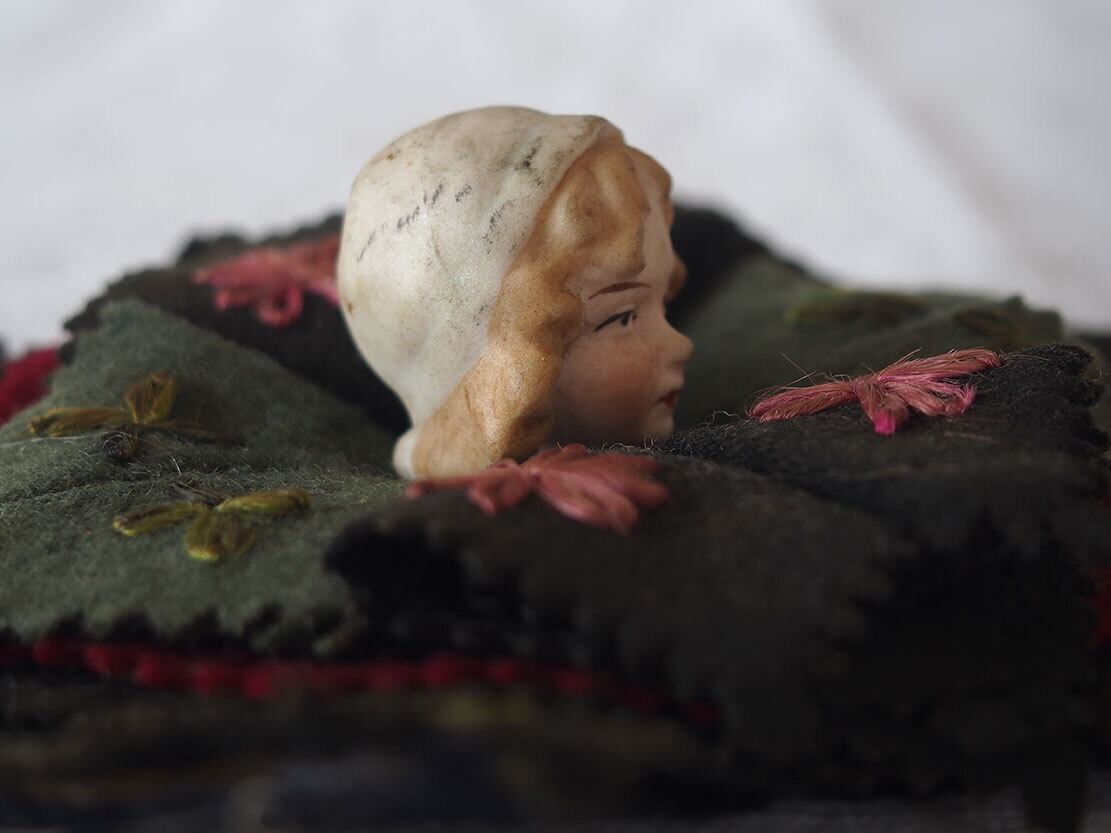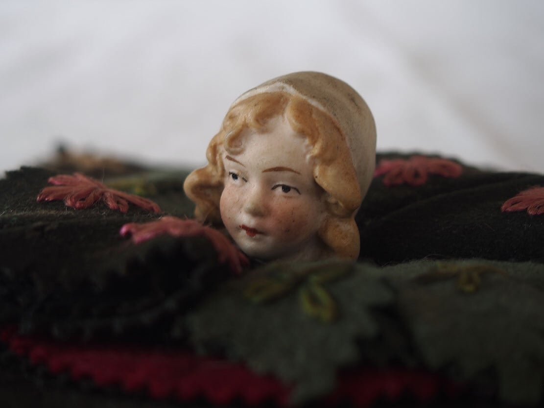 欧州のアンティーク市で入手。ドールヘッド付きのピンクッションまたは小物入れの蓋として手作りされた物だとおもわれます。1900年前後〜1920年頃。フェルトに痛みが少々あります。詳細は写真でご確認いただけます。ブラッシング程度の手入れをしてあります。古い物だと言う事をご理解の上のご入札をお願い致します。材質及び年代の判定は困難な場合があります、差異についてはあらかじめご了承下さい。